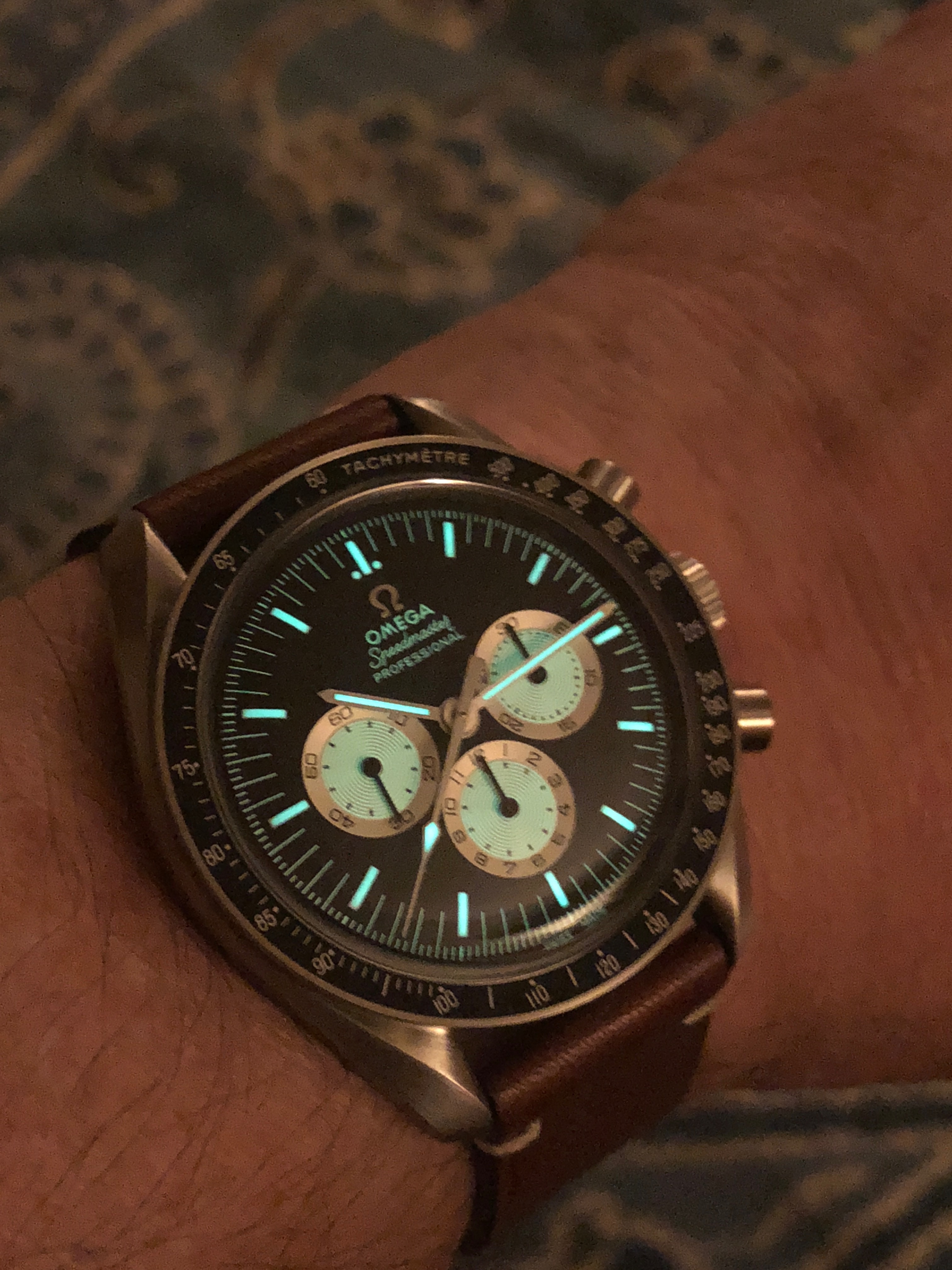 Then there's the very generous application of Super-LumiNova, at least in terms of "real estate." We're talking about the chapter ring, all dial text and finally, the sub-dials. I never did understand why the typical chronograph doesn't use lume on it's sub-dial hands (one reason I often activate the Chronograph complication in sync with actual time) so the Speedy Tuesday presents an alternate solution.