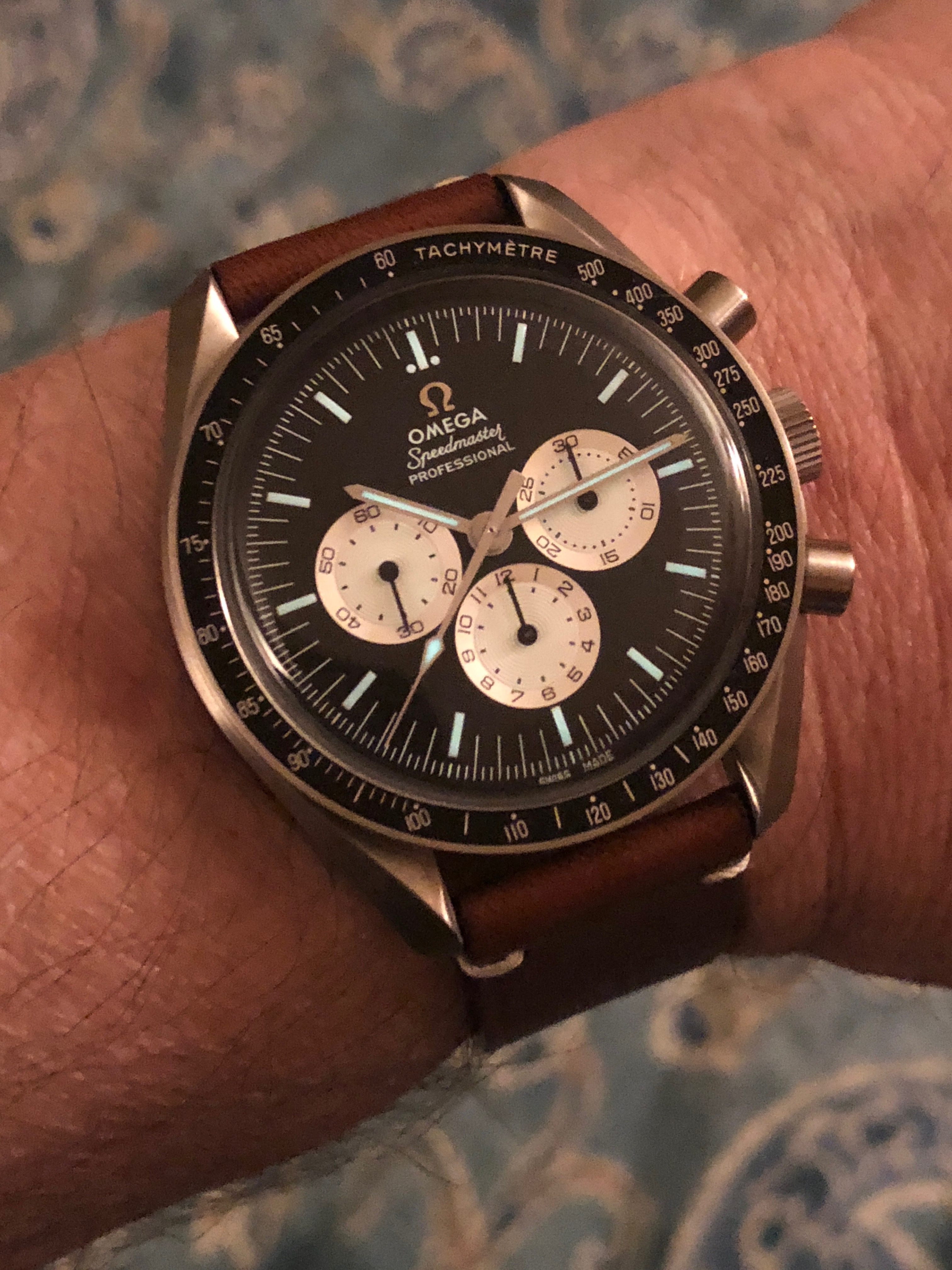 Like all other members, I had ample time to plan some alternatives to the provided straps and the 1171/633 "production NOS" was high on my list. I had pre-ordered one through my personal watchmaker and while waiting for his return, I made due with a $15 black NATO. This actually turned out to be a very nice combo! The fact is that I'd rather draw attention to the details of the watch, rather than risk the distraction of a "bright" strap. But it was only when the 1171/633* was finally mounted on my Speedy Tuesday that I knew I had found the perfect match ...!