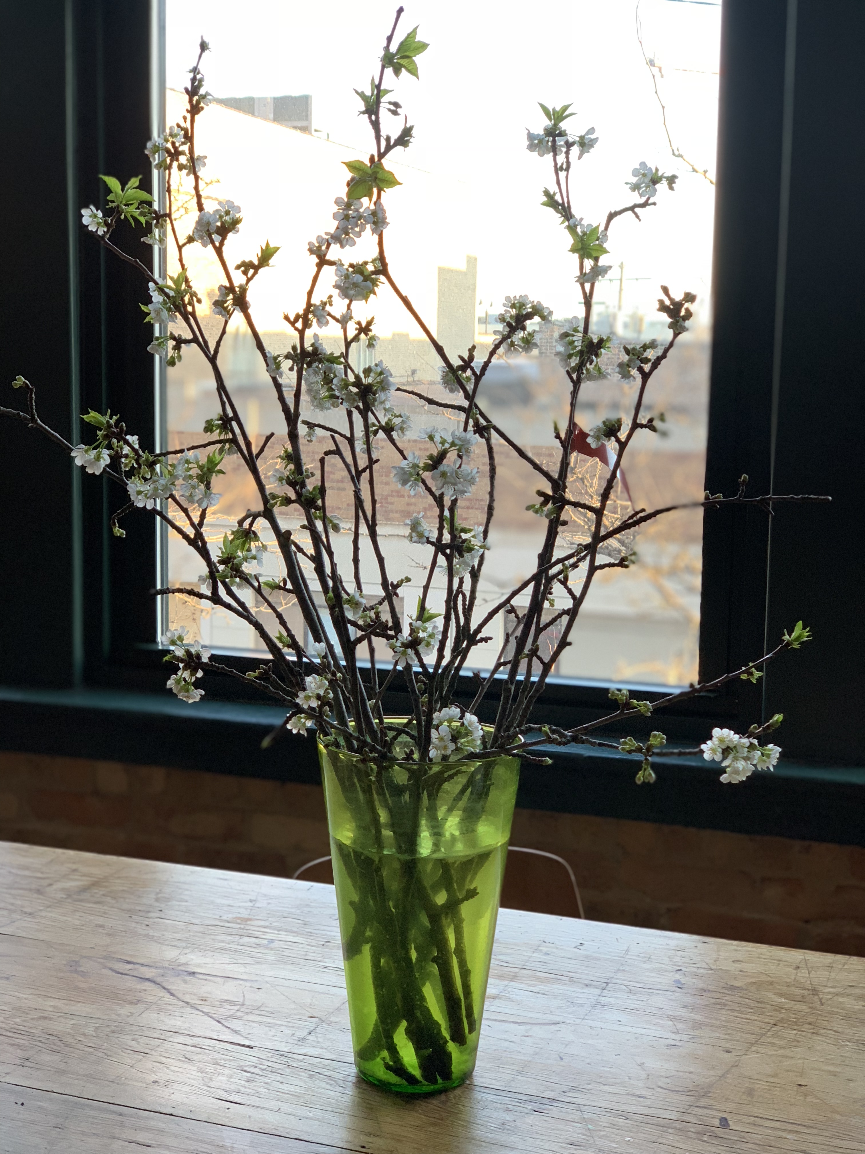 We only have buds on our trees at this point, if that. We have one tree out front that buds first every year, and it's my yearly spring ritual to stand under it the first warm day and just listen...