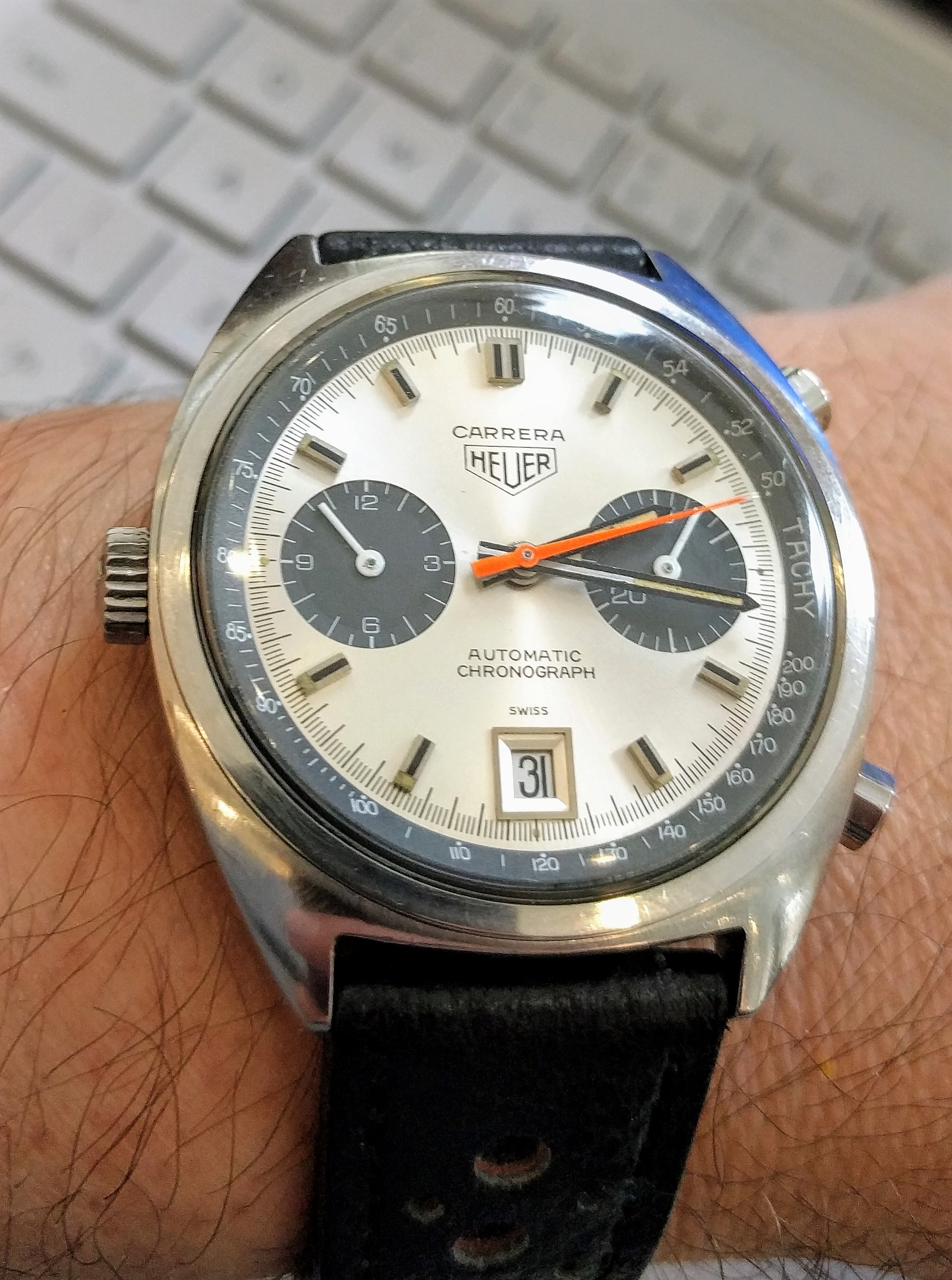 路Got my new Carrera 1153S home and am now wondering if I like the Corfam style strap I bought for it - I tried a custom Toshi strap that I got for a Speedmaster Mark II with racing dial, and I rather like it on the 1153...