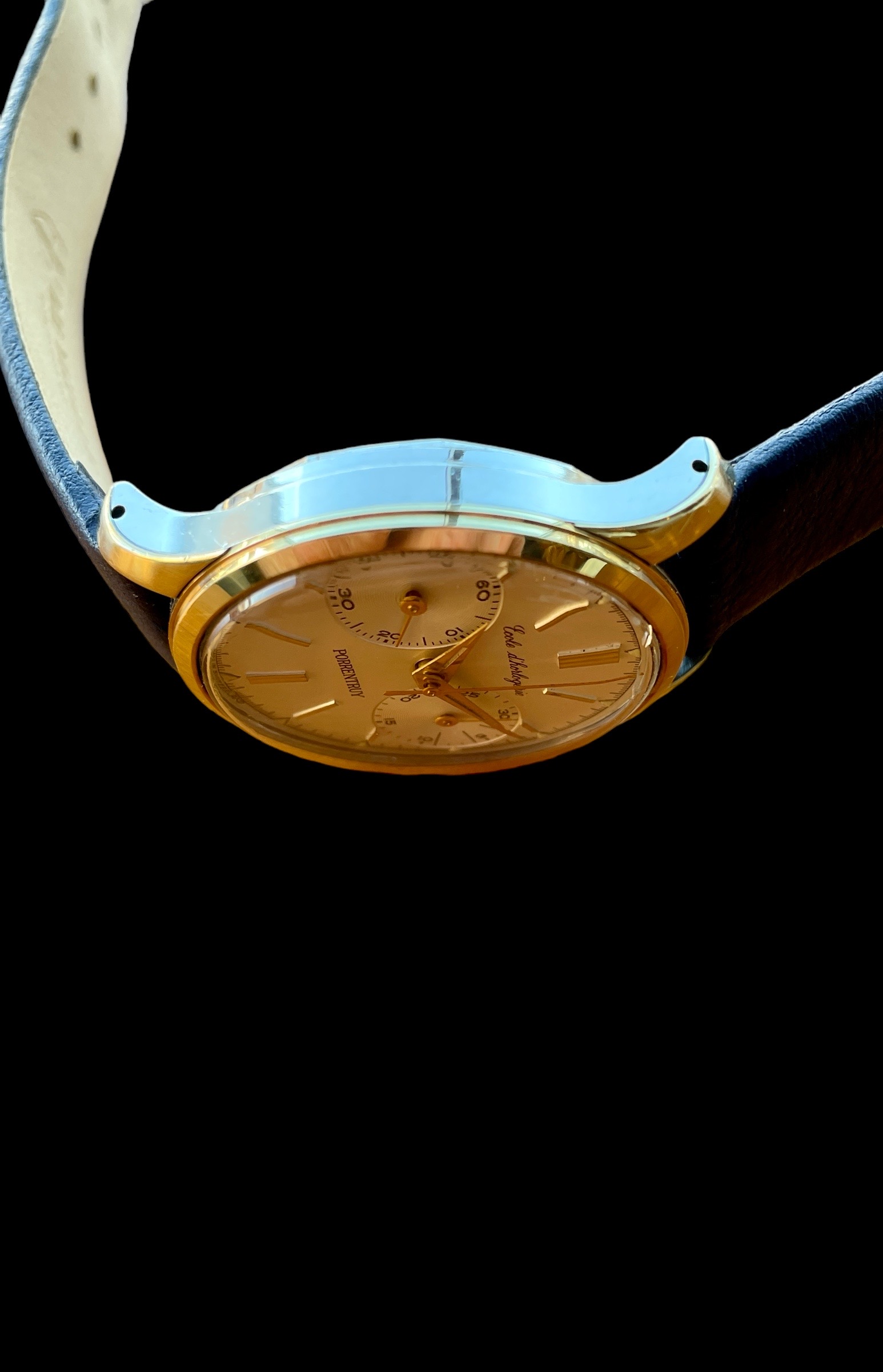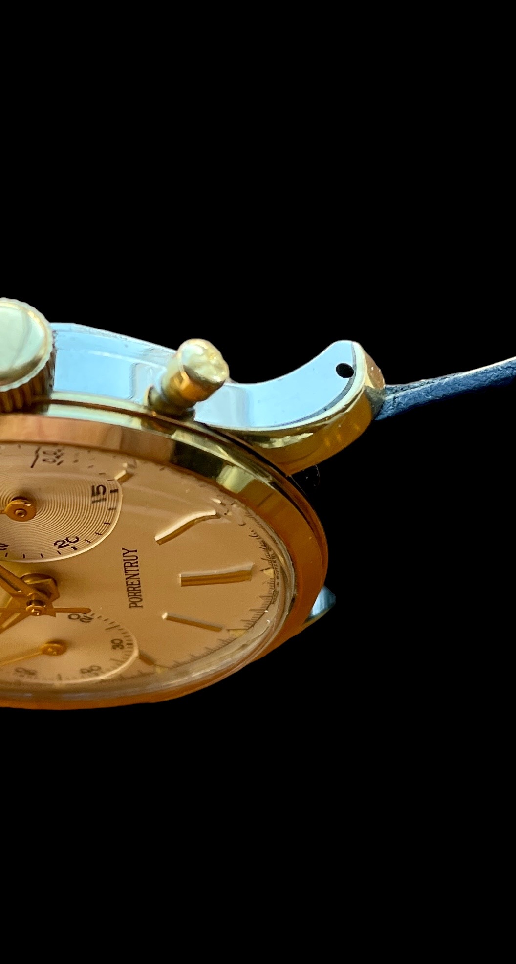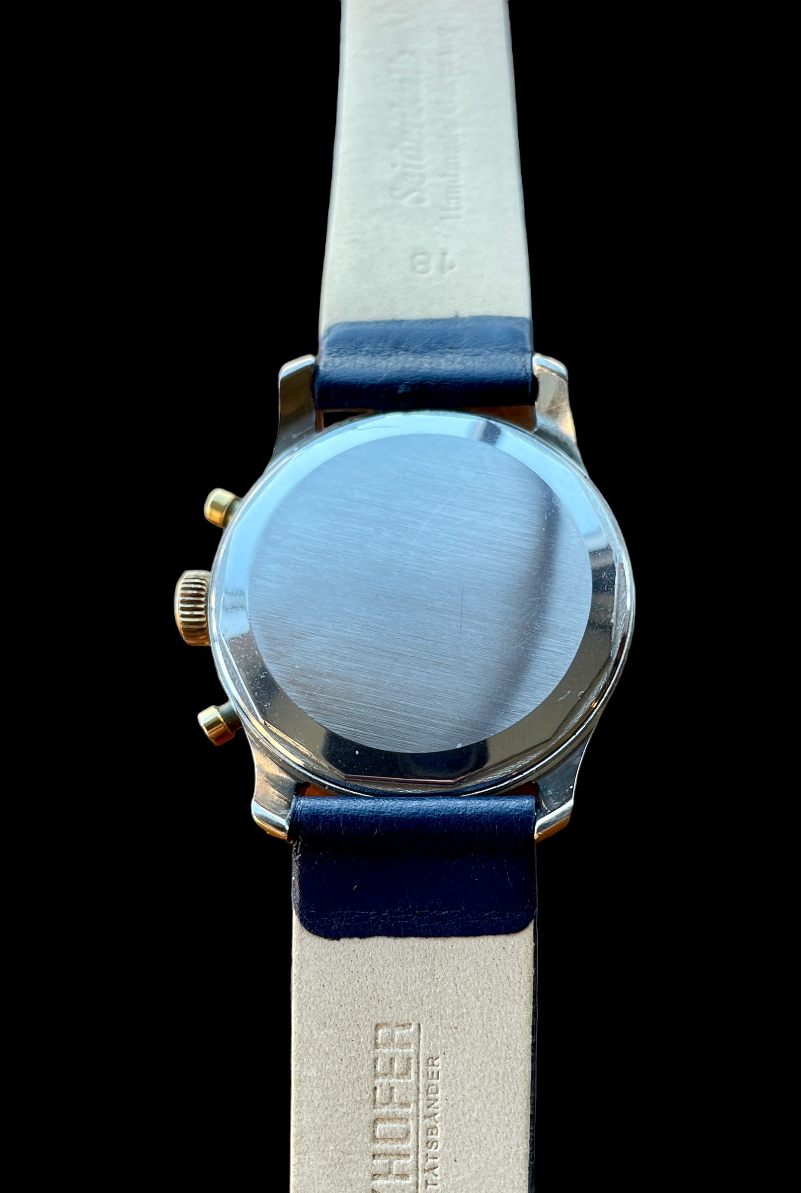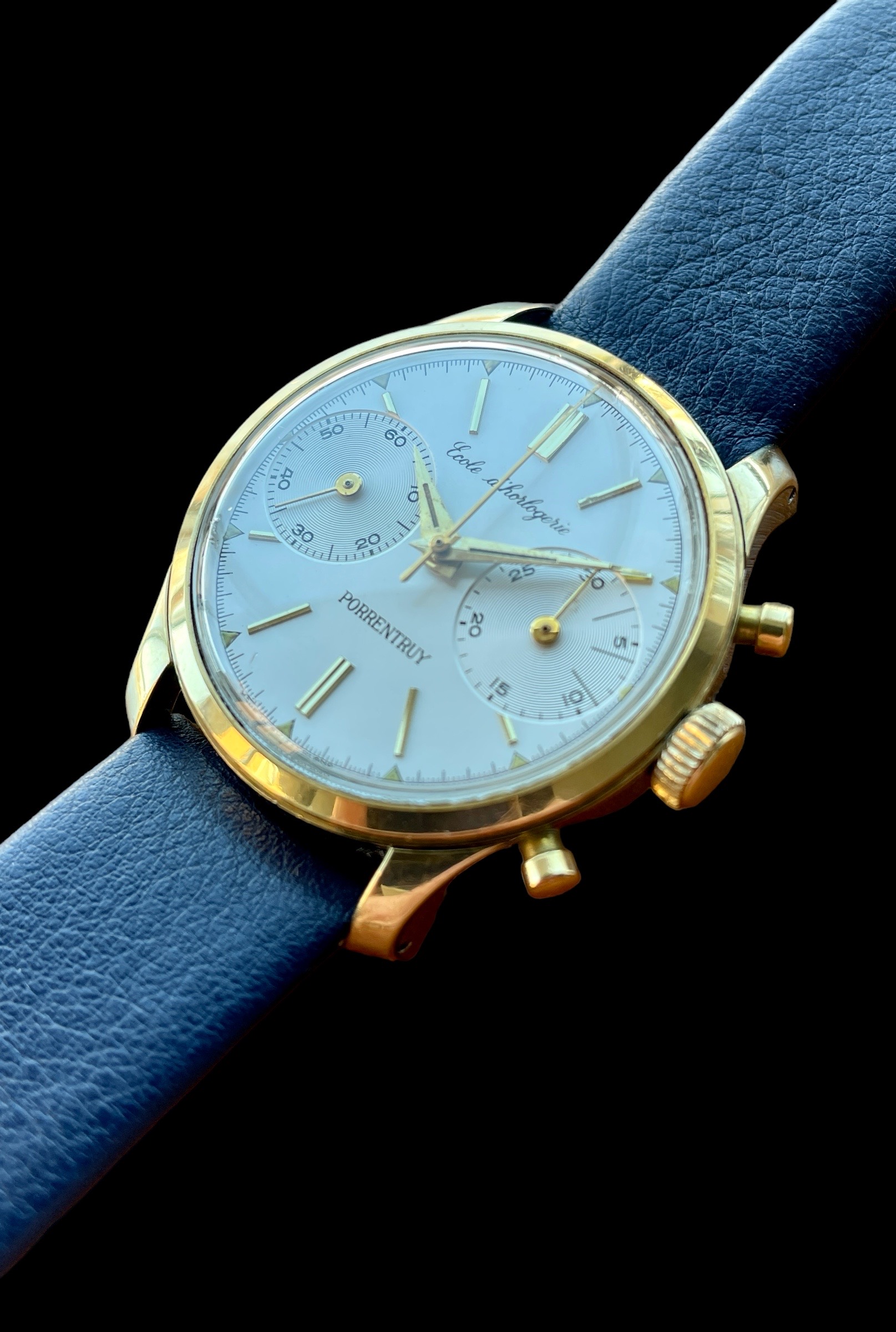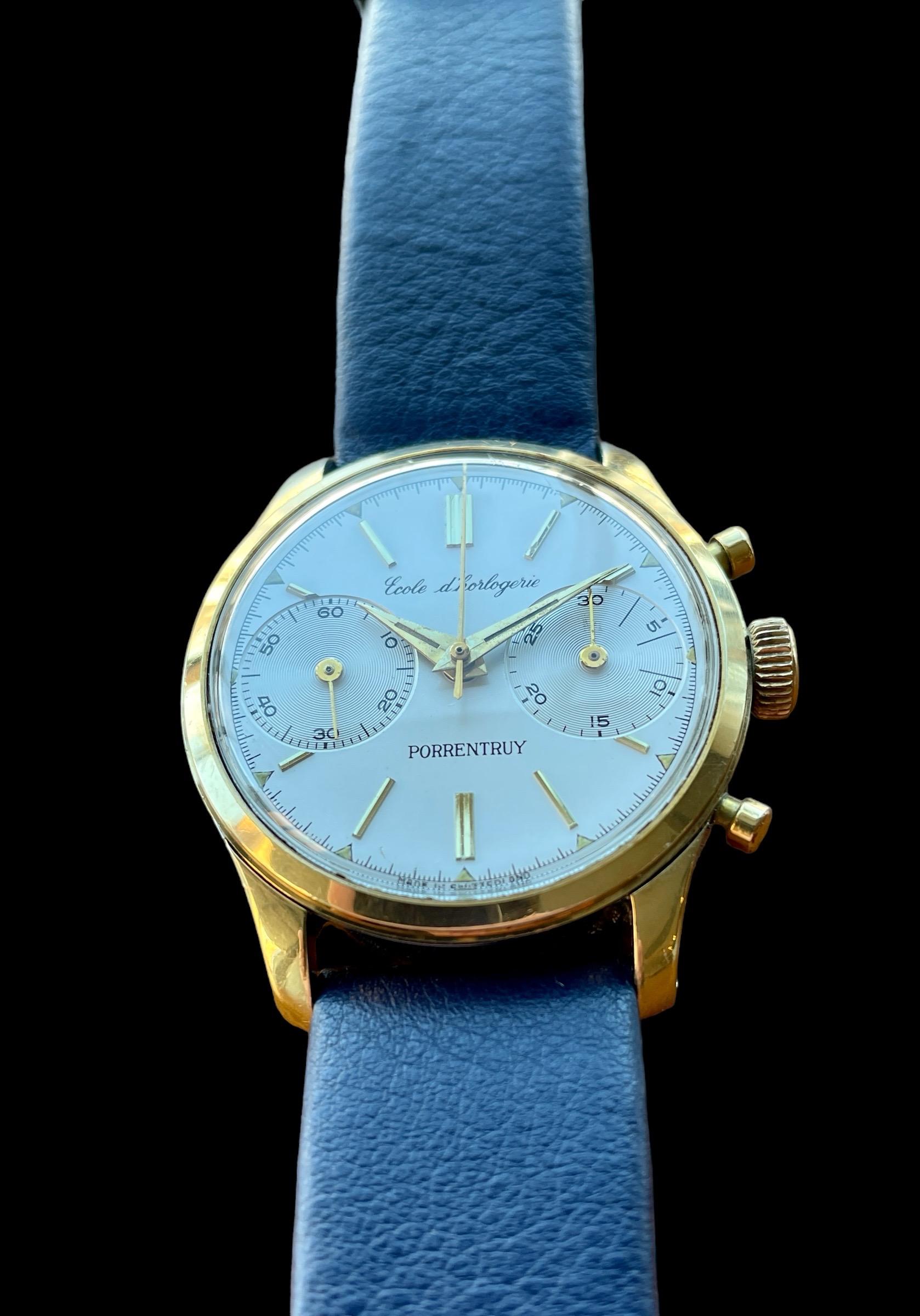 This particular watch was made in the 60's and was based upon the Pre-Carrera Heuer reference 409. The watch was a culmination of training where students attended the school for a period of 3 - 51/2 years. In Porrentruy at the time they had 2 levels of graduates, the D'apprenttissage horlogerie and the Ecole d horlogerie, the latter indicates a longer and more detailed training.