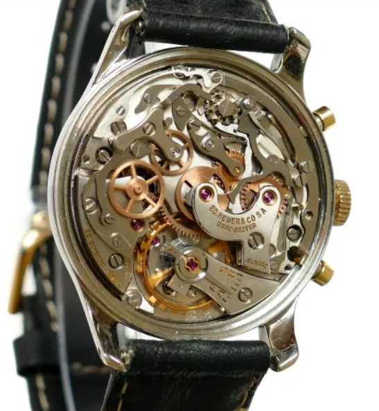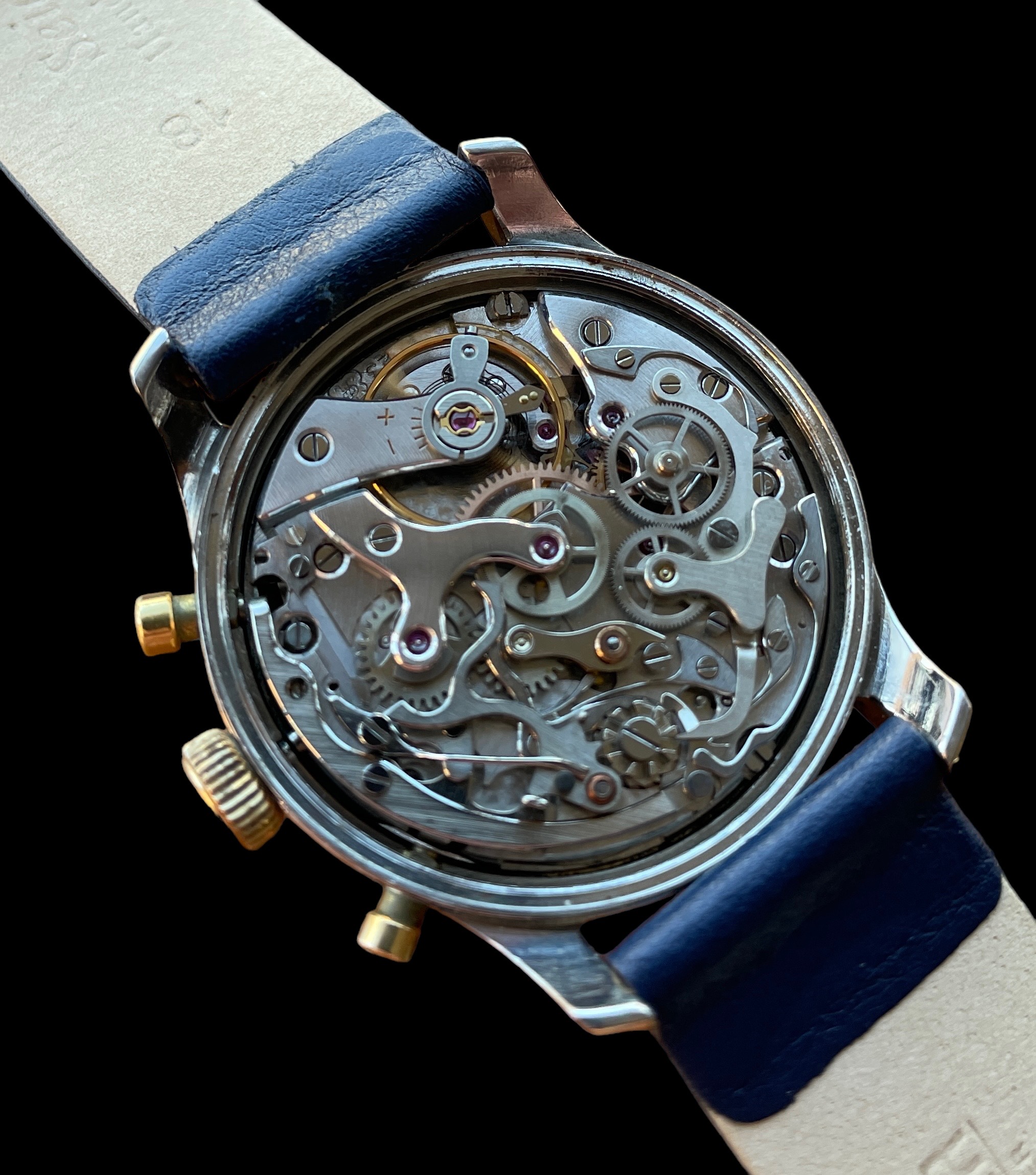 Movement is a VJ23, same as the one used by Heuer, There is a small difference of the chrono bridge which is different than the Heuer and obviously no signature on the movement. The student did all the finish work on the movement including the anglage. The movement was sourced by the school.