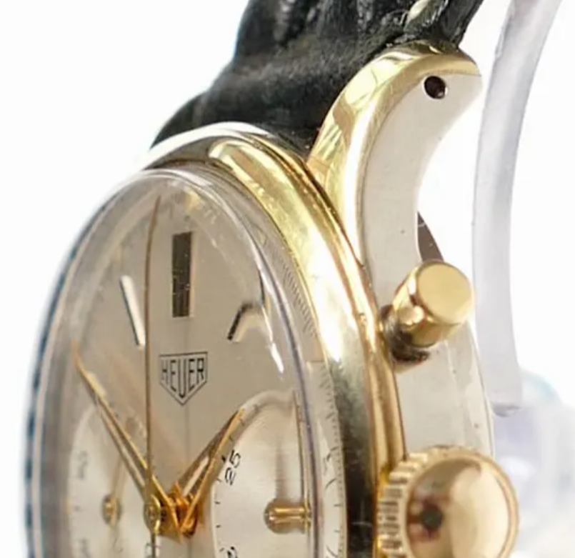 Case: 3 piece waterproof steel case with solid 14K bezel and pushers. The lugs appeared to have been machined down and 14K gold was forged onto the lugs. interesting that the student opted to start off thick at the end of the lugs and taper them down as it came up to the case. The case was delivered by Heuer and I assume the student applied the gold onto the lugs. I am not familiar with the Heuer but I am assuming the applied gold was done by the student.