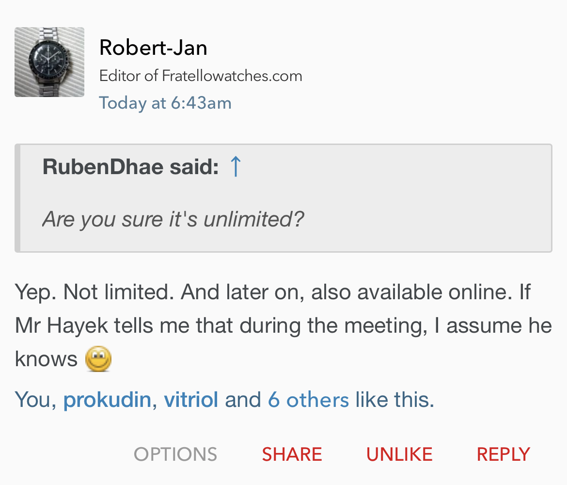 The mgr of one of the Swatch locations doing the distribution believes he is getting around 160pcs and US allocation for the first release is around 1600pcs TOTAL not per planet. Second hand info but it’s from todays lunch meeting with the OB manager I use.