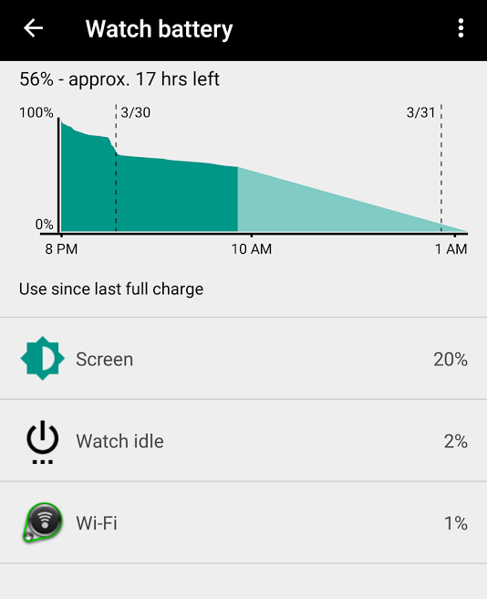Wow. Actually the most i can get from my watch is just 14 hours. But generally it is ok for me as i will took it off from the charger 8.00am daily and put it on again to the charger for overnight charge around 10.00 pm. This is when paired with iOS, Automatic Wifi and always on Display. The battery usage worsen if i use Watchfaces from Watchmaker as it requires extra energy for 'not so energy efficient' ambient mode of those watchfaces.