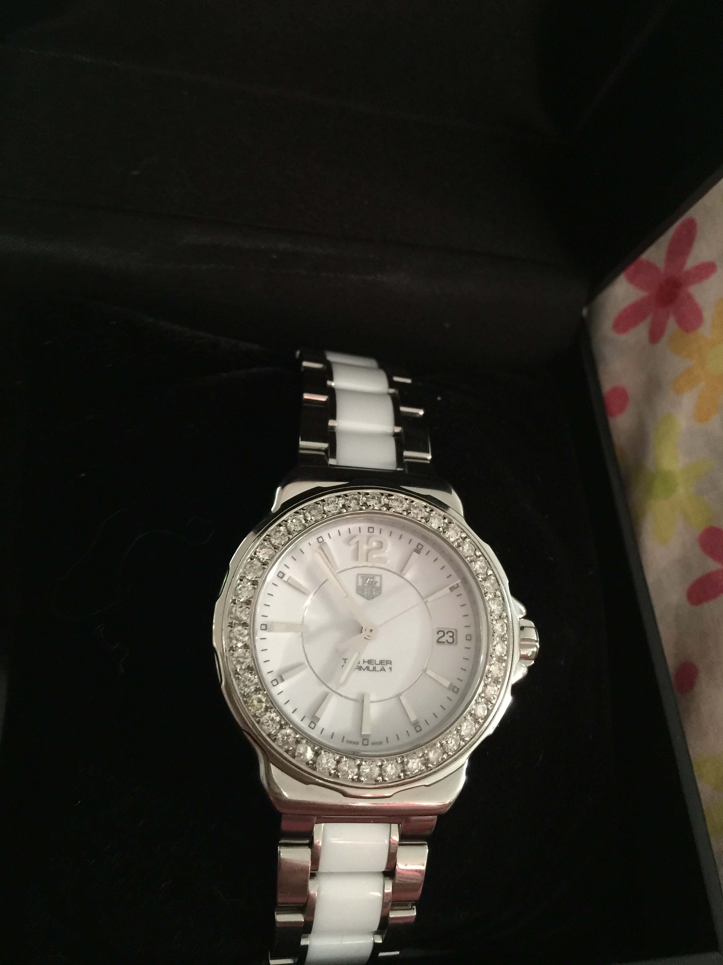 To back up my reasoning, TAG Heuer do not make a ladies ceramic F1 with diamonds higher than grade I, which in laymen's terms are low grade chips. The Diamonds shown on your watch are cut like a top wessleton or brilliant cut, TAG Heuer do not put top wessleton into F1's.