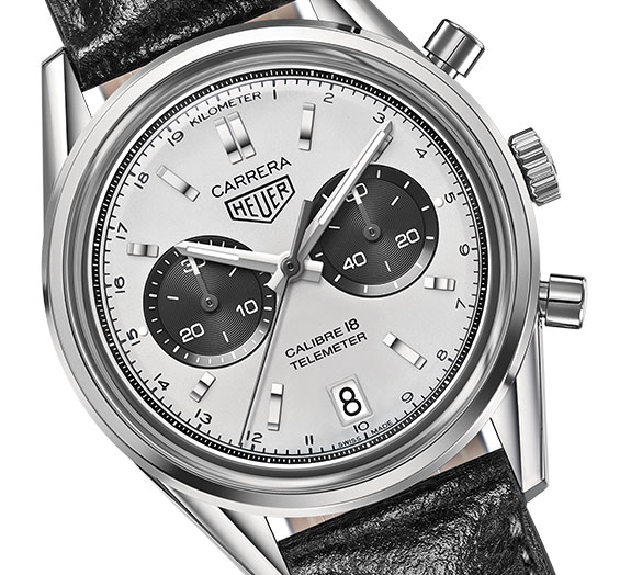 The vintage look and shape of this new black and silver chronograph, is also based on Jack Heuer’s Carrera design. That makes it look like the original two-counter Carrera of the sixties, a collector’s favorite with the black chronograph counter at nine o’clock and the second one at three. It is not a standard chronograph, it has a telemeter scale on the flange, an old tool imagined for military, to measure distance of artillery fire, based on the speed of sound. Why not using it during a thunderstorm to know how far from you it is? A unique feature in the recent TAG Heuer collections.