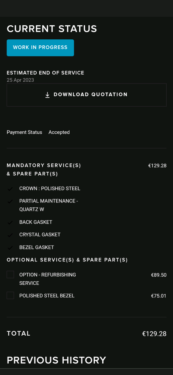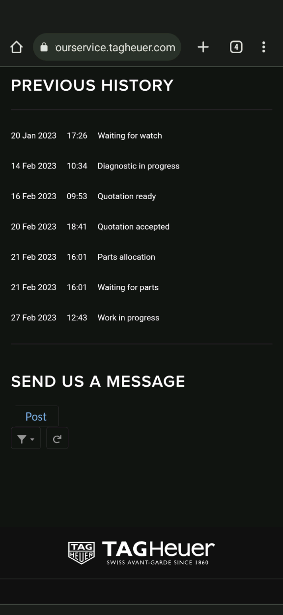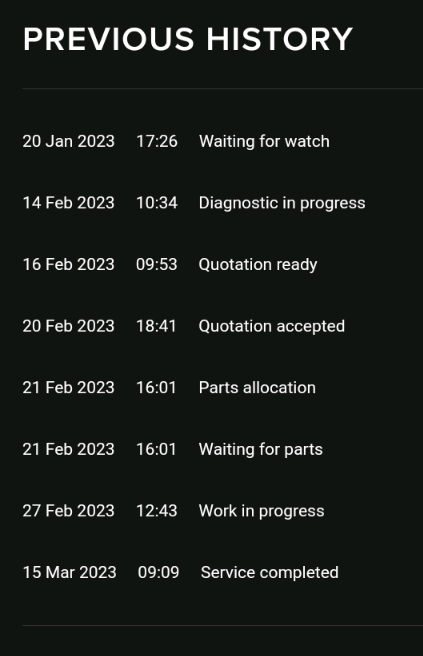 Good communication though, got emails when the service request was entered (at the Boutique), when the watch arrived, when the estimate came, and when service began