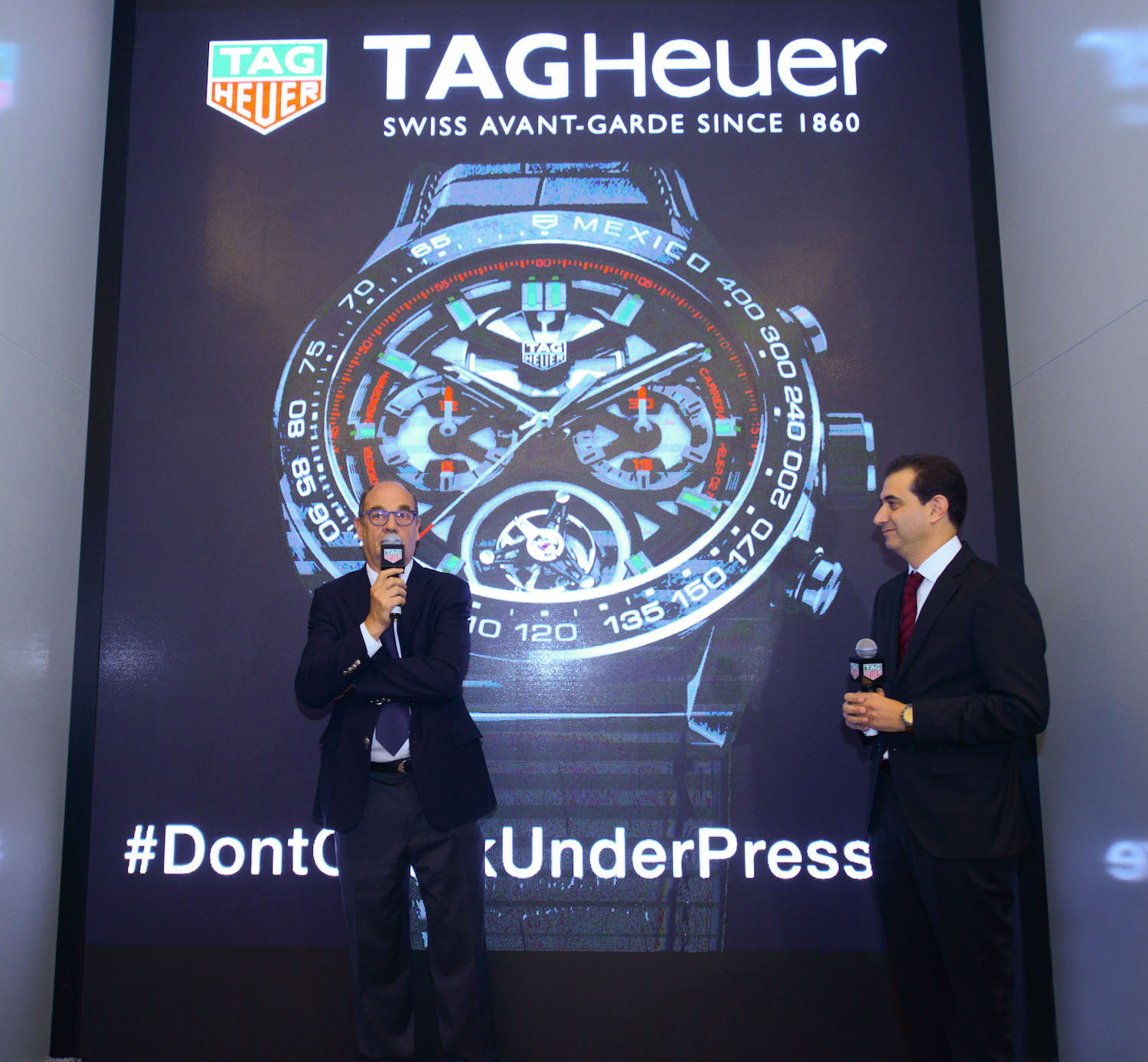 During a press conference, Christian Weissbach, President of TAG Heuer for Latin America and the Caribbean and Karim Santiago, Director of TAG Heuer in Mexico, unveiled the new Carrera Heuer-02T Limited Edition Mexico. The stunning chronograph features a striking design with a 45 mm case made of titanium grade 5 with black titanium carbide, lightweight and shock resistant, a black ceramic bezel bearing the word " Mexico" and a crocodile leather strap.