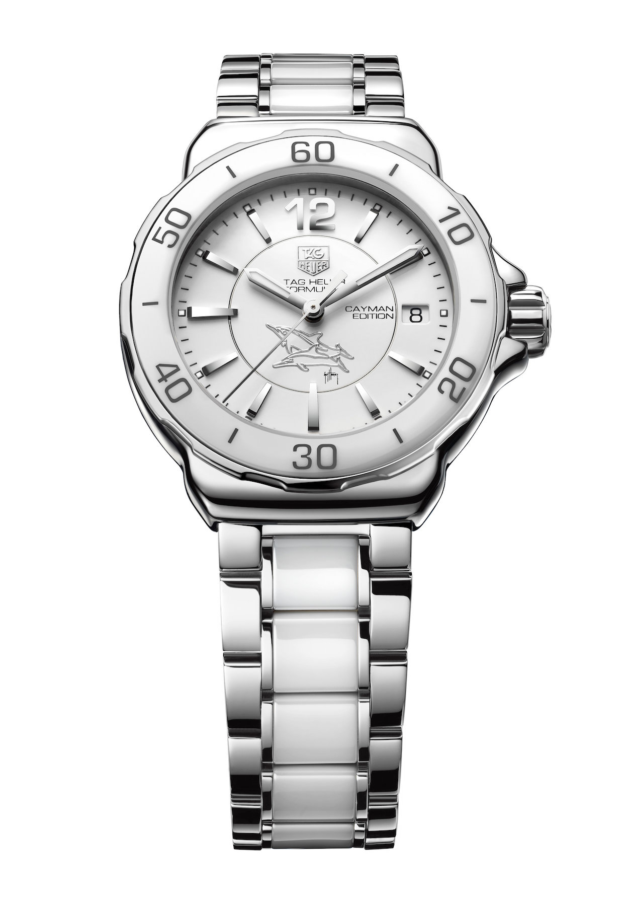 - Formula 1 Lady: Polished steel case of 37mm, sporty yet feminine version, featuring a Guy Harvey drawing of two dolphins on a white mother of pearl dial surrounded of a steel and white ceramic bezel and bracelet.