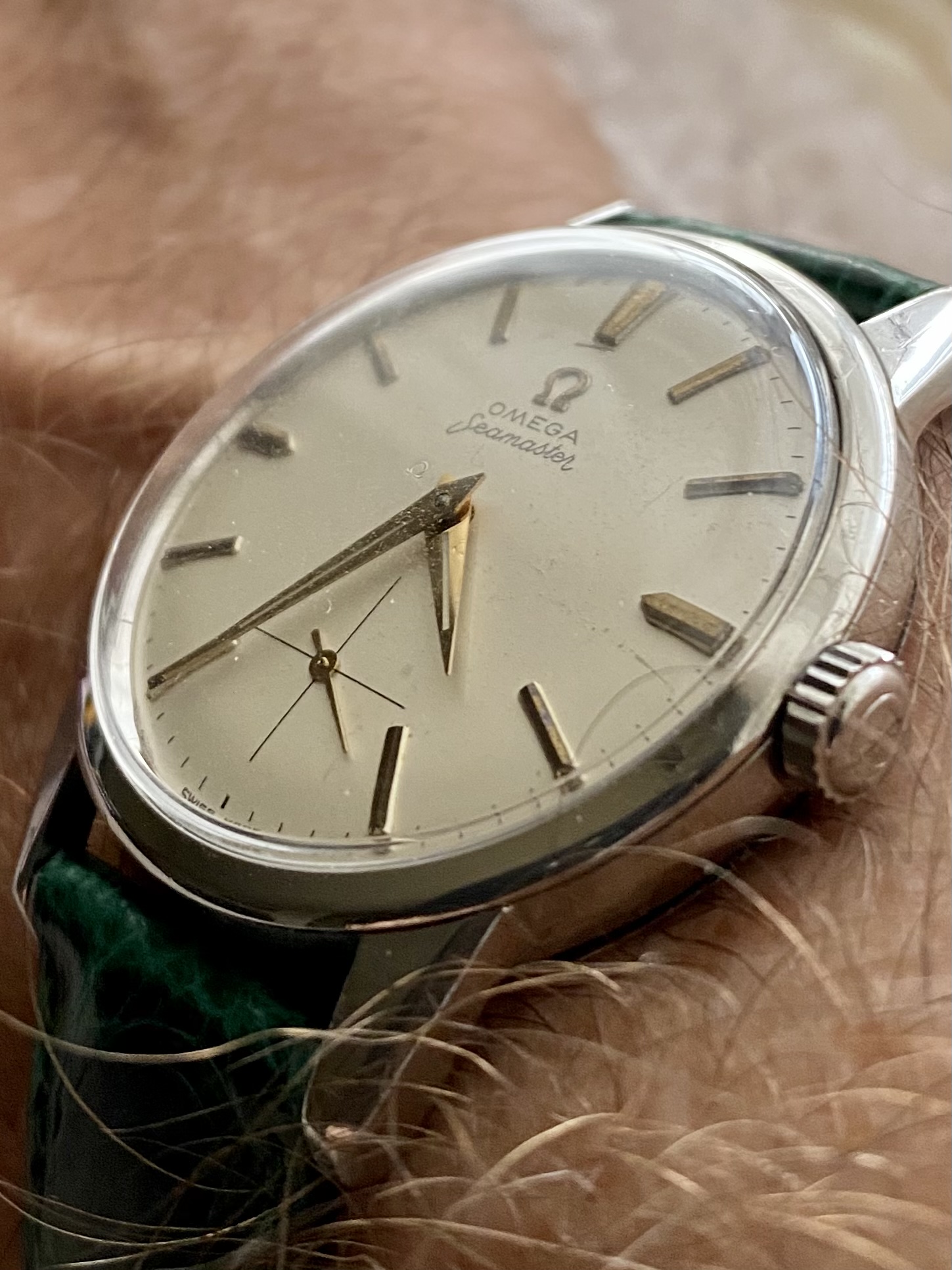 I had an interesting encounter at the Open that I forgot to mention in my prior posts. My sister and I were at an Amex booth where reps were distributing complimentary radios/earpieces synced to the ESPN commentary to Amex cardmembers. One of the younger reps noticed my vintage Seamaster (photo below). He remarked that he had encountered many cardmembers wearing Rolexes, but found none of them appealing and that my Omega, in his words, was “real class.” Never expected anyone to notice the watch, let alone comment on it, but it brought a smile to my face.