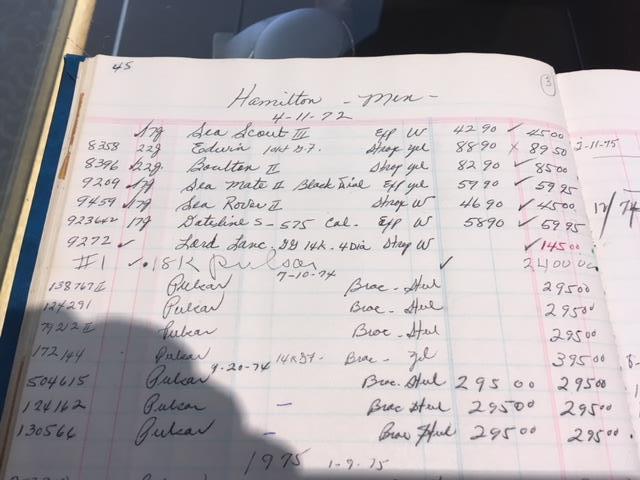 The articles state that Hamilton started promoting this watch in 1970, but the production started in 1972. There were 400 of these 18k beauties made. This one was sent to the jewelers on April 11, 1972, one week after the watch was advertised in the Wall Street Journal for sale. Proof: Here is a photo of the jeweler's ledger book for the Hamilton Watches they received on April 11. Notice the "#1 18k Pulsar" notation in the watch book. See also the $2400 price listed off to the right. That is good money today; it was more than a car in 1972.