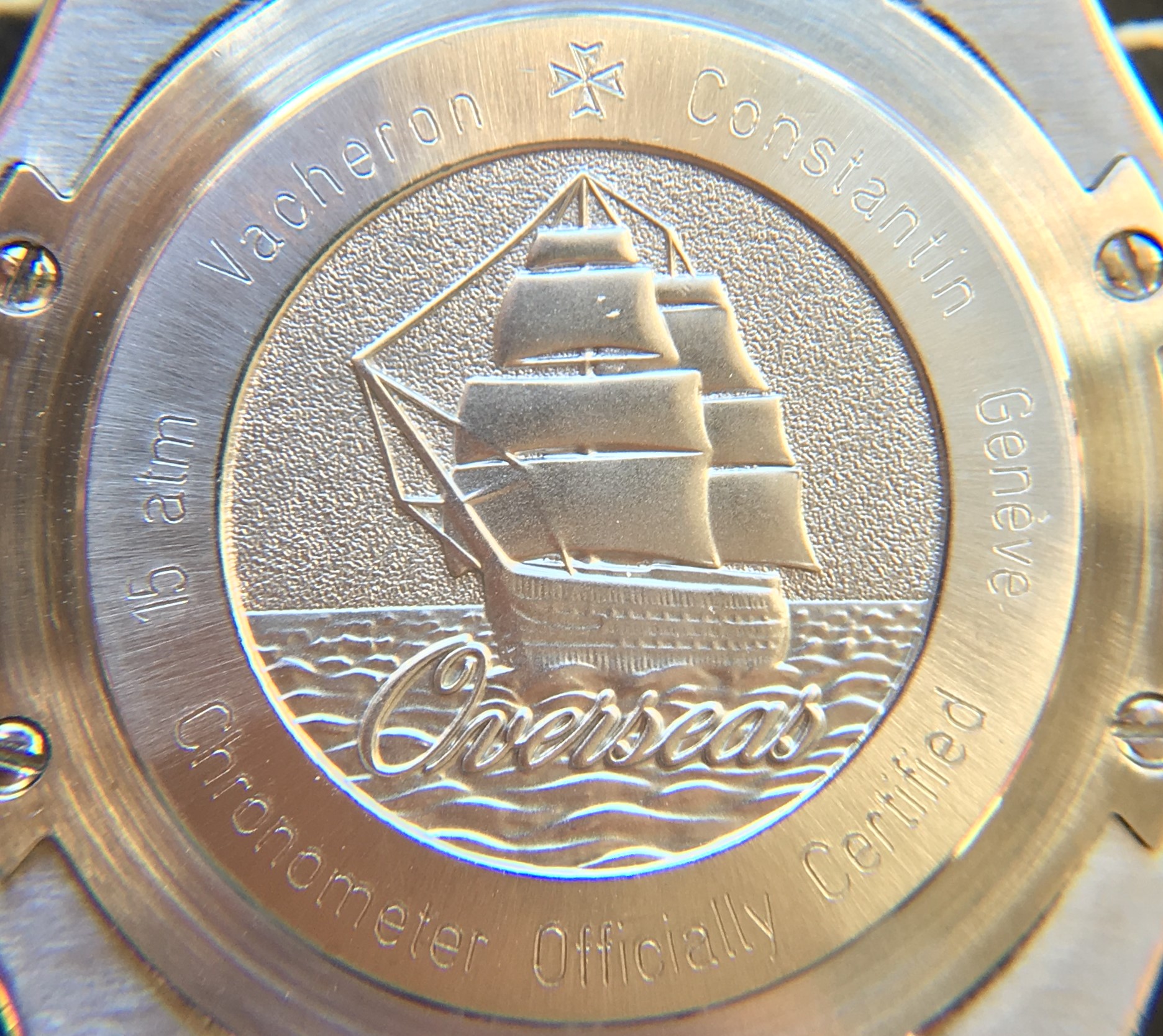 To stay with the comparison the Overseas and the cousins all share some features: three hands, a date window at 3 o’clock, a sandwich case construction and what some people would argue; a tonneau shaped case. Hold on to the image of barrel shaped object from which the tonneau shape originates. It could be an old wooden barrel on an ancient trade ship. Bringing us to the case back and the medallion showcasing the Italian three-mast Amerigo Vespucci. On the sea probably with dozens of tonneau shaped barrels onboard. The image and theme of the reference 42042 is beginning to stand out.