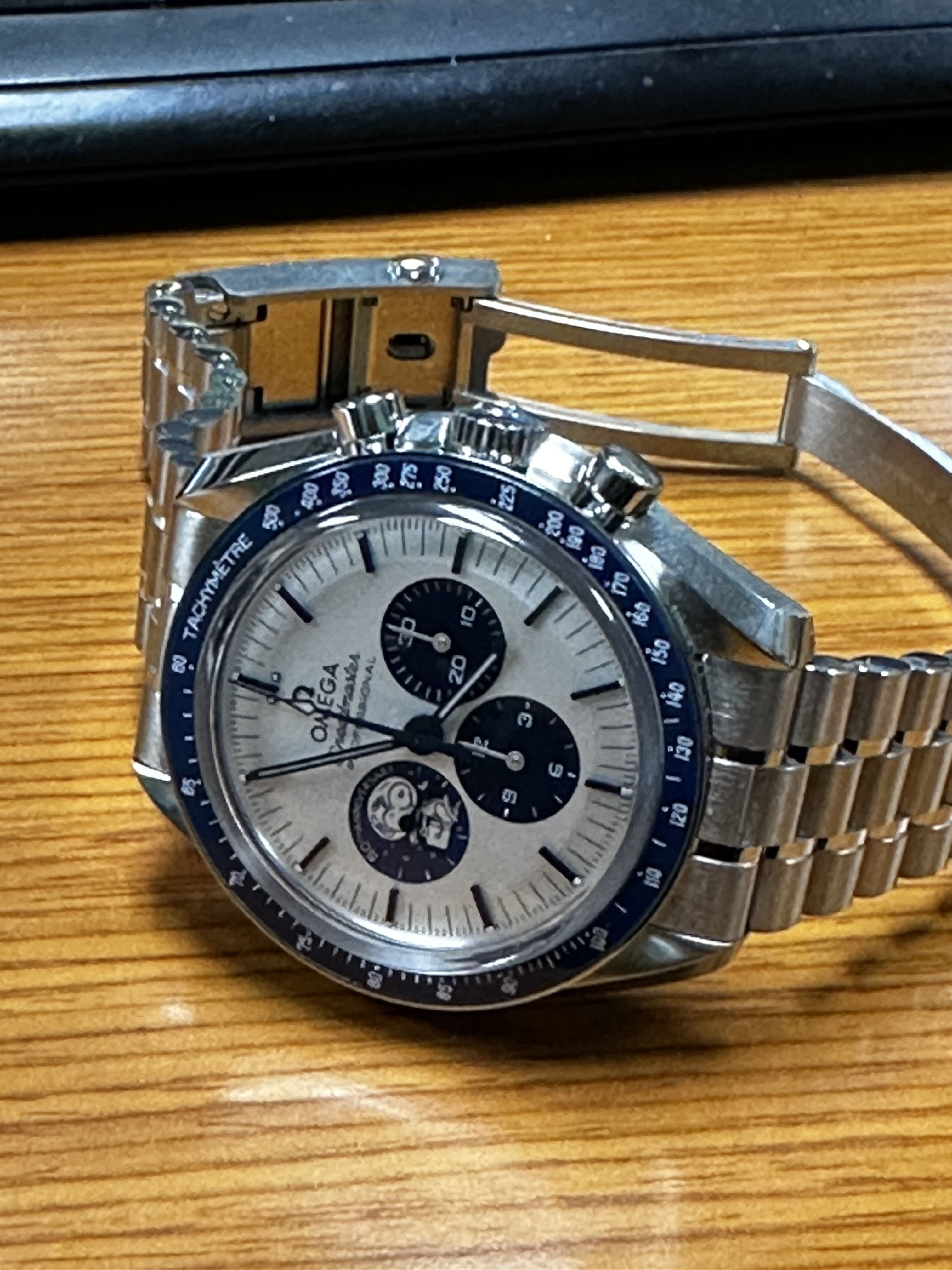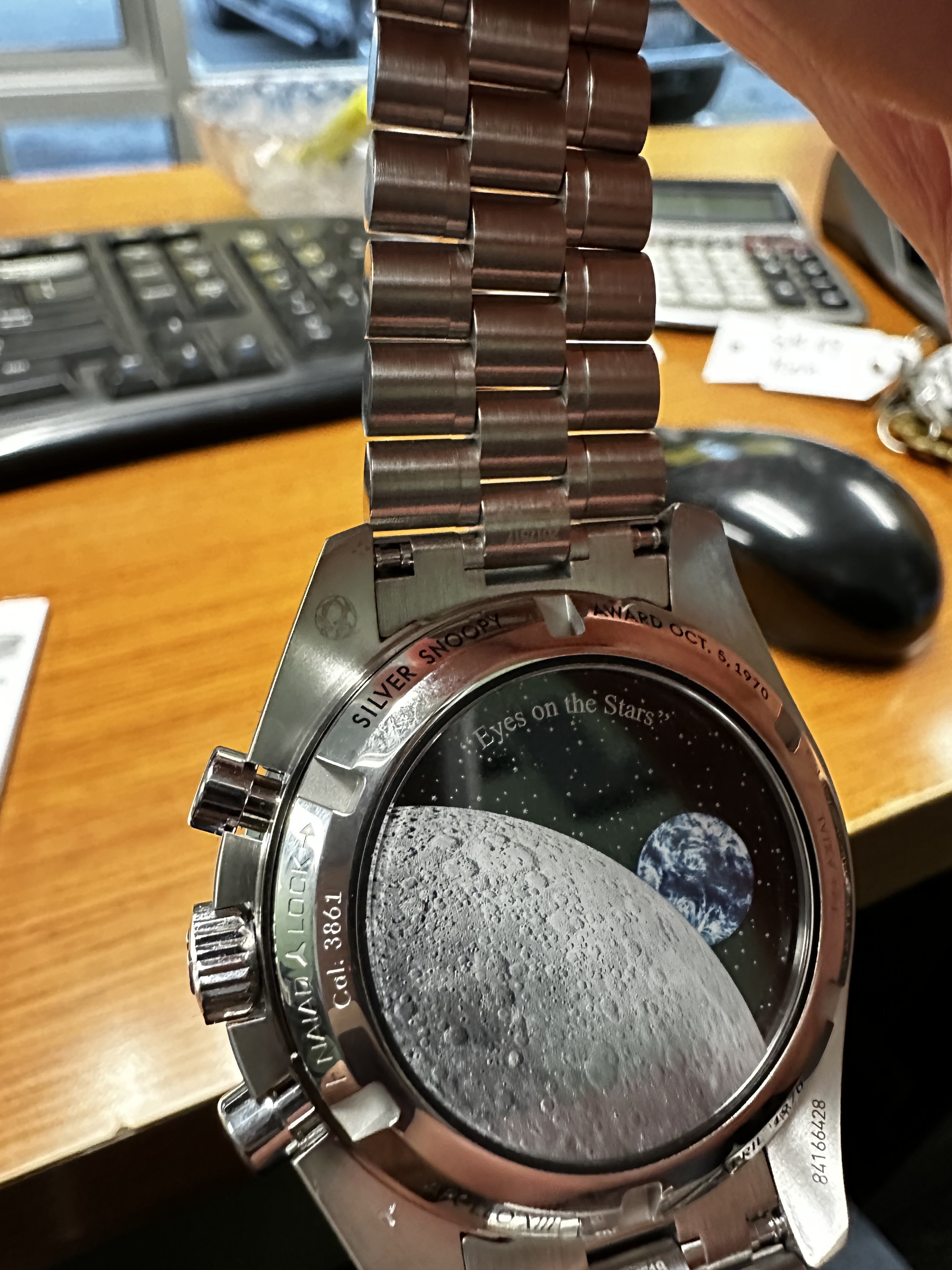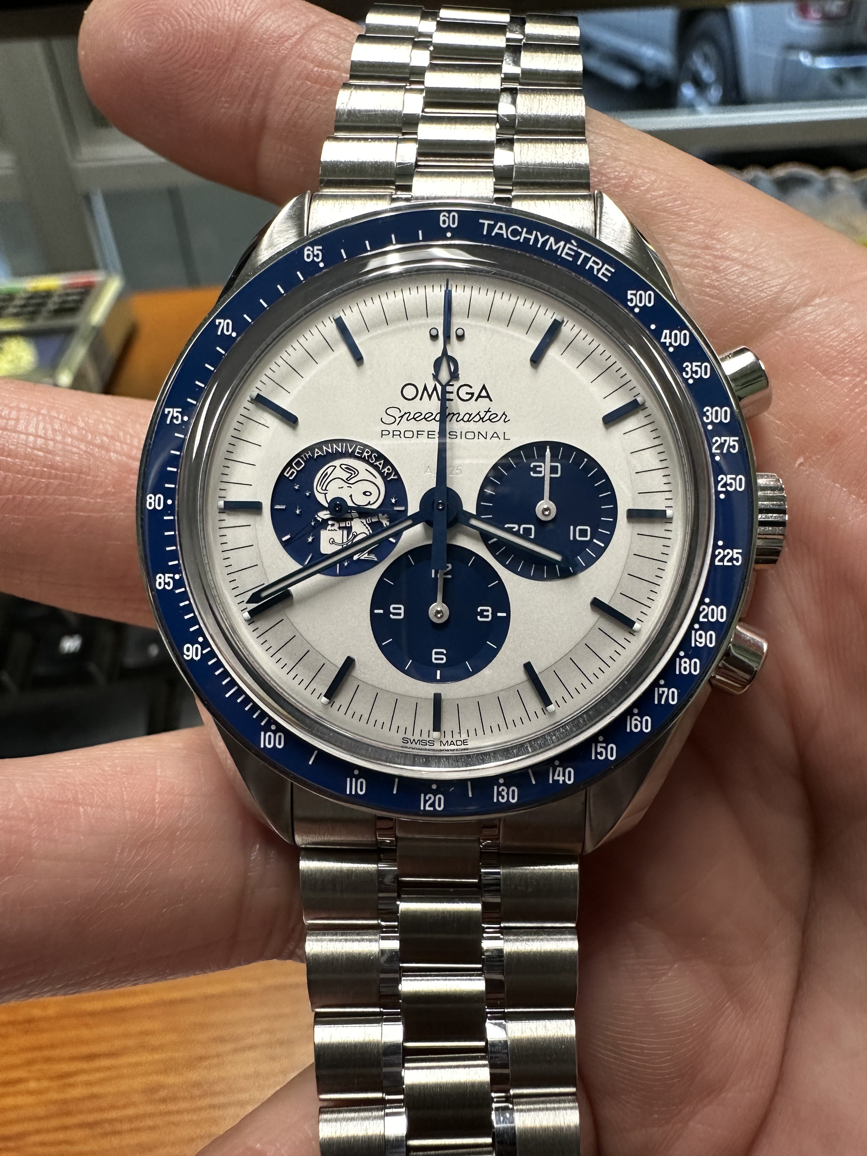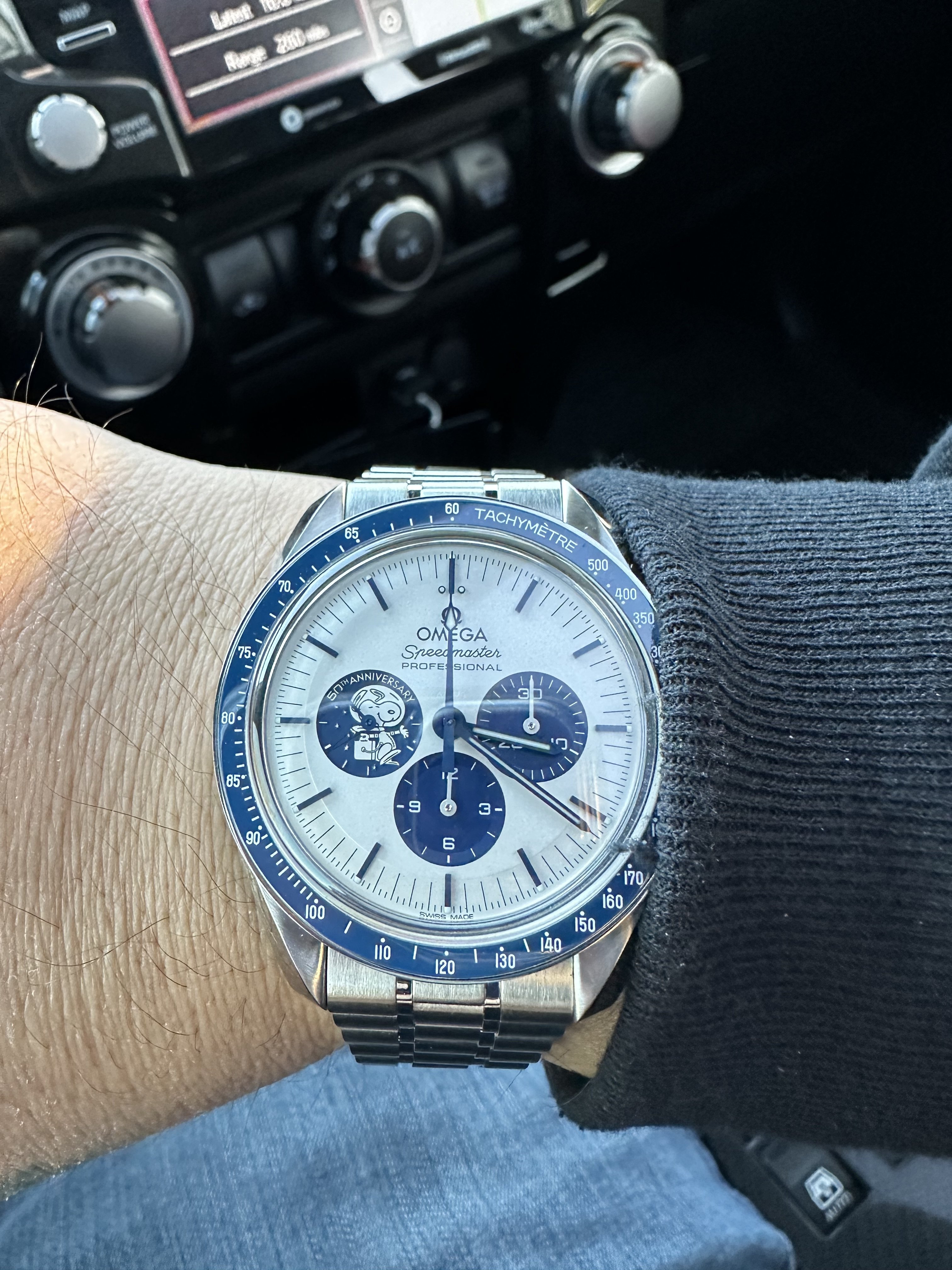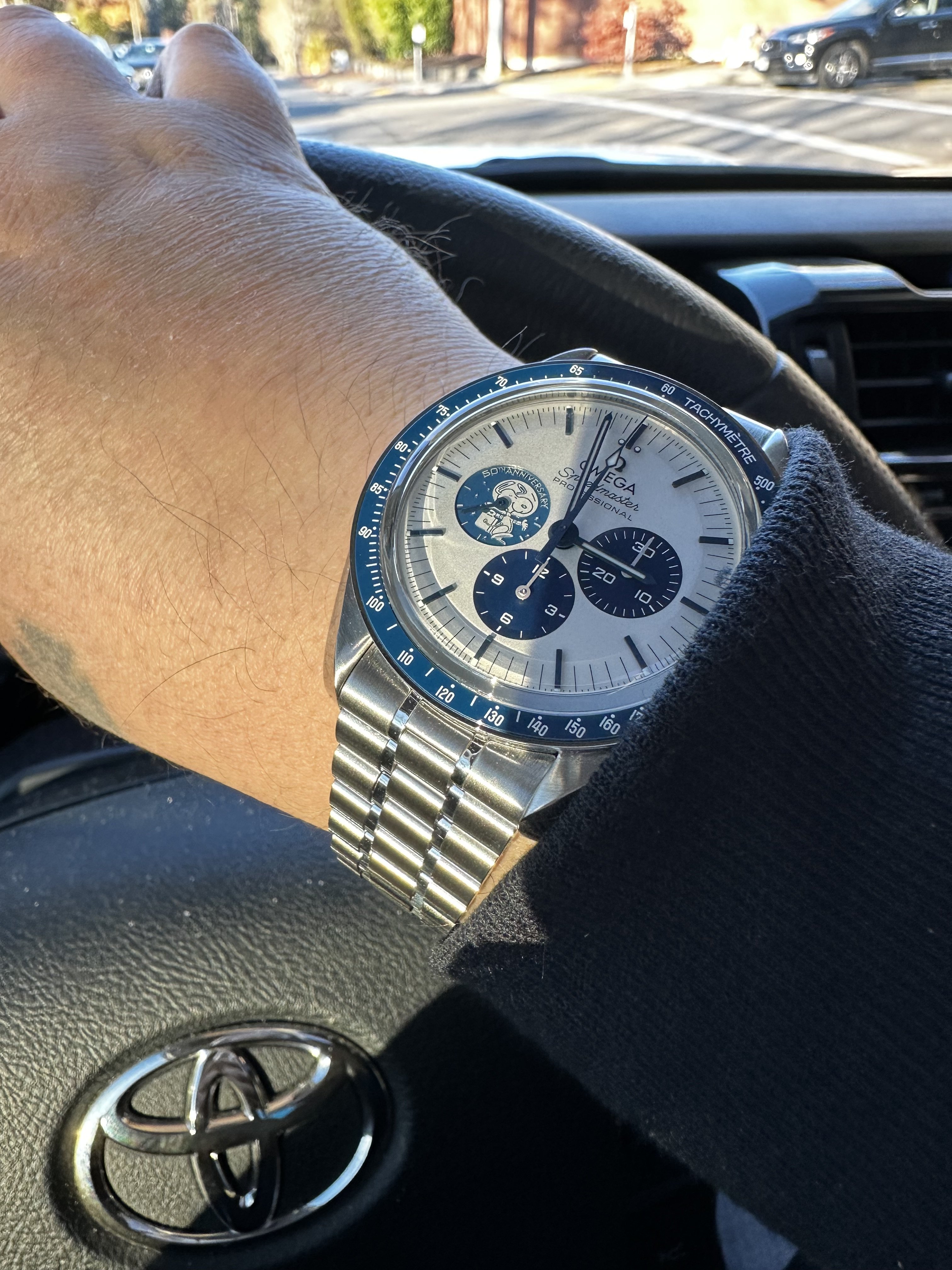 ·Got the text this morning that my Snoopy had come in. Was talking to my OB a month or so ago that I didn’t want to commit but wanted to see it first. Well all I can say is it looks MUCH better in person. The dial isn’t really a white, it’s a silverish white. Really good looking and the blue is a nice deep blue. In the sunlight, it makes for an awesome contrast. Needless to say, I took it. Tried the strap it came on, and like others said, it is pretty bad. It is REALLY stiff. Had my OB throw it on the Speedy sapphire sandwich bracelet. Loving this watch. Shout out to Joshua at the Bellevue OB. He came through for me before Christmas.