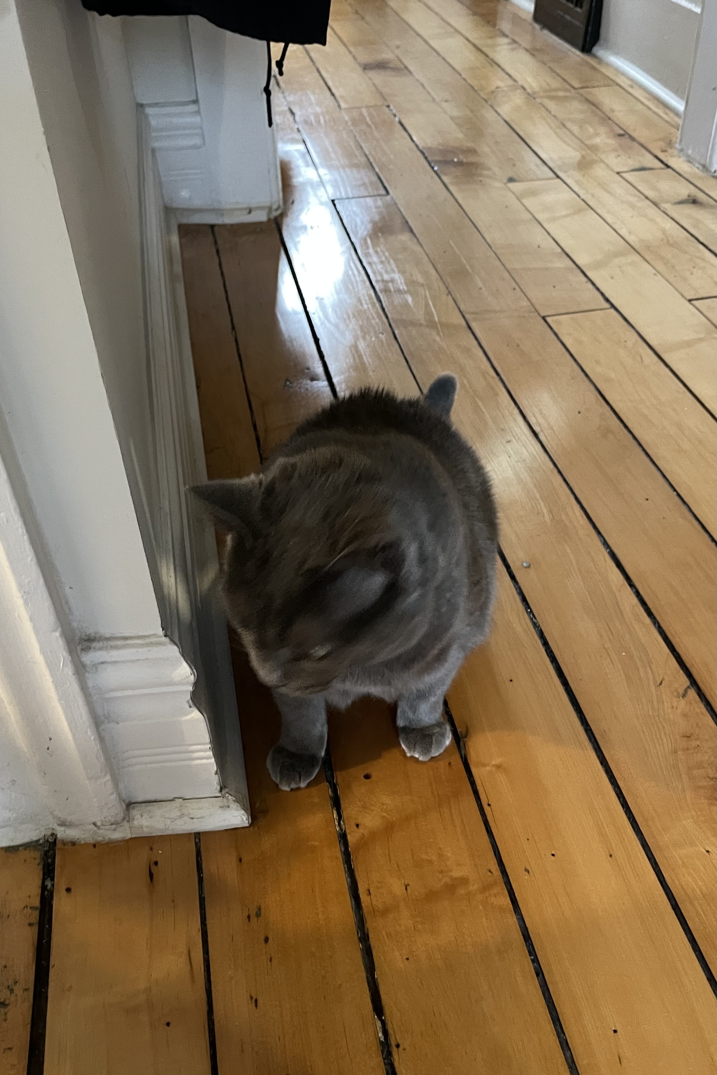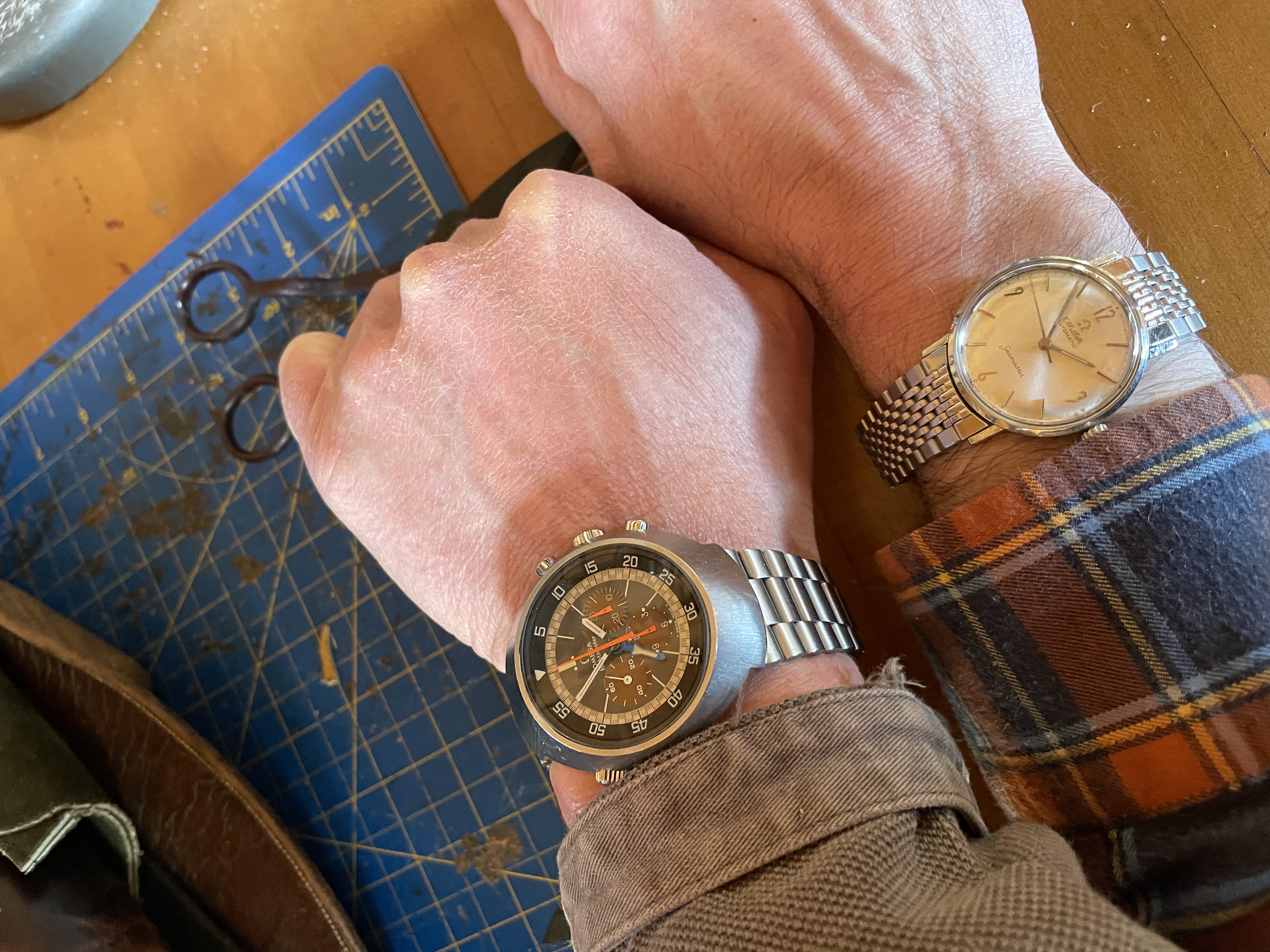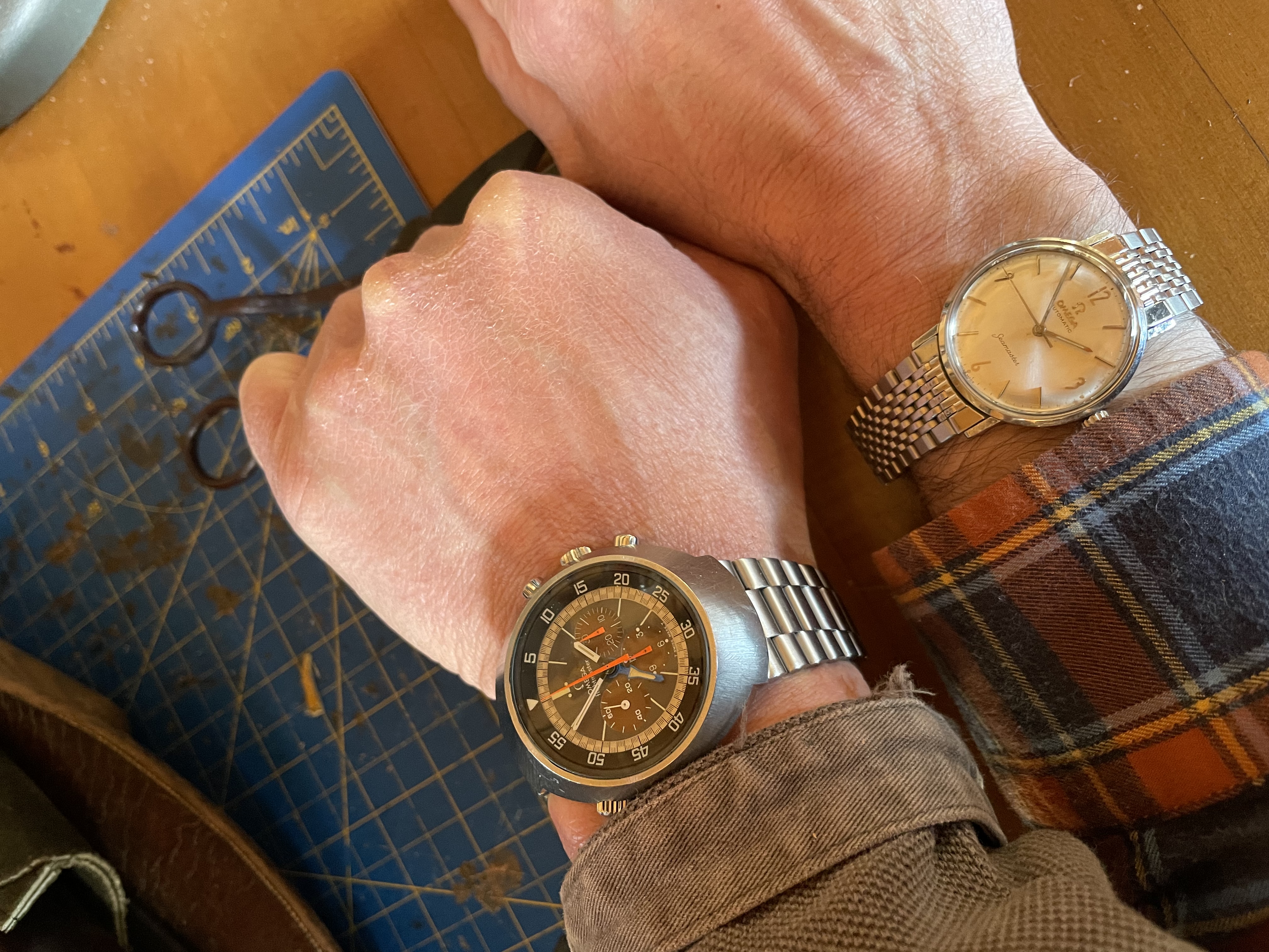 I will call it the DaveK Duracuir collaboration. Of course, he will do all the work. I supplied the leather. The lunch… and the leather… I had promised Dave an awl from the last trip I made at the Antiques mall. I gave him the one shown by the black arrow. The other arrow points to scissors that were totally rusted. I soaked them in CLR for 3 days, then wiped them with oil. They easily cut through thin leather. Amazing! Here are the mostly rust free blades now, as Dave prepares to test them. Hands courtesy of @DaveK And since we were both wearing Omegas, why not a couple photos? Another nice visit Dave! Thanks for your friendship. The cat is afraid of everyone else and is glad you left, but do come back soon.