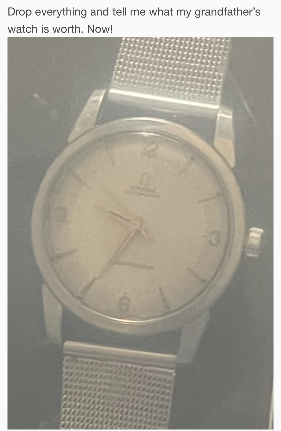A regular DON’T is one where a new member fails to provide us with an introduction and simply wants an evaluation of their watch. No more no less. Example (I made this one up). Note the useless photo provided. The always helpful Dan S and watchyouwant will try their best but without better photos, including one of the inner caseback (for most Omegas) they will be basing their response, if any, on their vast experience.