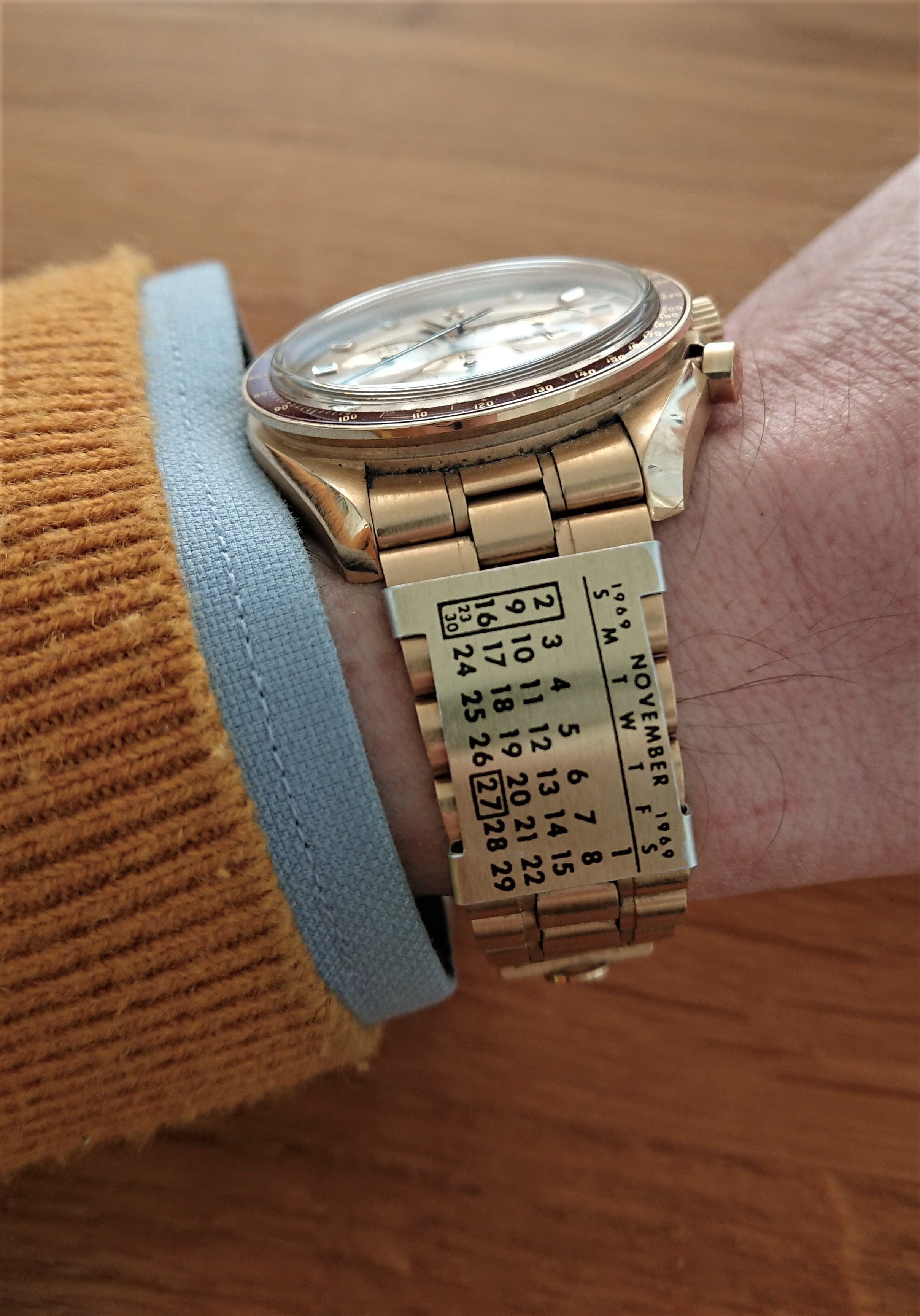 time to wake up this thread, because a new addition to my Speedy arrived safely from the very nice member and thread starter "TLIGuy". (Thanky you again for this perfect and very rare golden watch band calendar! I love it!)
