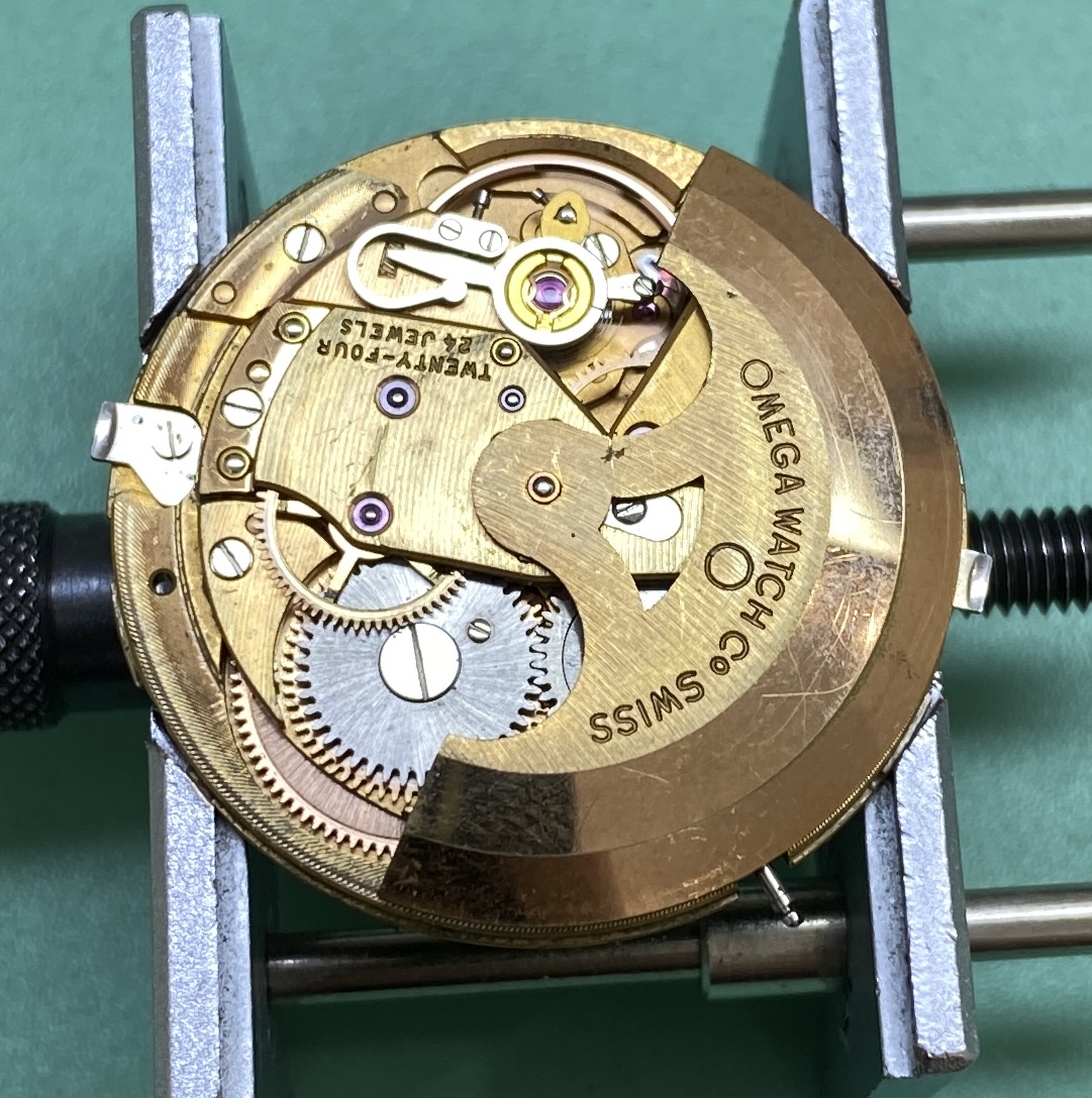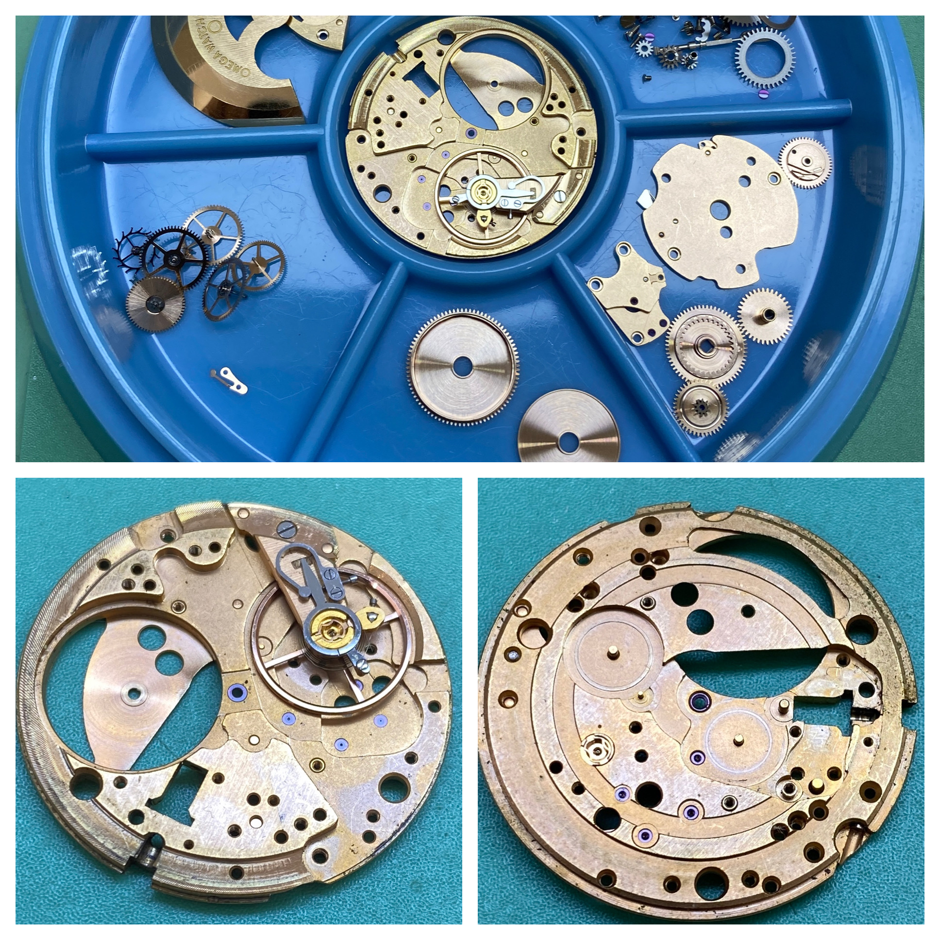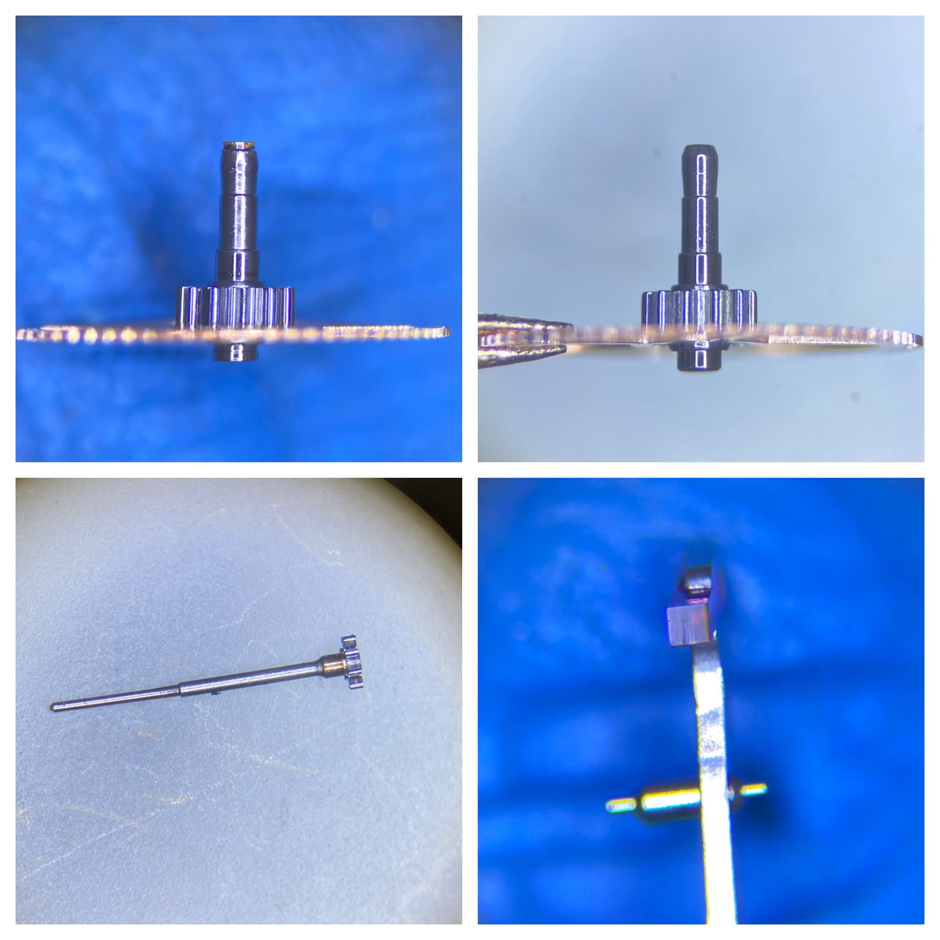 Upon close inspection of the components we can see the issues. The centre wheel is the old 55x series type with a separate bushing for the seconds pinion. The bushing has started to come out of the end - the reason that Omega upgraded this wheel to be one solid construction. The seconds pinion had some rust present on it so it was changed. You can also see the pallet fork stones have a groove carved out of them. This is the result of wear from lack of servicing over the years. A relatively common problem I see in these 55x series movements.