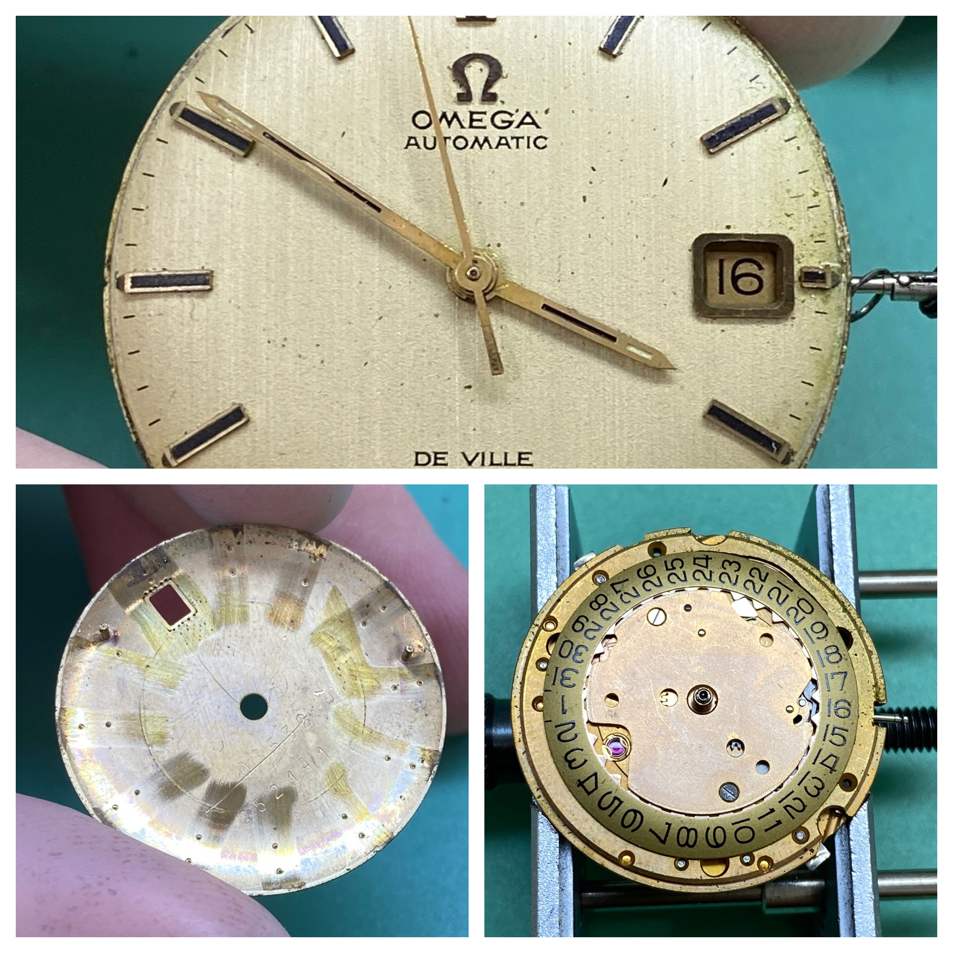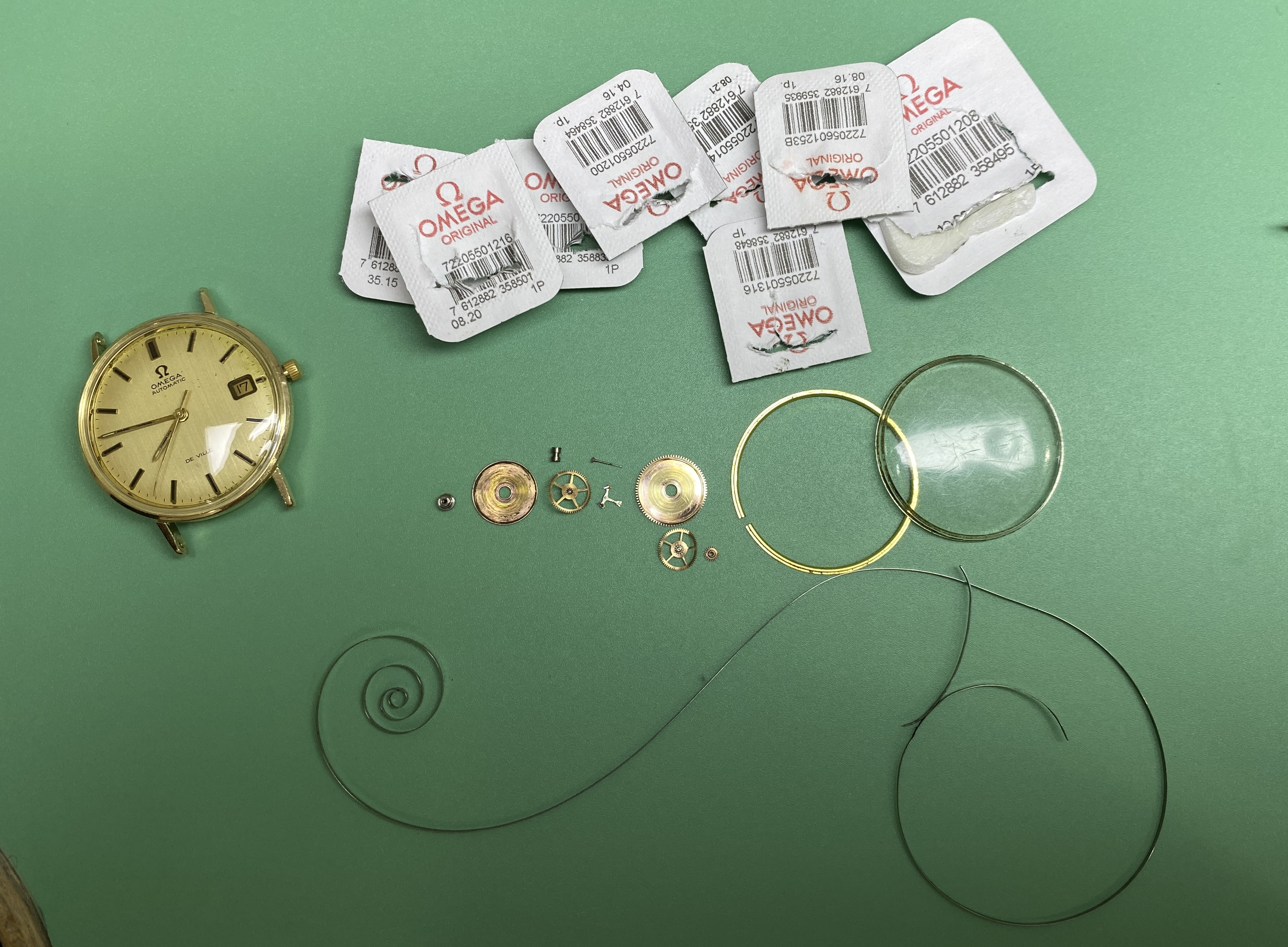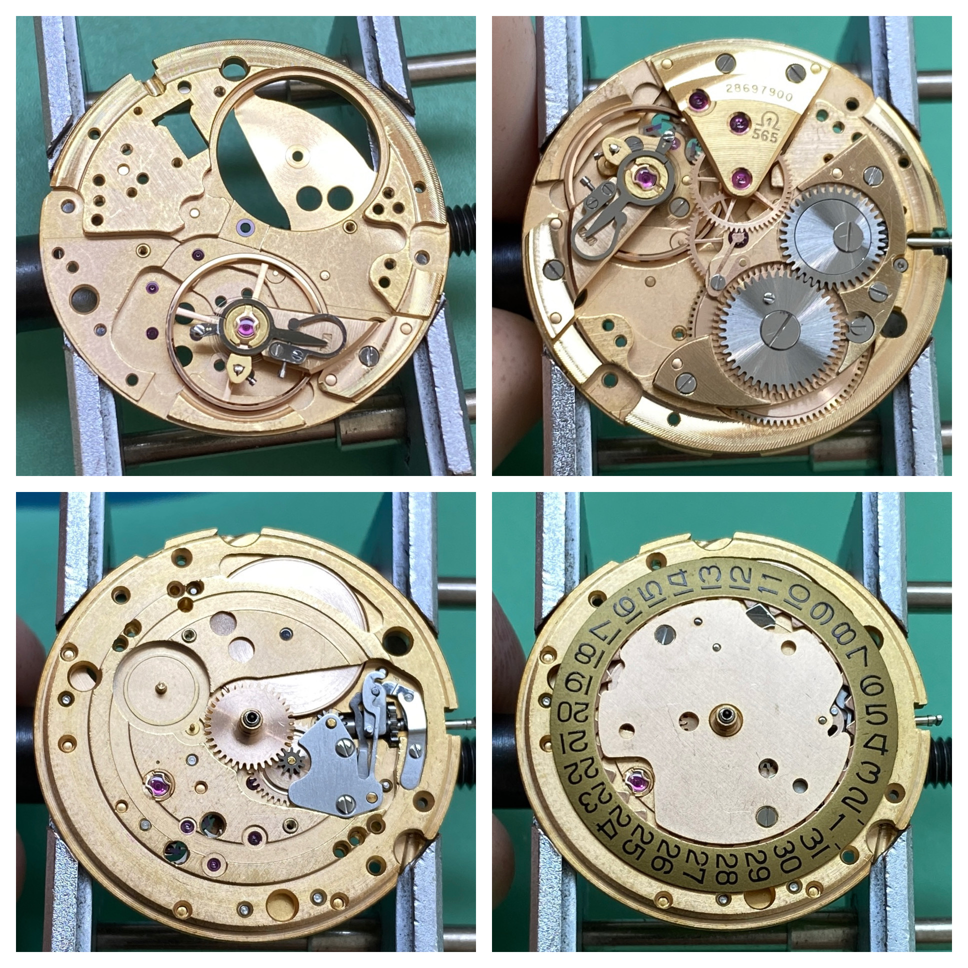 Upon close inspection of the components we can see the issues. The centre wheel is the old 55x series type with a separate bushing for the seconds pinion. The bushing has started to come out of the end - the reason that Omega upgraded this wheel to be one solid construction. The seconds pinion had some rust present on it so it was changed. You can also see the pallet fork stones have a groove carved out of them. This is the result of wear from lack of servicing over the years. A relatively common problem I see in these 55x series movements.