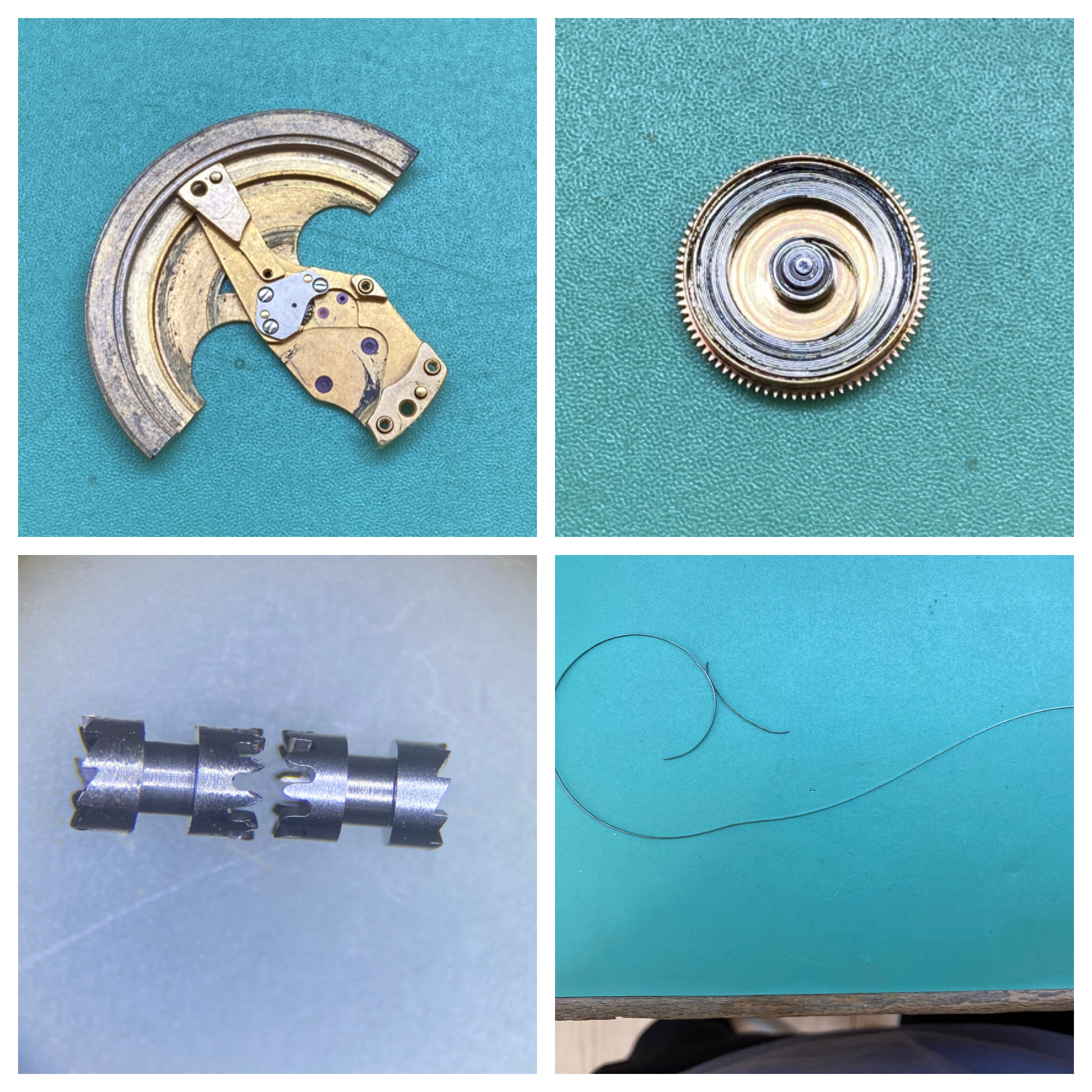 You can see just how filthy the automatic work was. The driving wheel fro the automatic work was so worn, you can see where it was rubbing on the plate. The barrel too was in bad condition. There were groves worn into the drum due to an out of flat mainspring. Also, the barrel wall was worn too. Once the mainspring was removed you can see the bad bend in the spring. Time for a new one. Finally, the clutch wheel (sliding pinion) had worn teeth and was ready to be changed.