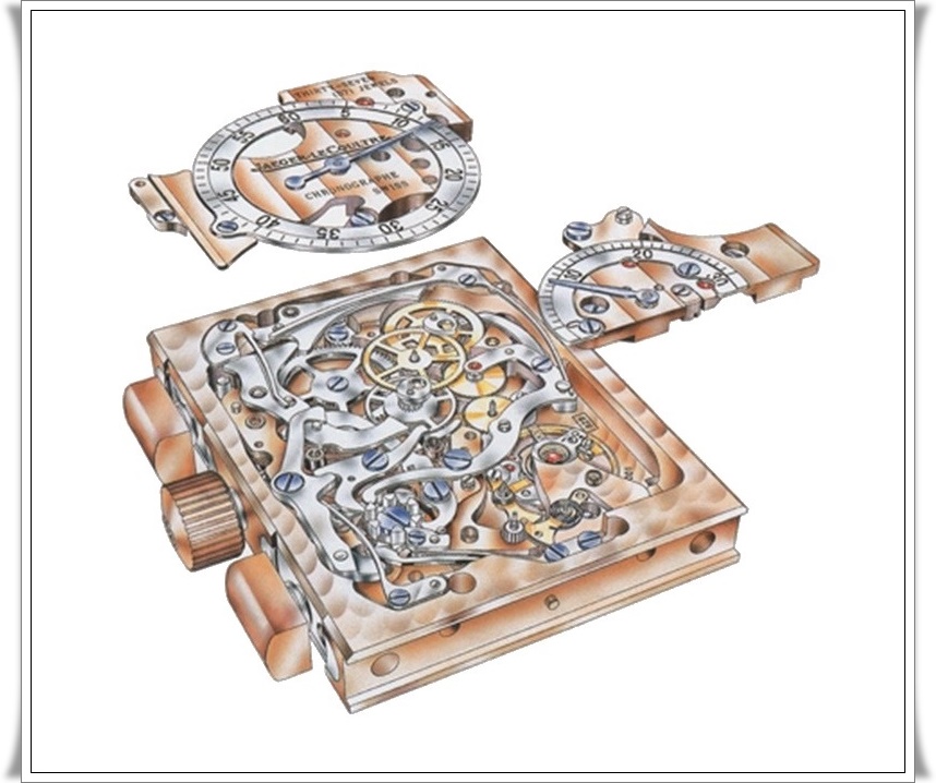 In the history of watchmaking, it is very rare for a shaped chronograph movement to be produced. Rectangular watches with a chronograph function were almost all equipped with round movements and had only a rectangular or square case and dial. The designers of the JLC were forced to redesign all the levers and bascules and move them to different positions than usual. In a space of 17.2 mm x 22.6 mm, the designers of the JLC movement developed 317 parts, including a column wheel and retrograde chronograph minute hand. If one converts this shape calibre into a round movement the dimensions would be equivalent to a 10"' line calibre (22.5 mm diameter), with a thickness of only 4.5 mm, with 28,800 Alt/h and a power reserve of 44 hours. The total weight was 79 g.