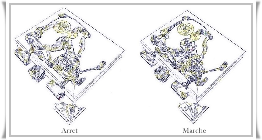 Finally, the last technical peculiarity of the watch is the trapezoidal indicator on the hours and minutes dial, which indicates the start or stop status of the chronograph function; this indicator has an axis which runs through the whole movement and is moved by the column wheel by means of a cam which is rotated clockwise by the column wheel itself when the chronograph starts, and anticlockwise by a spring when the chronograph stops (4, 8).
