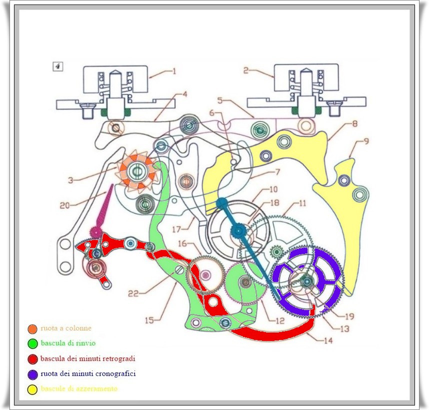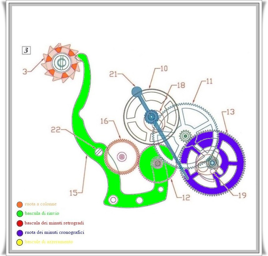 First of all, the minute wheel is not driven, as in classic chronographs, by a finger placed under the central chronograph wheel and a return wheel driven by the aforementioned tooth, but by a pinion which constantly meshes with the return wheel, which, equipped with a pinion, is connected to the chronograph minute wheel.
