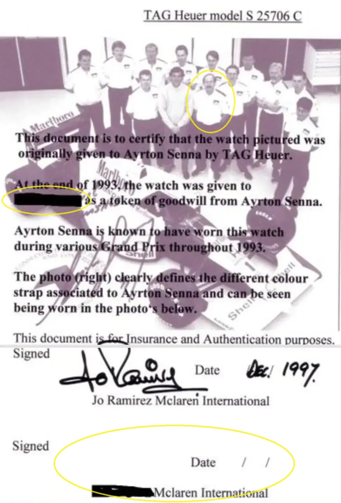 ·^In addition, the Bonhams webpage says the Authentication Letter was signed by both Jo Ramirez AND Ron Pellatt. But the image shared by Ron's son doesn't have his father's signature. If the Bonhams website is correct, it means Ron signed the paper later. I believe Ron is standing to the right of Senna in the photo.