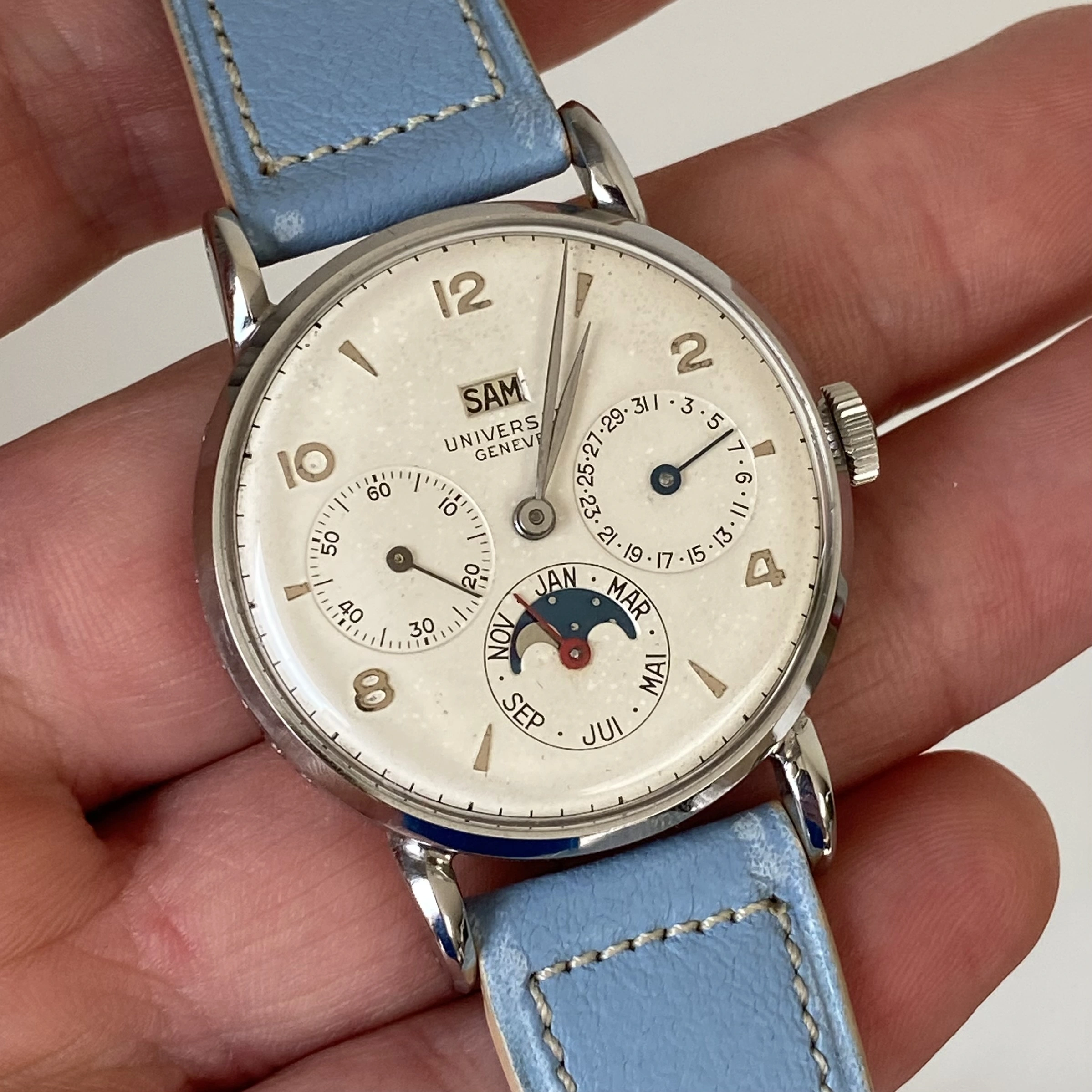 ··not the sharpest pencil in the ΩF drawerCan't determinate which reference it is (see i.e. https://universalgeneve.info/11-calendars?q=Calendar+Model-With+Moonphase) but all examples I have on record have numbers on the caseback. Caseback shoud be marked UG on the inside anyway. For instance this one: https://www.liveauctioneers.com/item/30996635_universal-geneve-full-calendar-ref-11303-around-1955