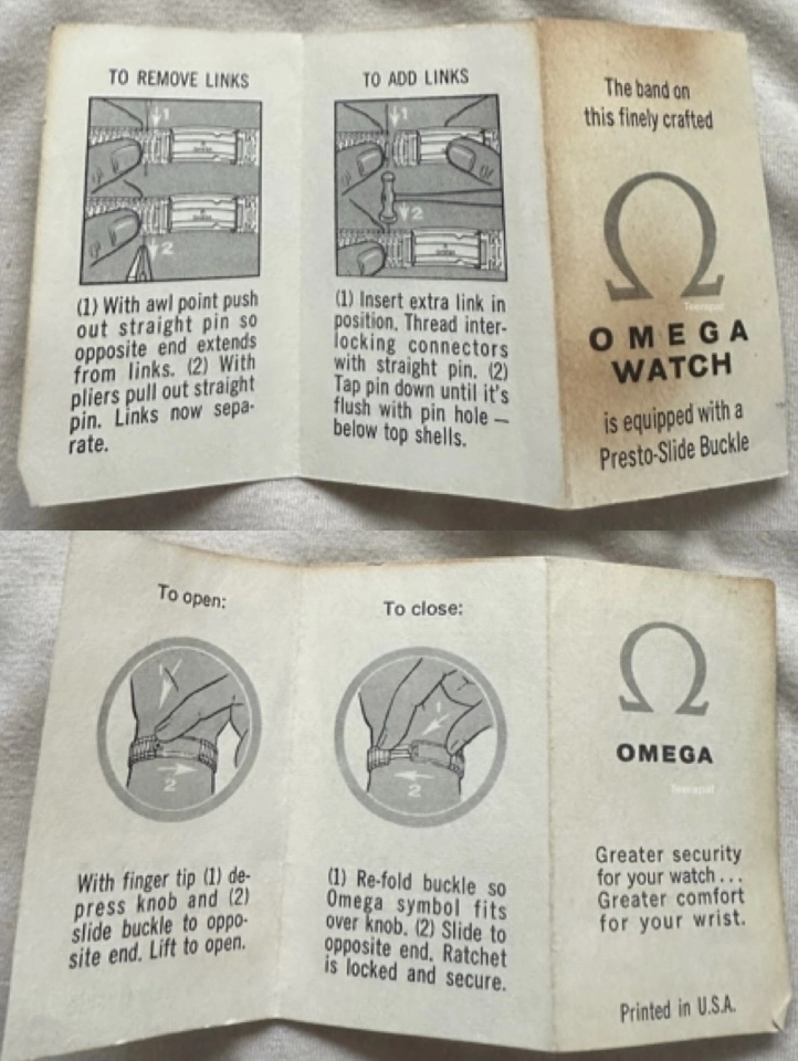 I am fortunate to have an original U.S.-printed Omega instruction sheet explaining how the buckle works (pictured below).