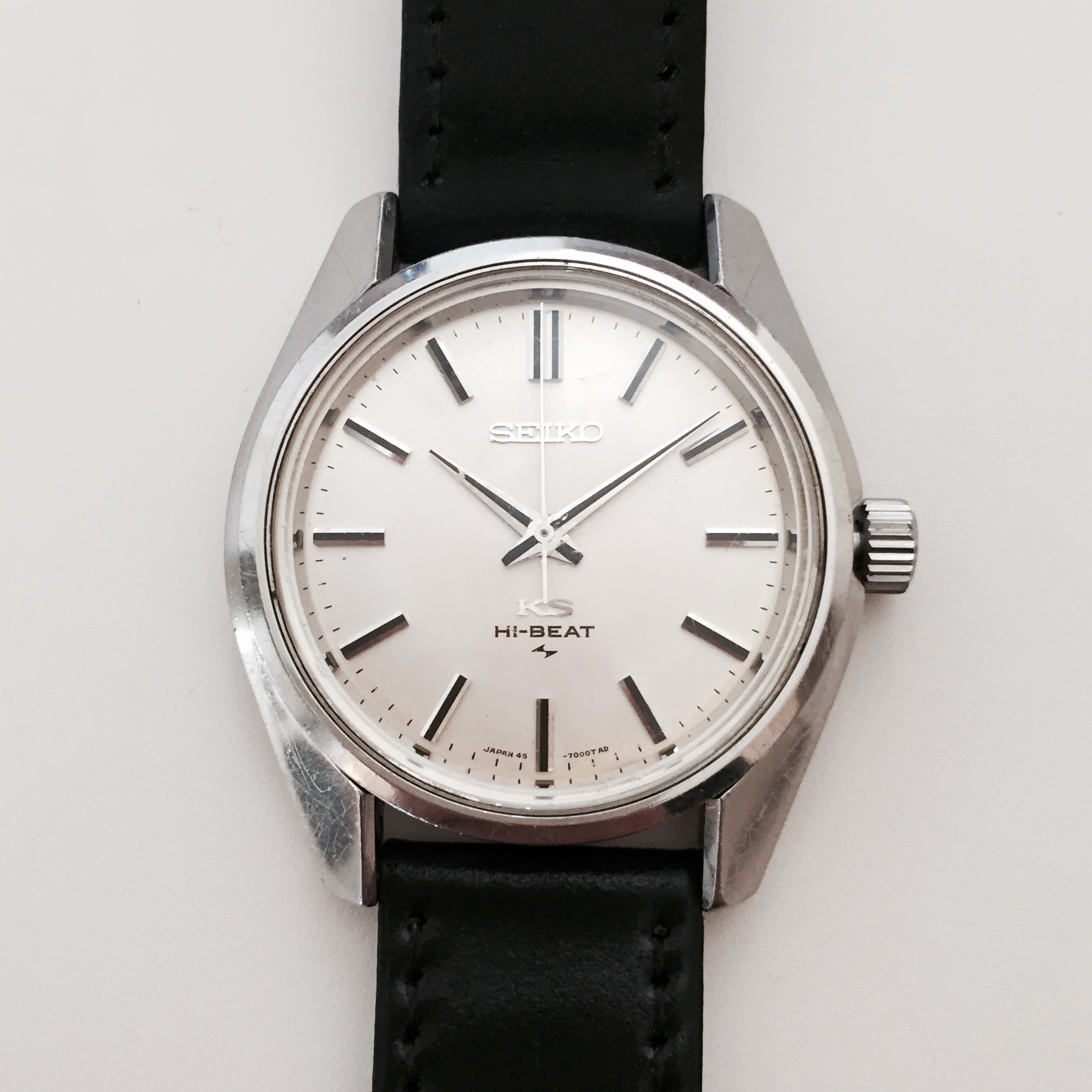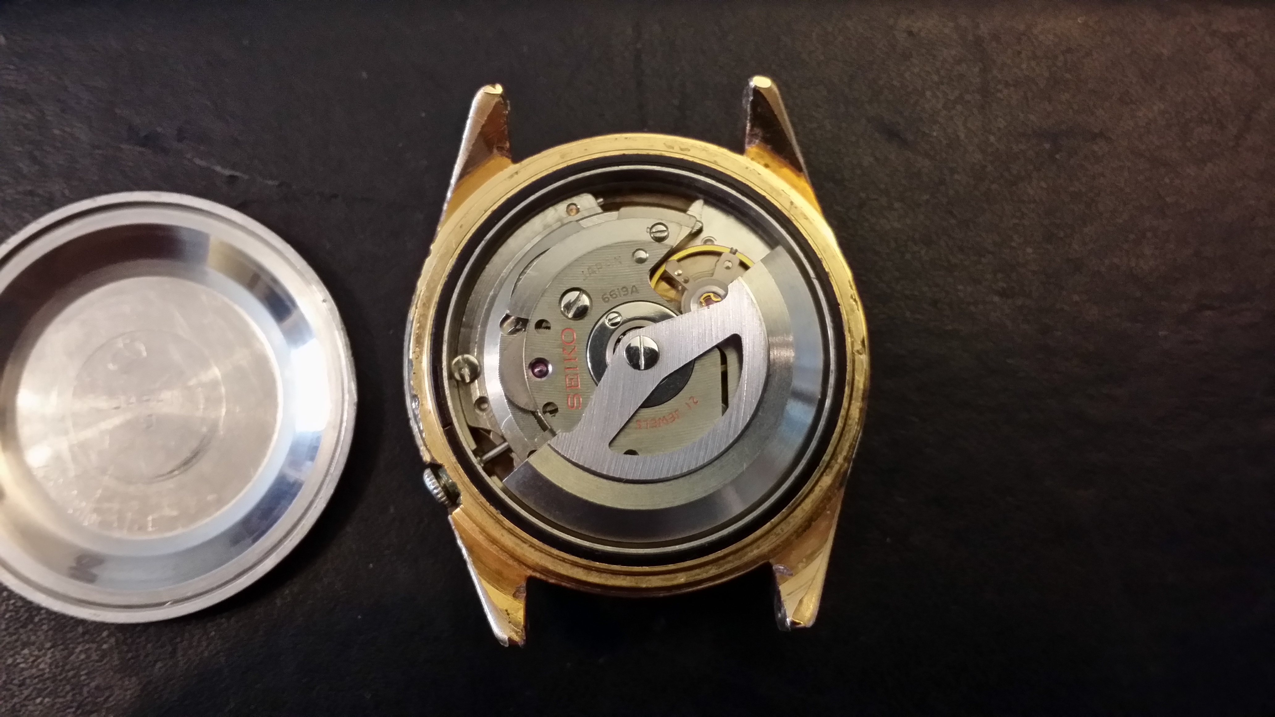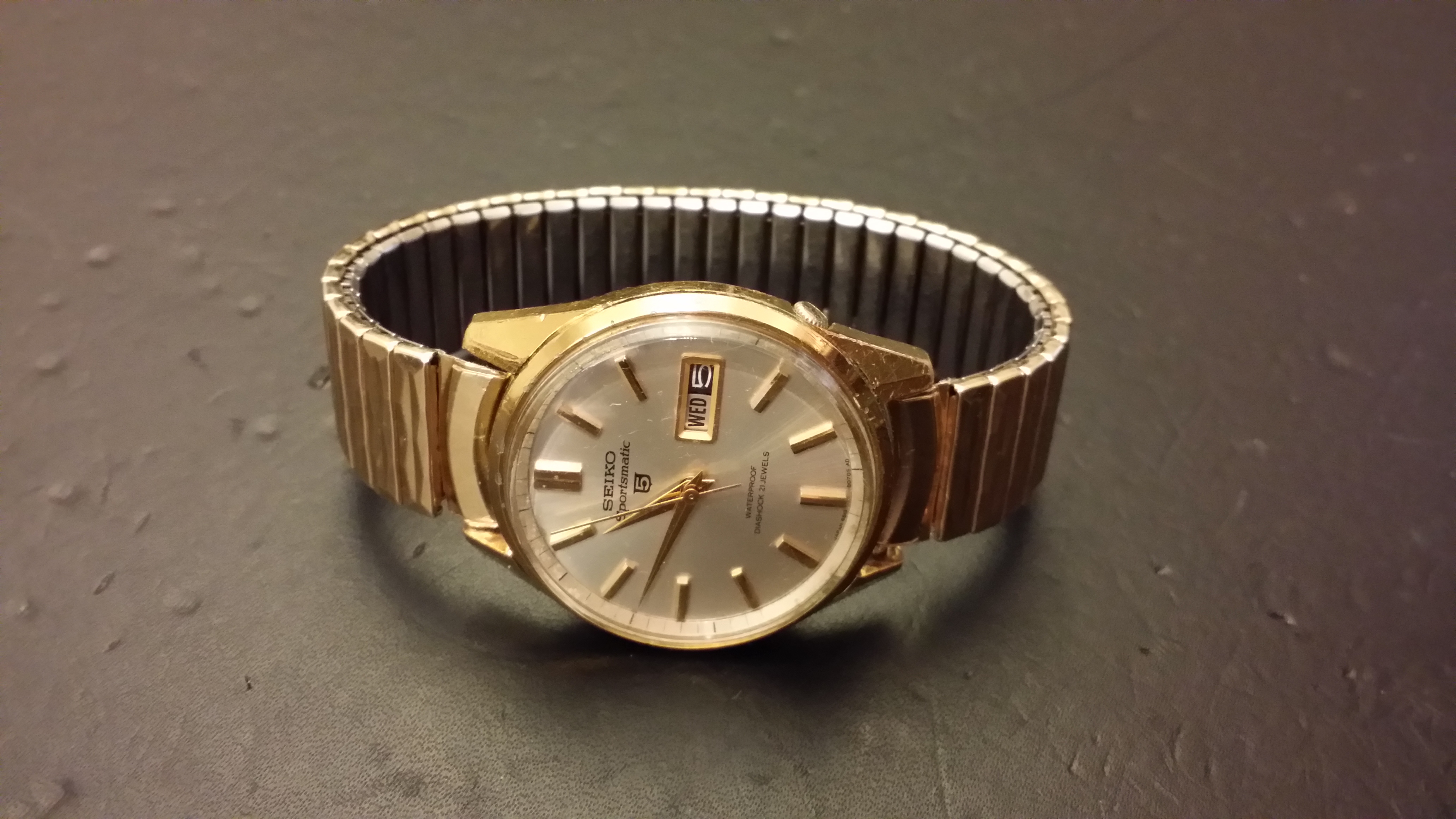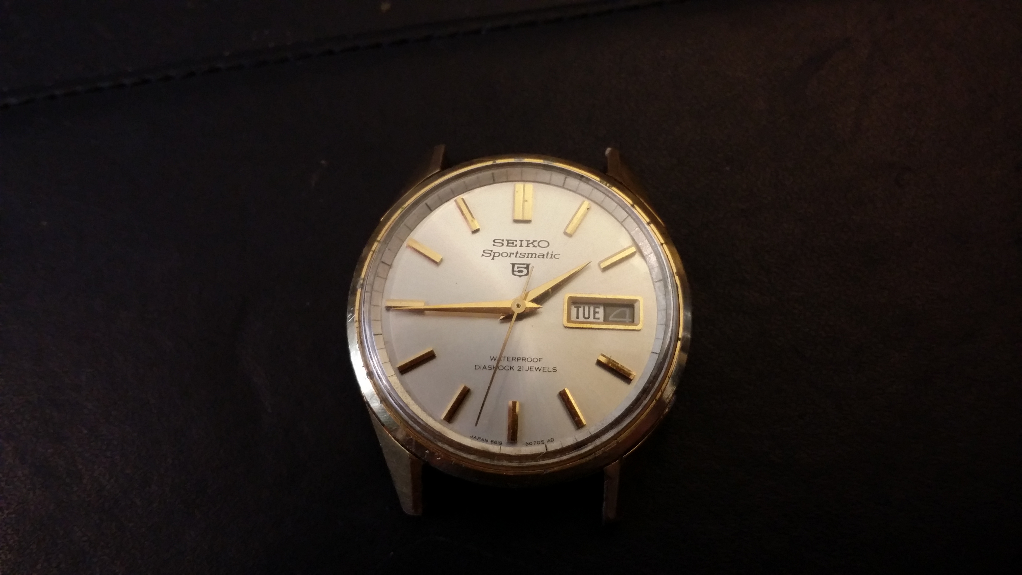 路$5 at the local flea market. Head only. July 1967 Sportsmatic 5(6619-8070). Last service mark was from 1992. A little beat up but crystal and dial are clean. Movement is clean. Put straight on Timegrapher...0.2 BE, ~9 secs/day. Pinned on an old stretch band and off I go! Everything works, runs like a champ.