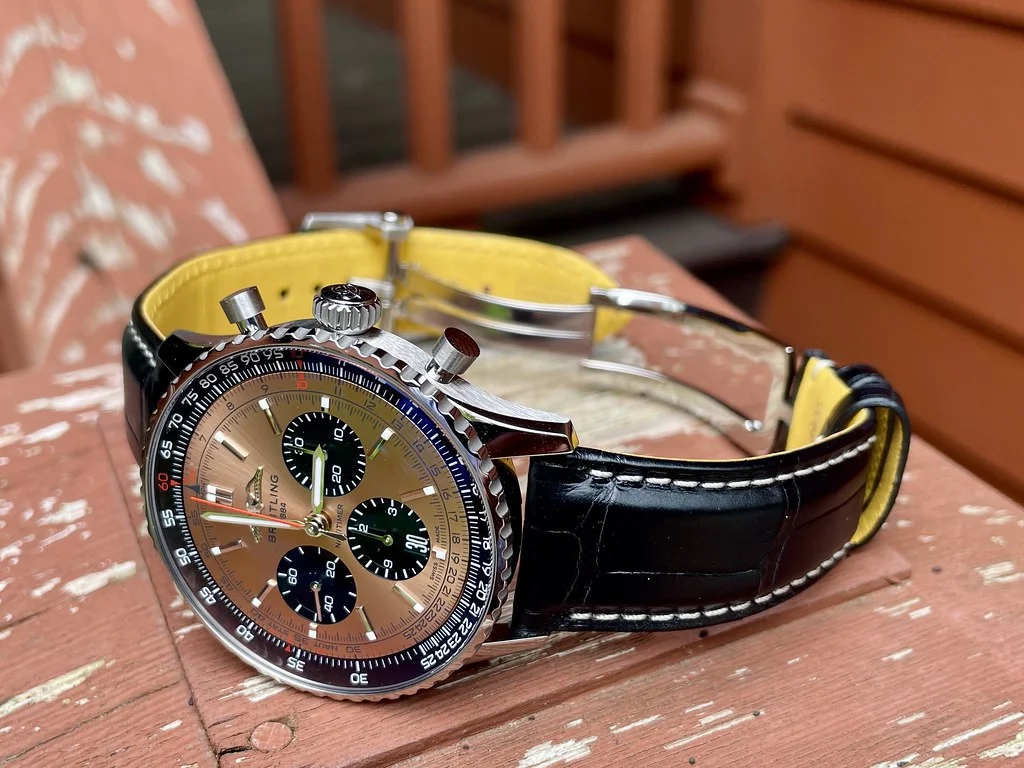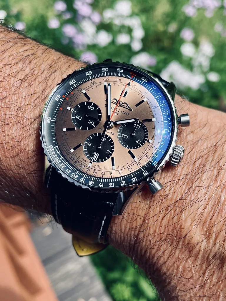 The look in person is tons of fun. You know how the new "First Omega In Space" presents sorta like a Speedmaster Pro in chic clothes? This Navitimer comes off a lot like that.