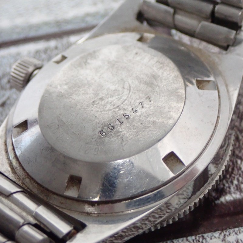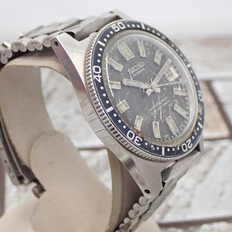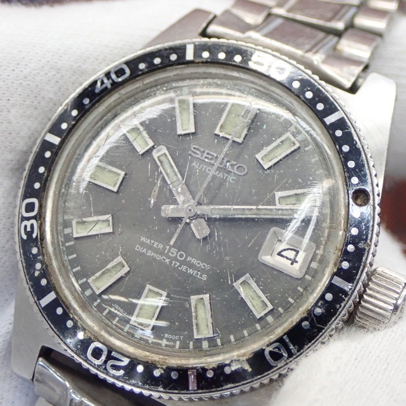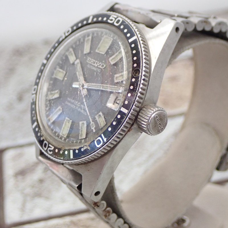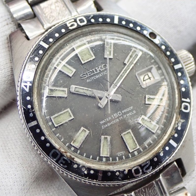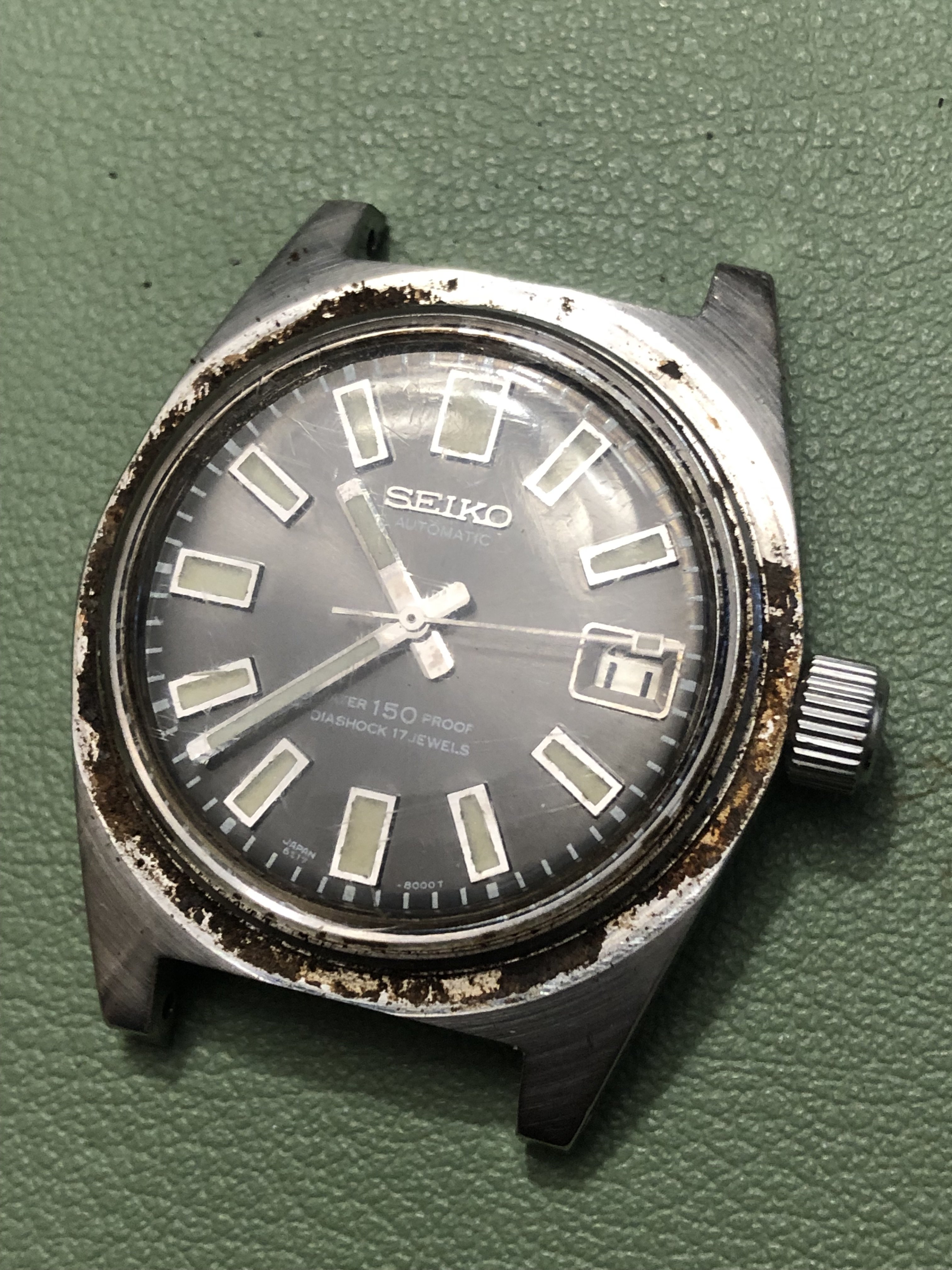 In my opinion, the case is sharp and there may be a nice dial. The bezel is damaged and the lume pip would need some attention. Although a pristine bezel would be nice, I think I'm alright with the bezel condition on this sort of diver. Some mold on the marker/hand lume, but not the worst. I'm not the best judge of this, so perhaps folks can chime in. Case back etching is somewhat worn and obviously it would need a service for regular wear.
