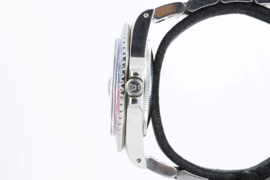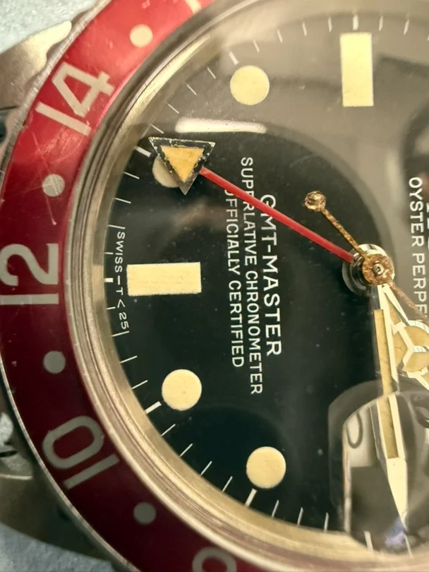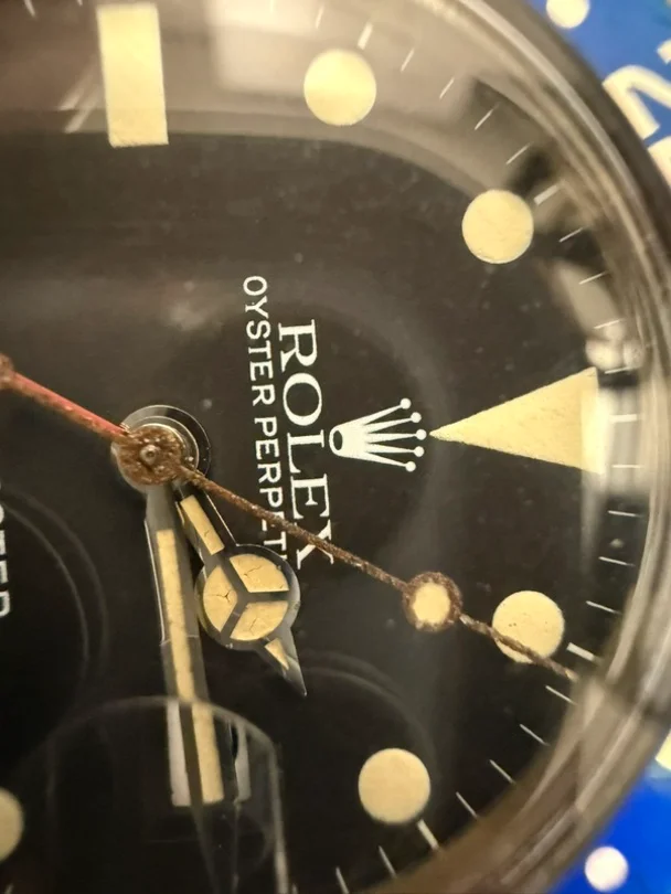 The dial also looks nice and is period correct for this reference. I can't tell if it has chips, blemishes or missing lume which is extremely important. The hands are not attractive and is what holds this watch back. I suspect, they were relumed in past; the composition of the 24hr hand is different and the lume on the hour hand is cracking which is indicative of cheap relume job. Regardless, I would be looking for genuine replacement for the second hand as its not worth salvaging and reluming the other 3 hands to color match the dial.
