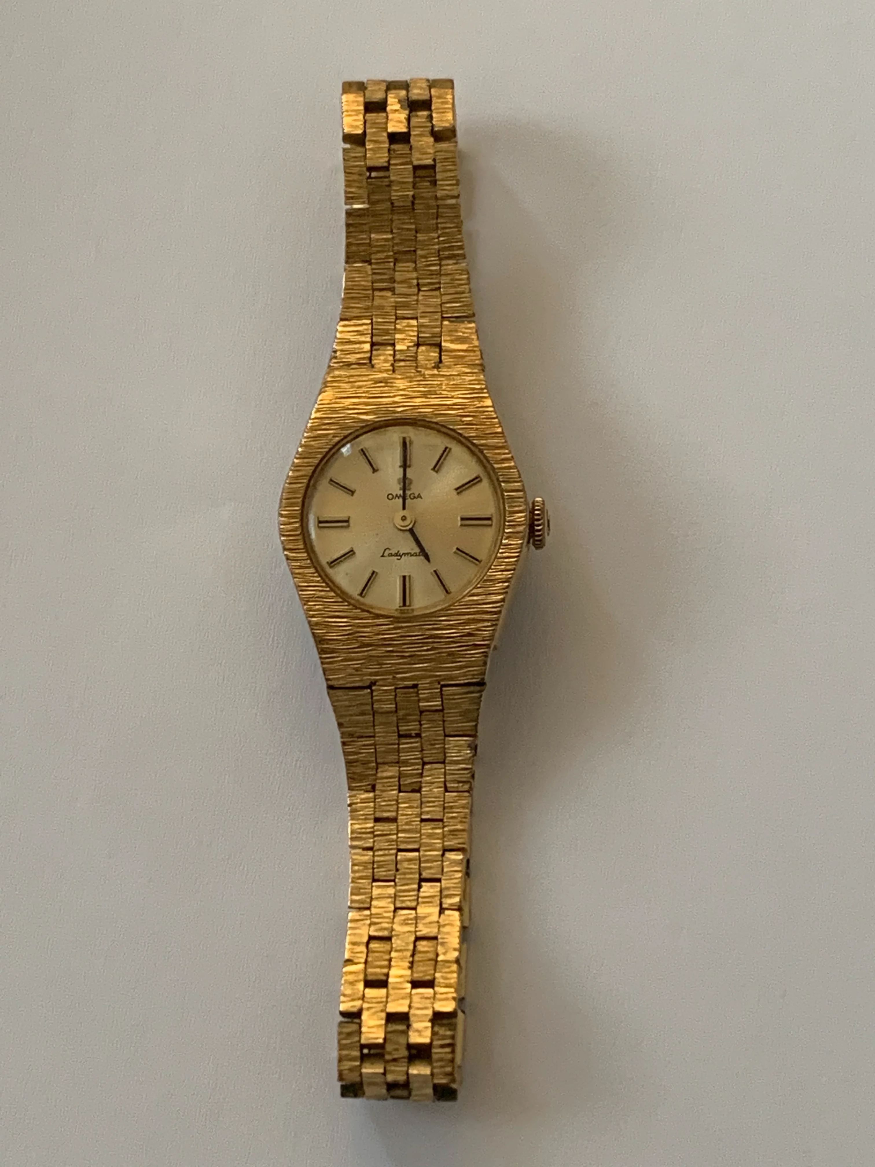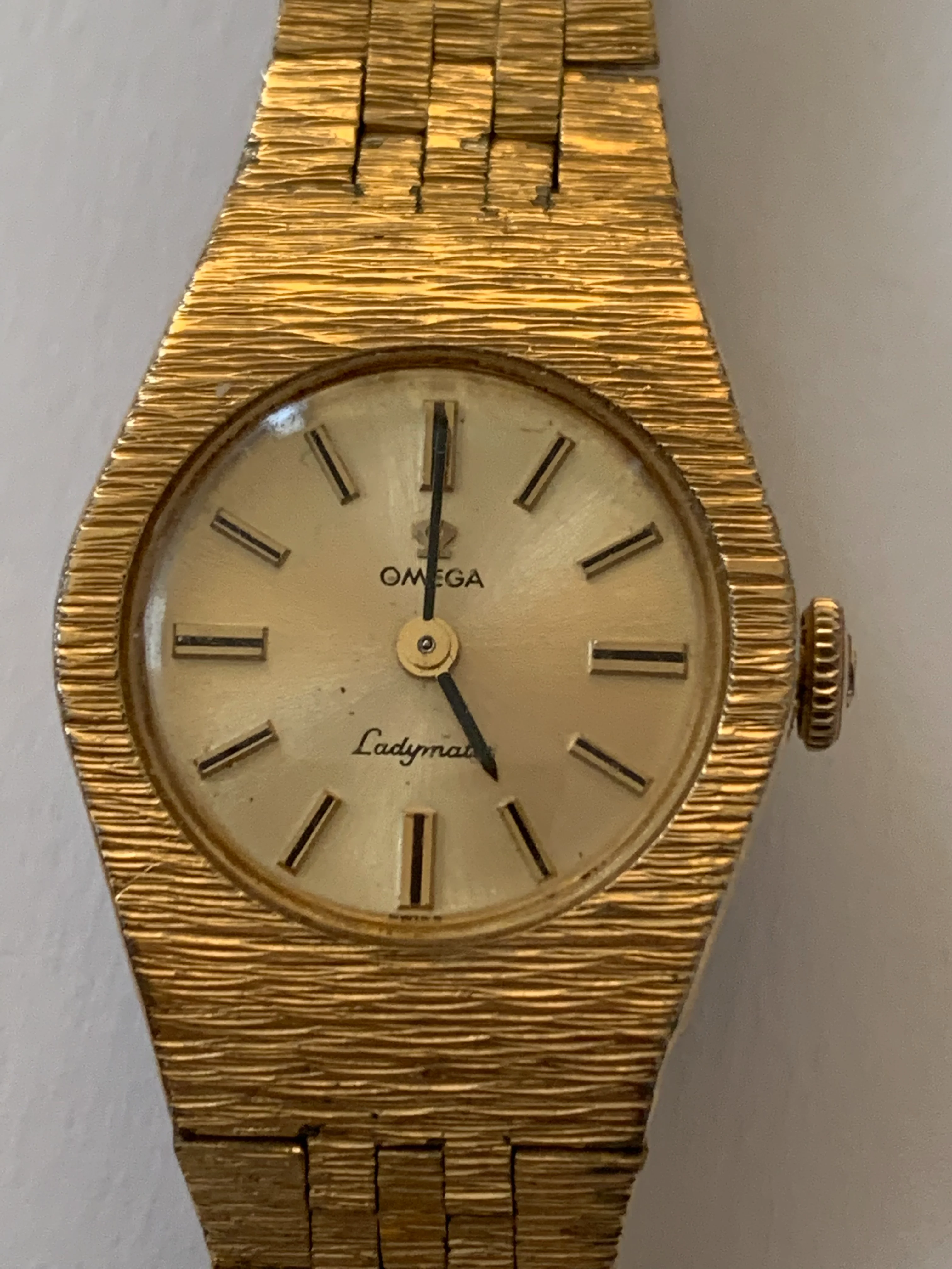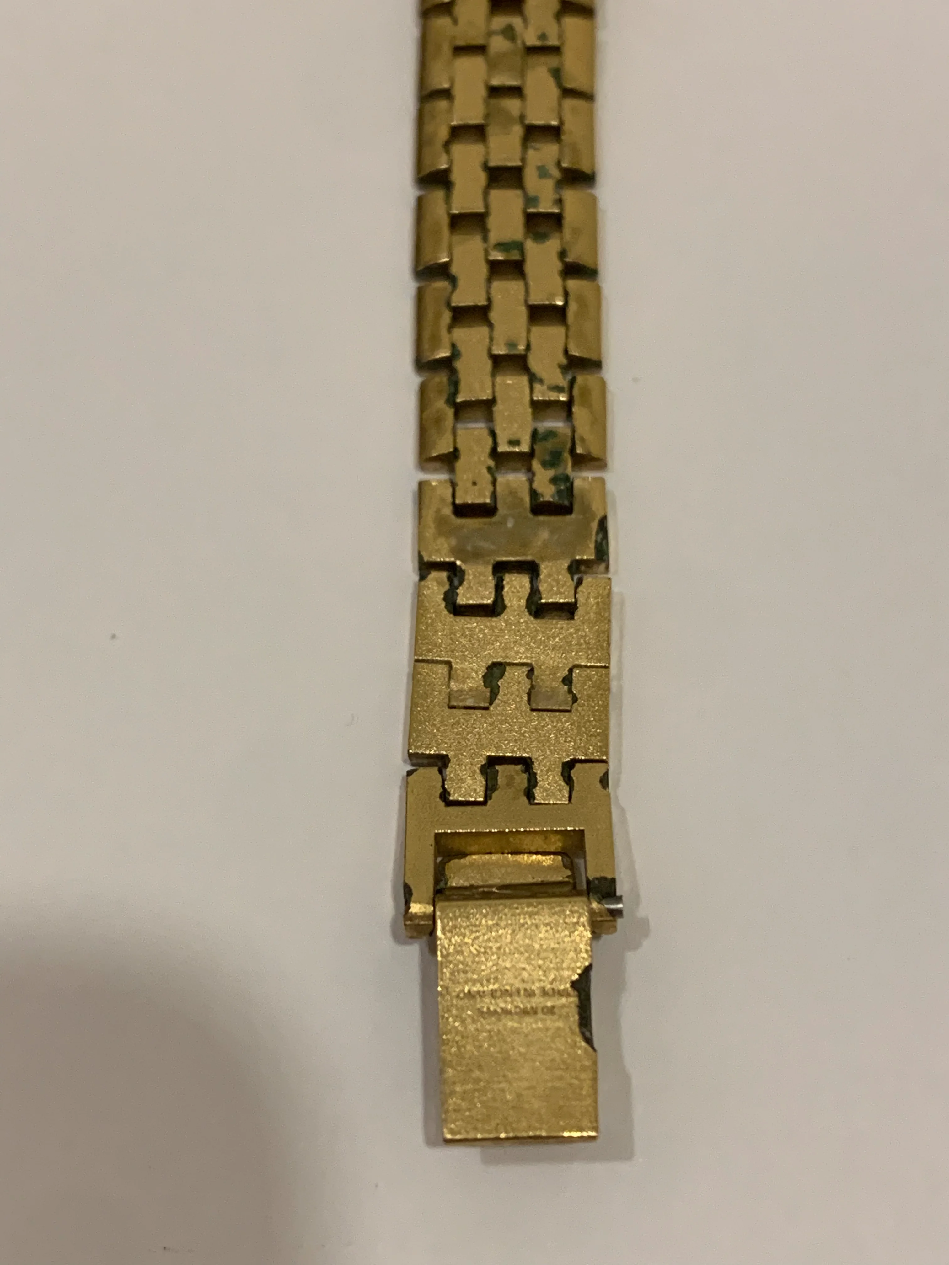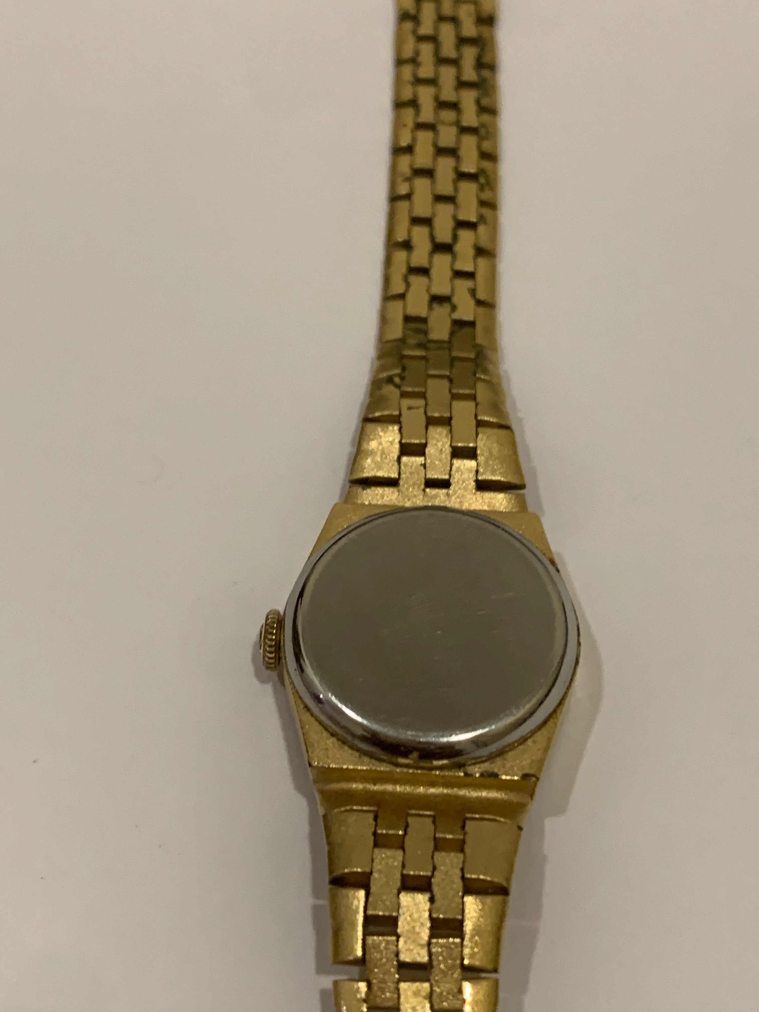 The printing on the buckle might say 9, 10, or 14 karat, but I think I can see the word MICRON. That means the watch is only gold plated, not karat gold. The finish on the under side of the bracelet is sadly very deteriorated, leaving patches of the original plated finish, but also voids in the plating where the brass has seriously corroded away. In addition, the hinges in the links are quite worn. I think you paid the “newbie” tax on this one. If the lady knows you bought it, it is too late. But if she doesn’t know you bought it, I suggest you stick in your sock drawer, and look for a better example. This watch would not be comfortable to wear, and it will turn the wrist green. Don’t consider having it plated as that will only be temporary. This watch has a lot of miles on it. I have given you a run down on what can be seen externally, and I’ll bet there is a plethora of ills with the mechanism, as well. Basically, you bought someone else’s problem.