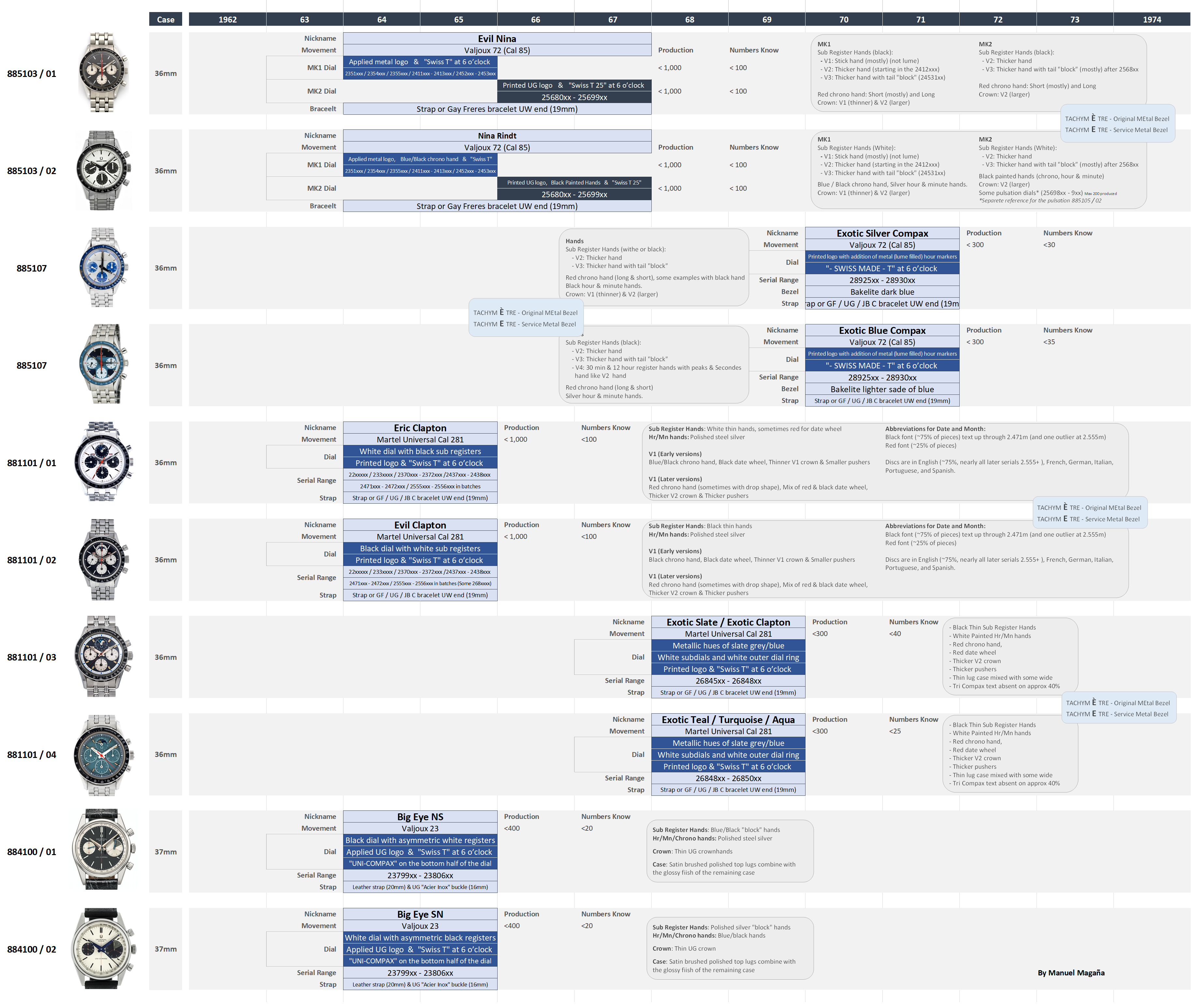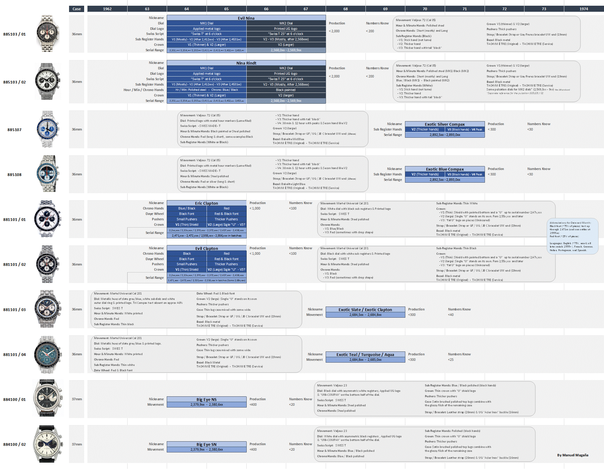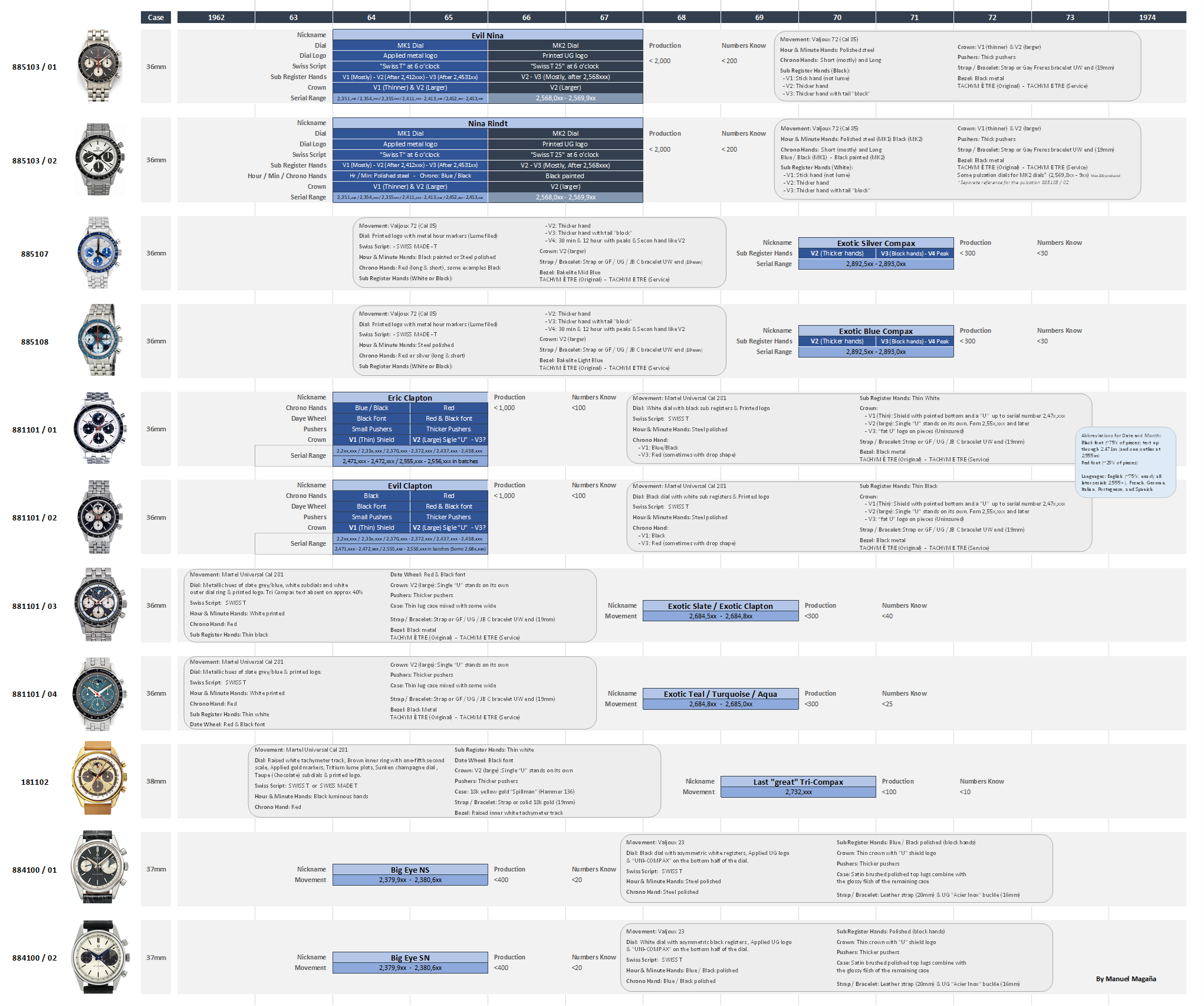 After this idea and inspired by the book "Universal Genève - Ten" by Crosthwaite and Gavin, as well as by alphahands.com, I decided to extend and focus my table on the most prominent and desired Compax, Tri-Compax, and Uni-Compax models of the 60/70s.