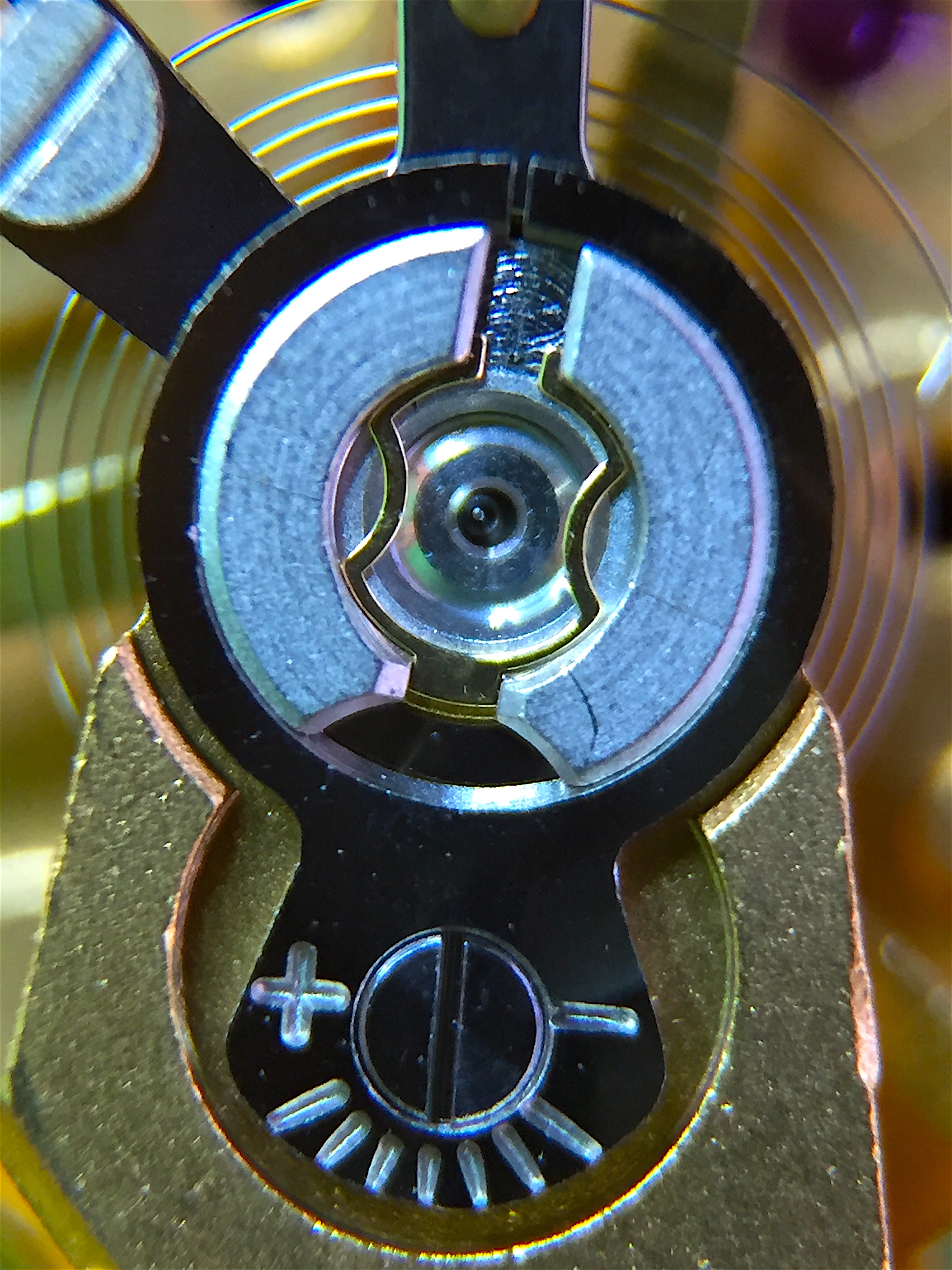 Here you can see the hour and minute wheels and the copper coloured click spring that ensures that the hour wheel snaps into place once an hour when prodded by the big tooth you can see between the upper side of the hour/minute wheels. Hiding below a plain black plate was the date wheel. Looks really simple, can't be too hard!