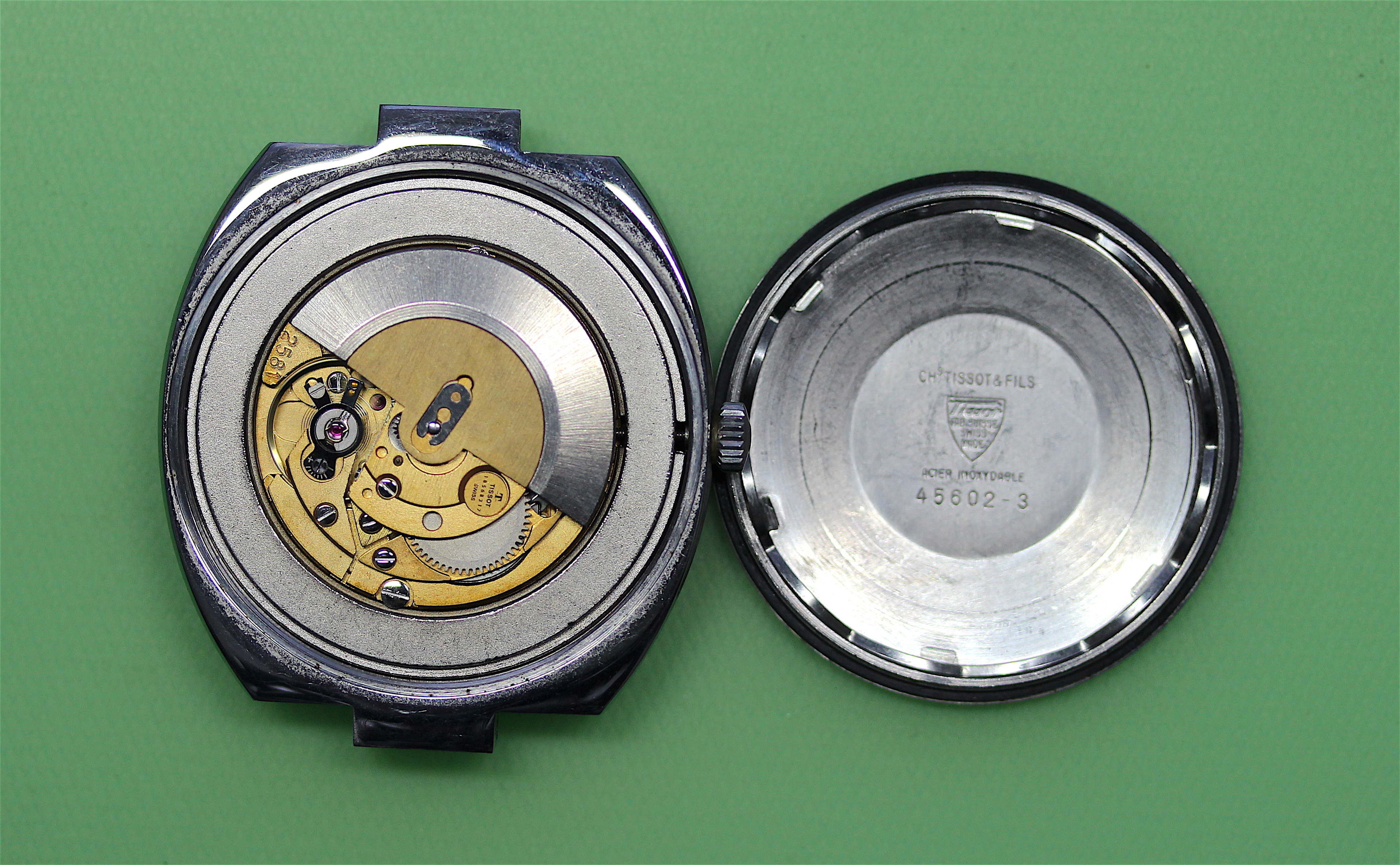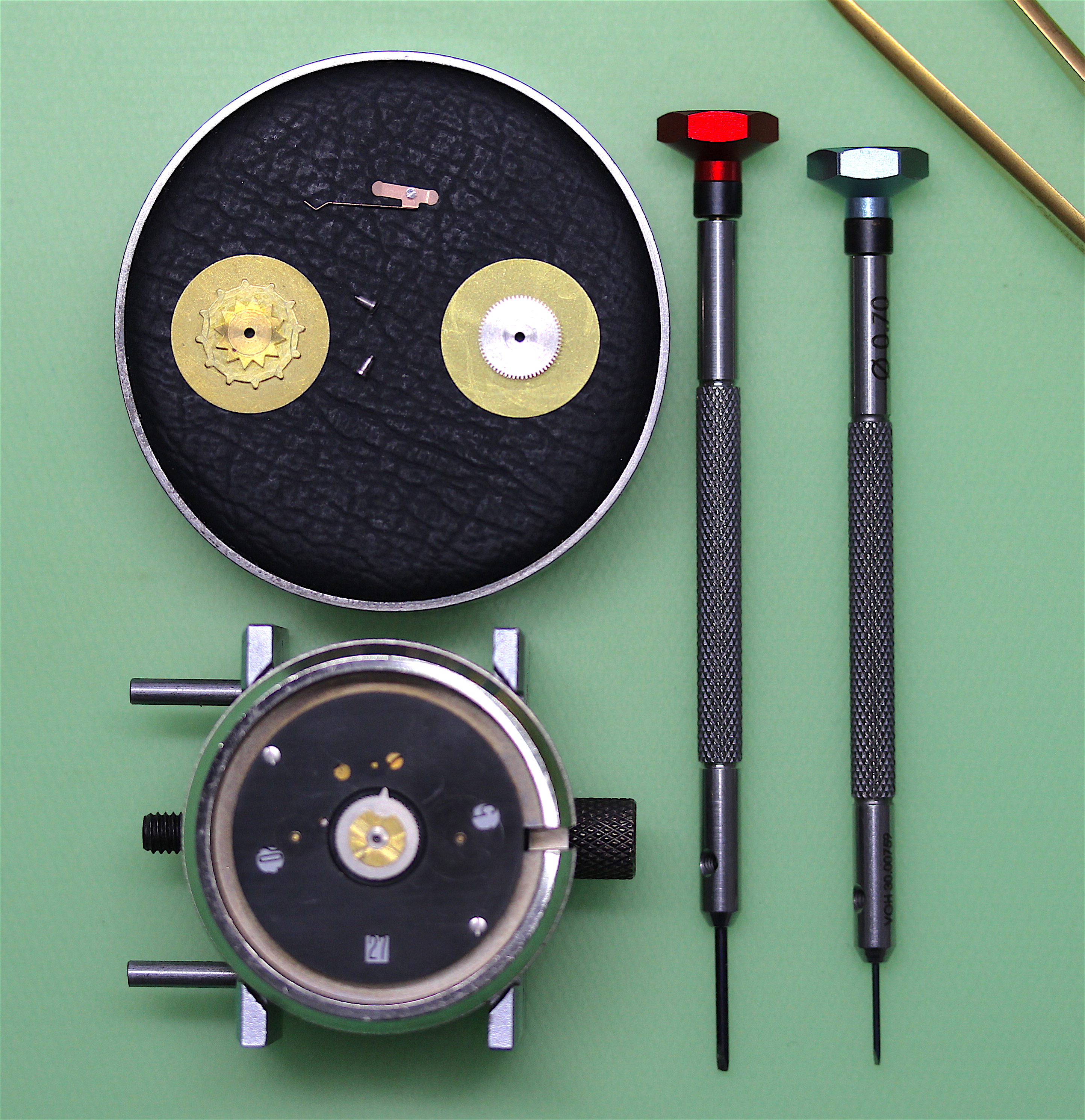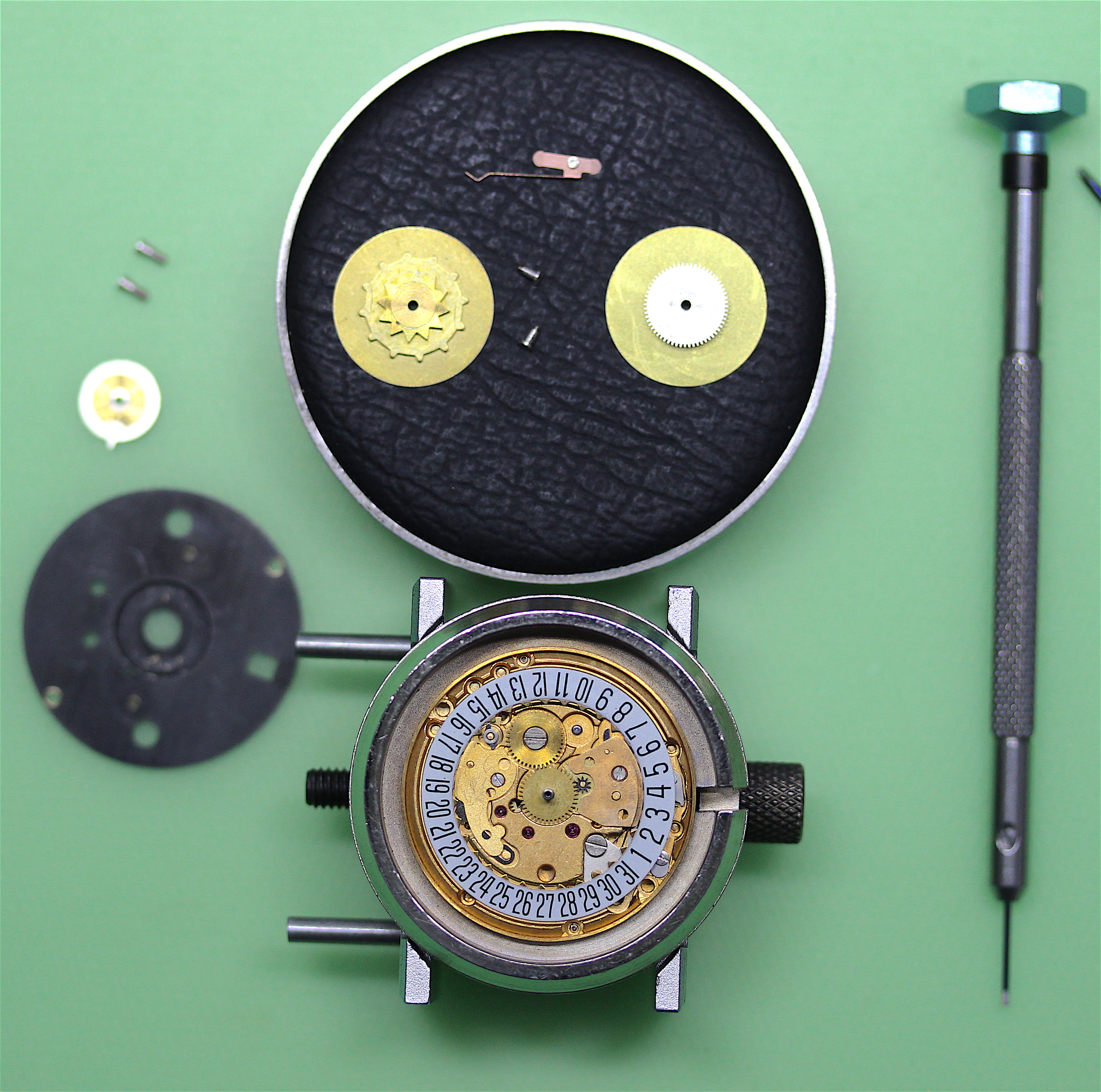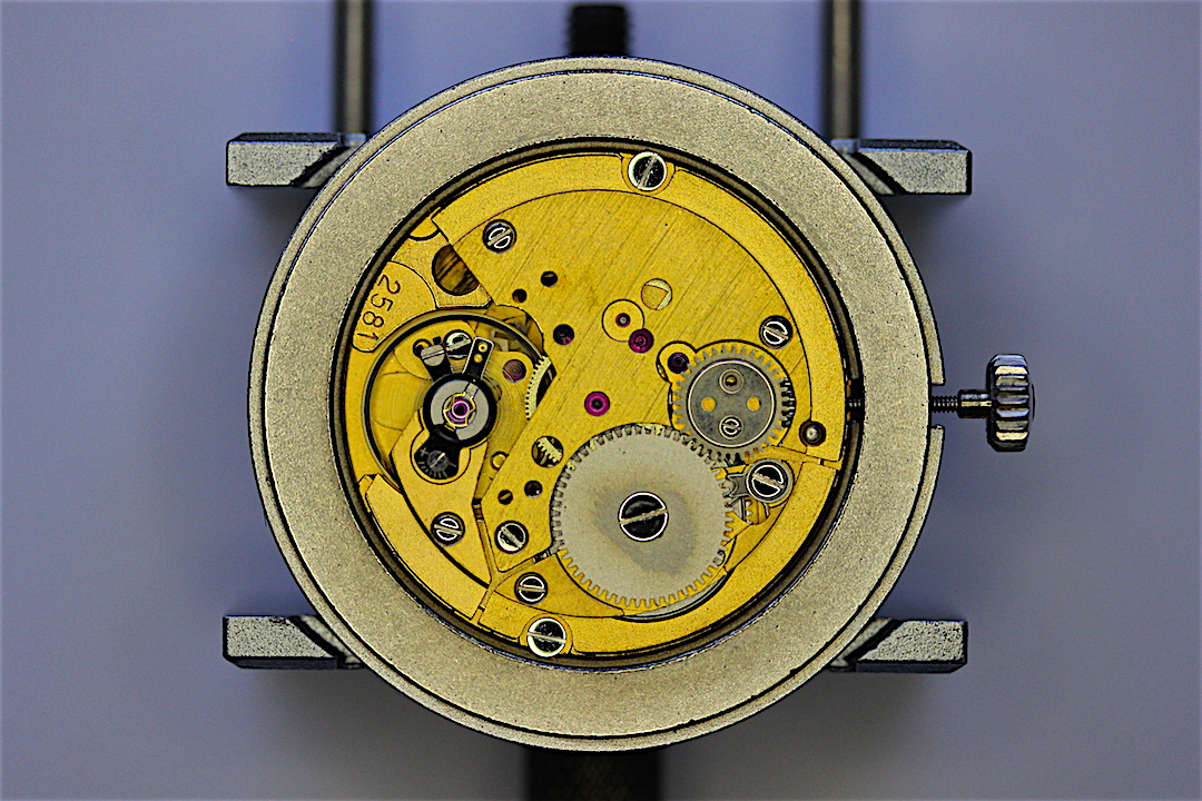 With that done, I was able to remove the caseback which revealed a nice clean movement, Caliber 2581. It was surrounded by a substantial movement ring to which the movement was clamped. I decided to use the ring as a movement holder while I started disassembly.