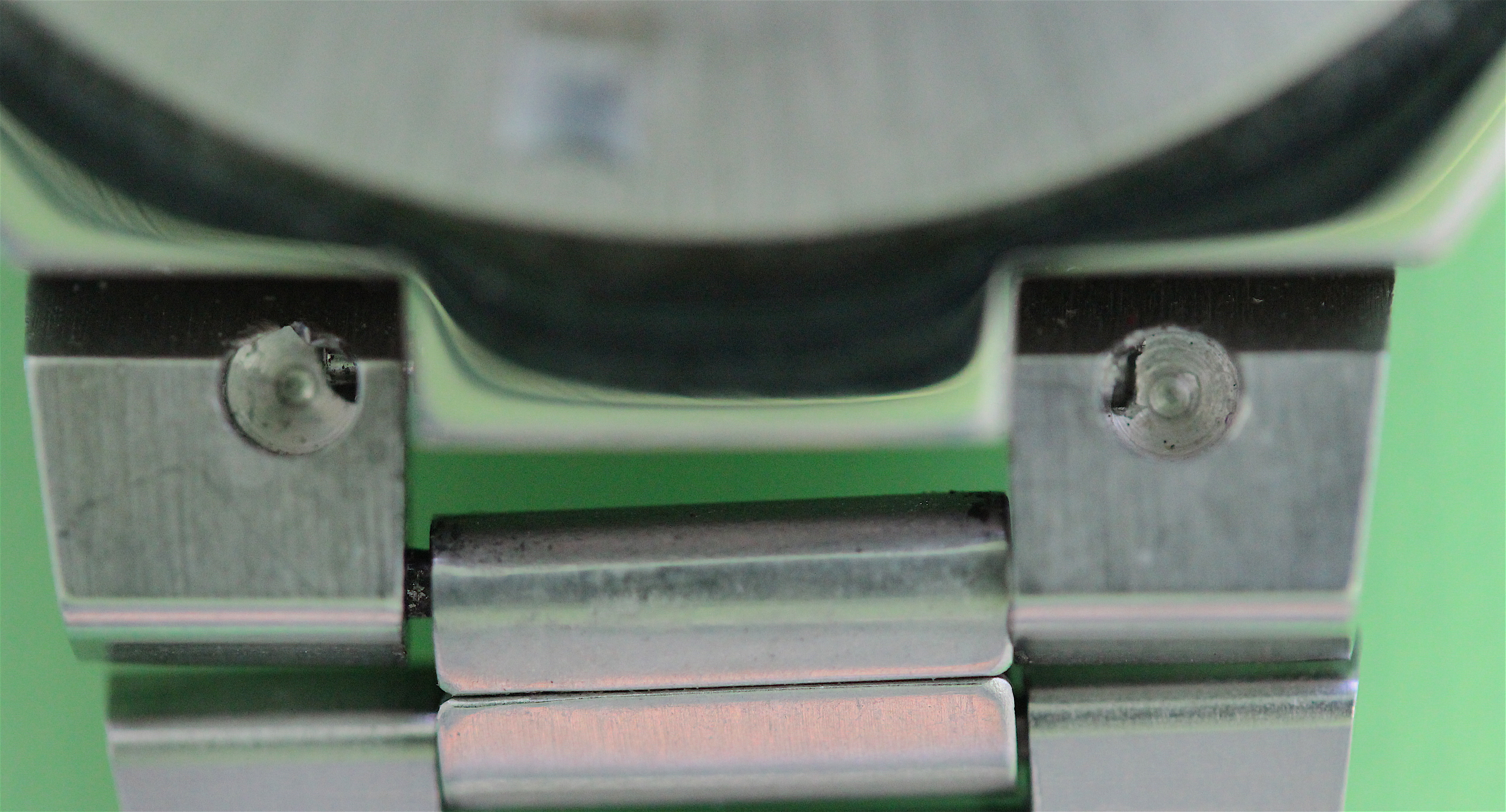 The small spring bar sits in the central case lug and extends into each side of the bracelet end pieces. Access to the spring bar ends is via a blind hole and there are no holes in the outer sides of the end pieces.