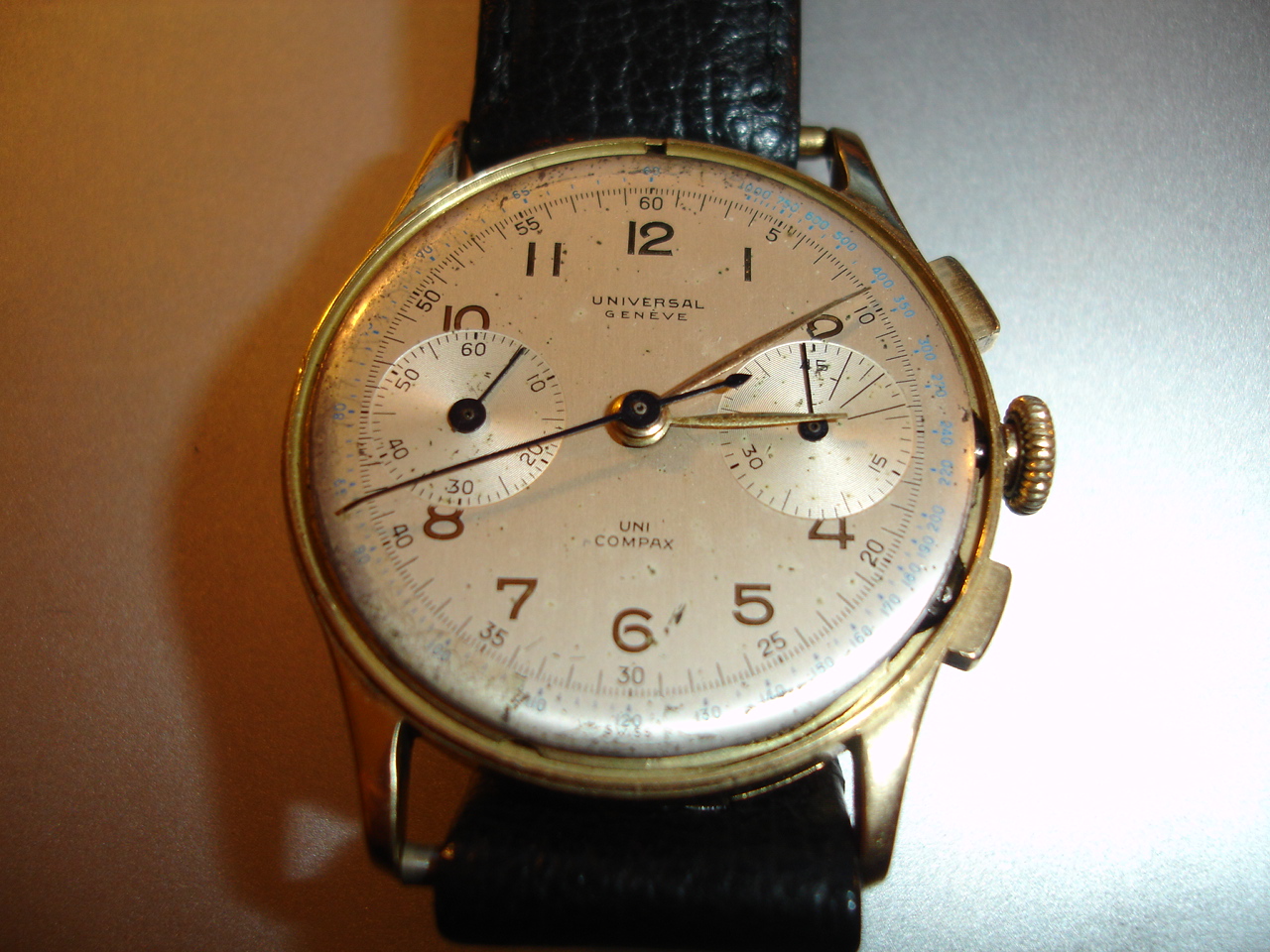 路I was working on my car engine a few of weeks ago and to my horror looked to see I had forgotten to take my watch off. Worse still, it looked to have lost its crystal! Unfortunately, it had gone and with it the bezel too. Two or three weeks of checking the house, office, car, vacuum cleaner bags, garden, regular dog walking route and everywhere else I can think of and no luck. Only minor advantage is the dial is better than I thought, the crystal must have been a little cloudy. Anyone have any ideas re the Uni-Compax script on this watch. Dial looks original to me and has a good deal of ageing, but I don't recall having previously seen Uni Compax laid out one word above the other before. If anyone has any ideas of where to find a bezel, I'd be very grateful!