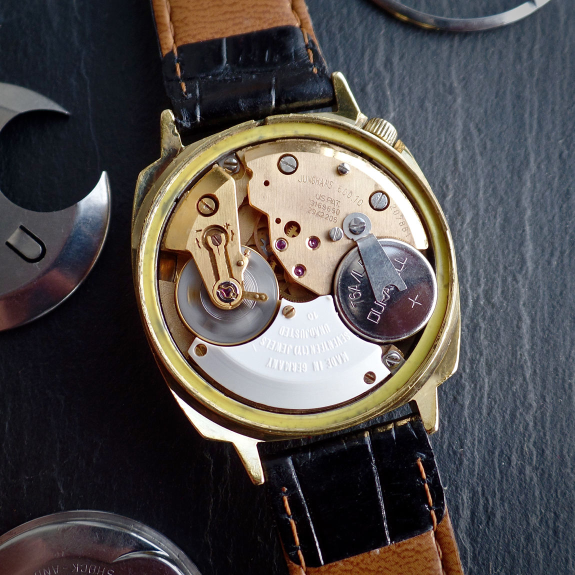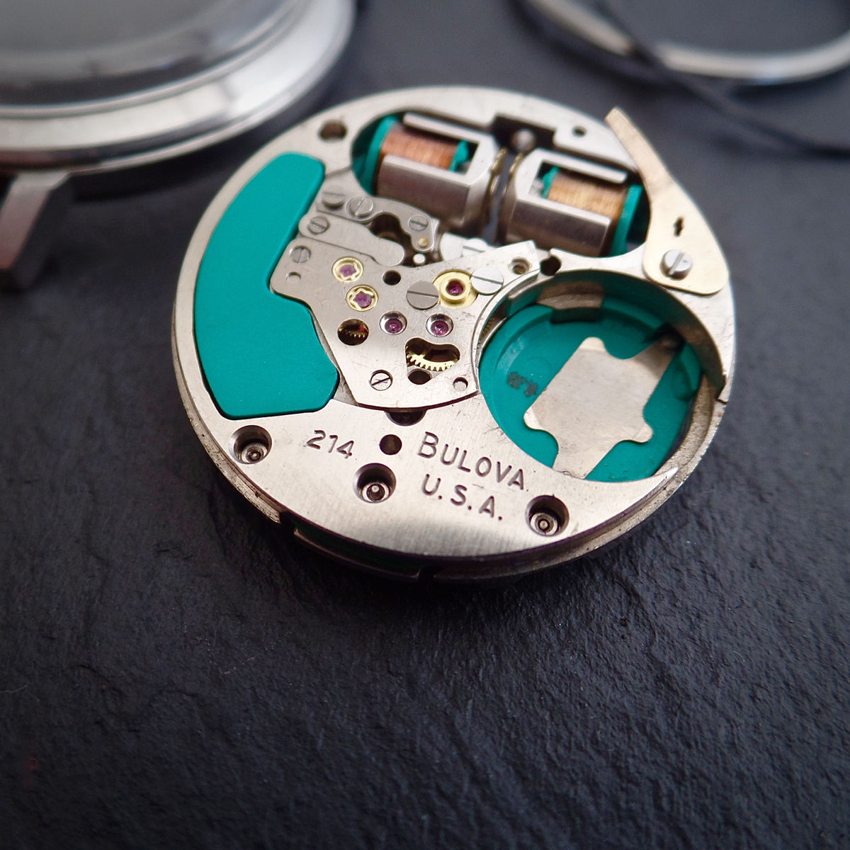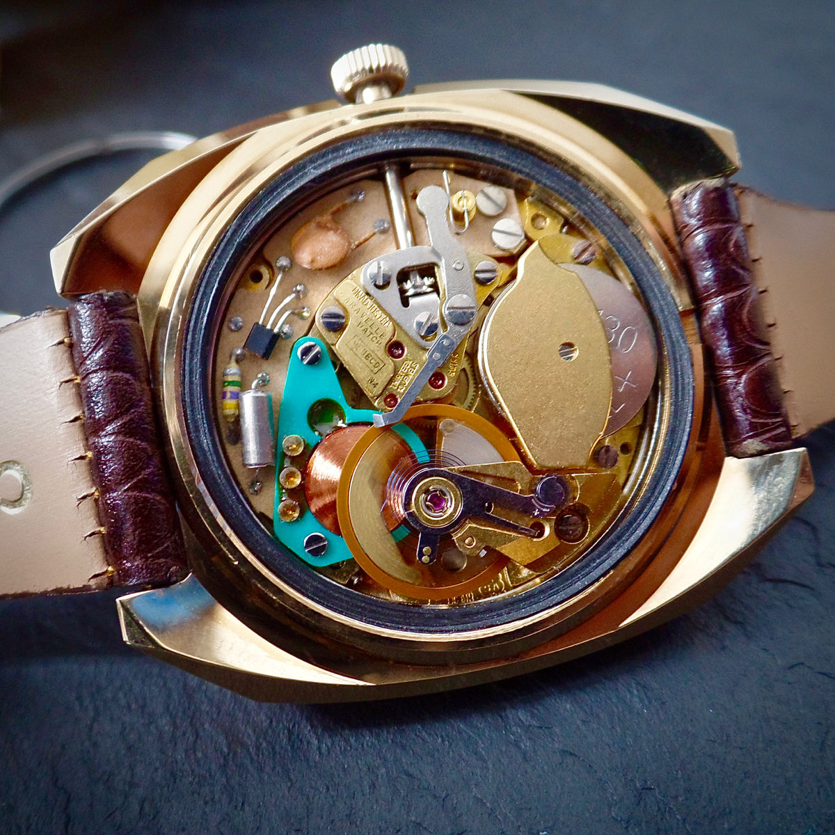 In an experiment to increase profitability, Hamilton purchased some Huguenin Electric movements containing the Landeron 4750 caliber. Like many Swiss movements such as A. Shield and Font, Huguenin produced commodity movements.