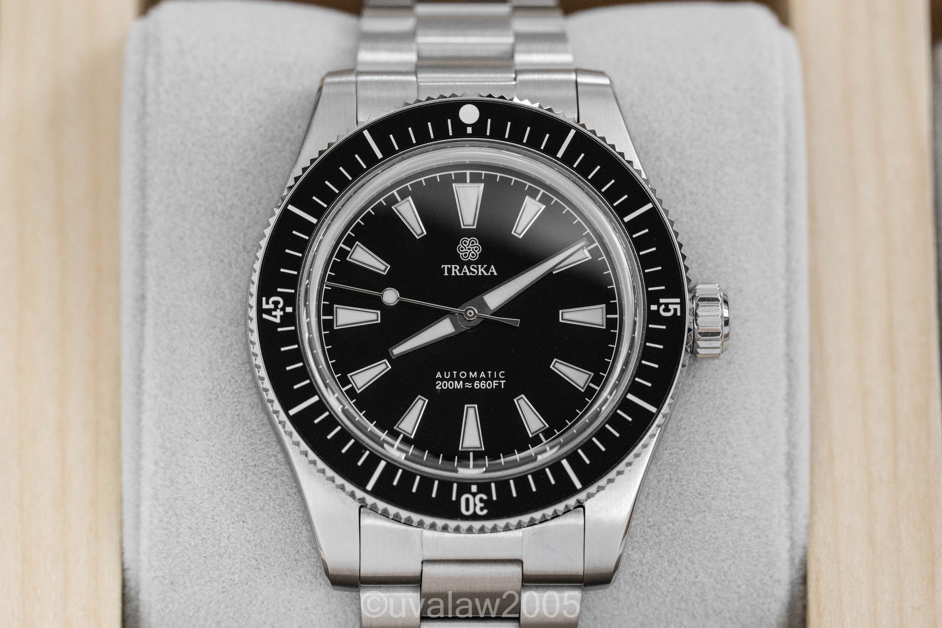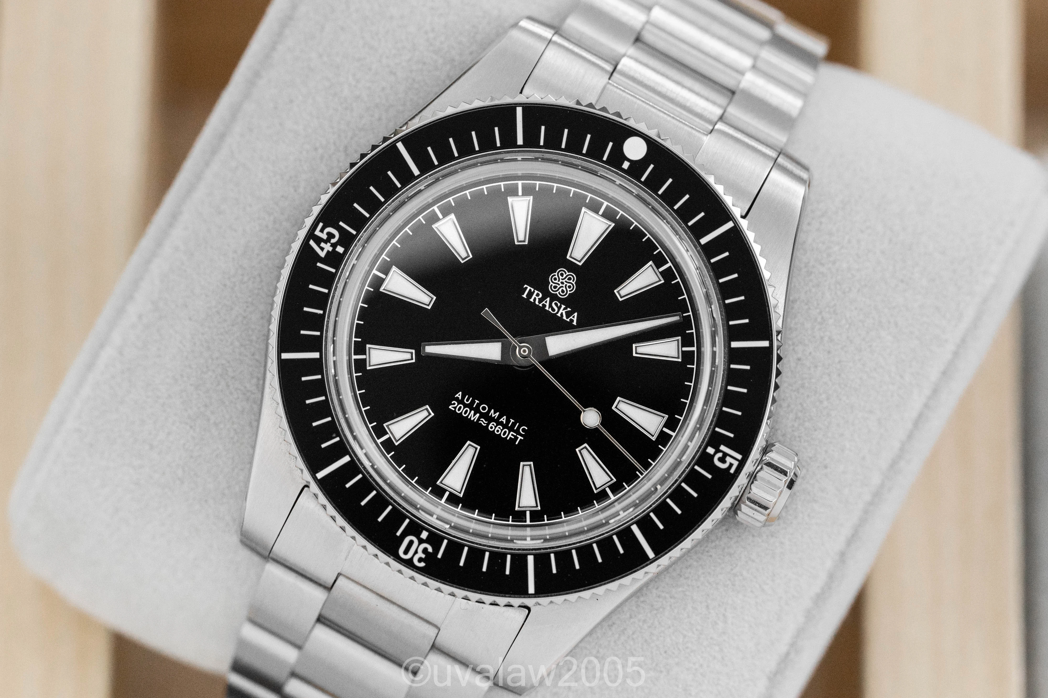 ยทFor sale is my no-date Carbon Black Traska Freediver in near mint condition. This is the latest model, ref. 1187, purchased new last month direct from Traska. Three-year warranty good through September 2028. Comes with box, travel pouch, all bracelet links, and original sales receipt.