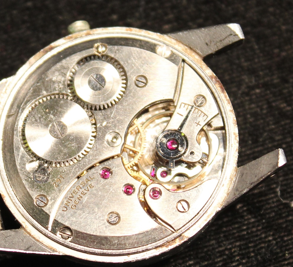 Hour and minute hands are poor replacements. These are "stick" hands rather than Universal's lovely "leaf" hands. The subdial hands look correct.