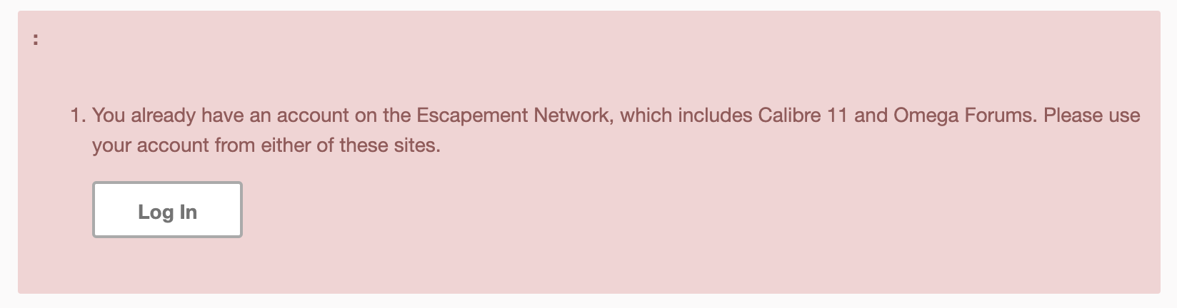 ·Is anyone else having trouble logging into the forums? I get the following message when I authenticate: "You already have an account on the Escapement Network, which includes Calibre 11 and Omega Forums. Please use your account from either of these sites." Interestingly enough, I can use these same credentials on the Calibre 11 site, but not Omega Forums.