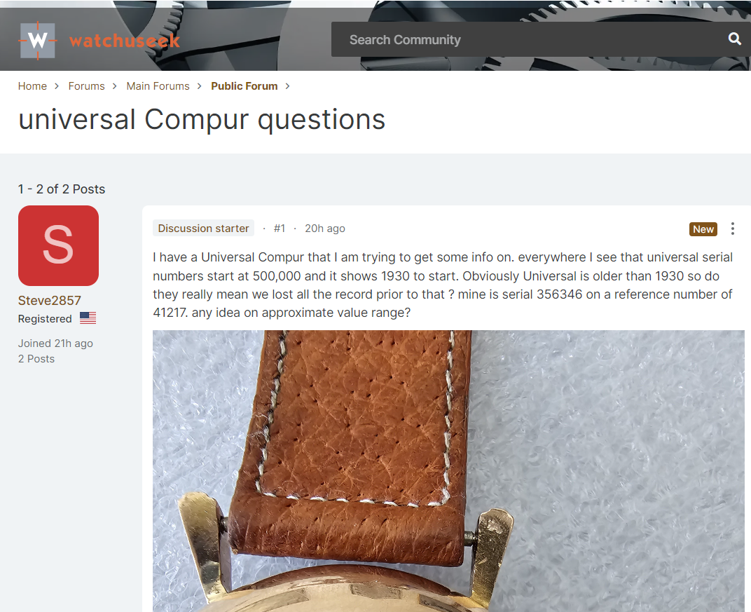I am trying to figure out the year of my Contour but everything I read says that Universal serial number started at 500,000 yet mine is serial number 356346. Anybody have any ideas ? It shows the serial as 356346 over ref. 41217 it is a 18k rose gold with a black dial and square pushers.
