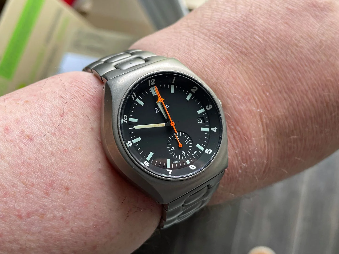 But I still had a serious itch to scratch. Remember the Military Chronograph? Well, I wanted another one of these too, but this time a slightly different model. First, I wanted one made out of titanium. But that was not all. Tutima had also made a "mission timer" variant for the ZUZ, the German border guards commandos. Apart from being good at their job, these guys must be some serious horology freaks, because they had previously had another watch made for them. It was by Sinn, and it is the legendary EZM1. So that Tutima, known under the name "Commando II" actually replaced the Sinn EZM1 on these dudes' wrists. It turns out that the military version and its civilian variant have some differences. The former has a rotating bezel borrowed from the TL pilot chronograph version while the latter doesn't. What they share is a much simplified dial with both running seconds and 24 hour registers jettisoned, and a much more discreet date window. That dial has a very eye-pleasing symmetry in my opinion, and I remember being absolutely mesmerized when I first saw a picture of one. So that's the one I wanted now.