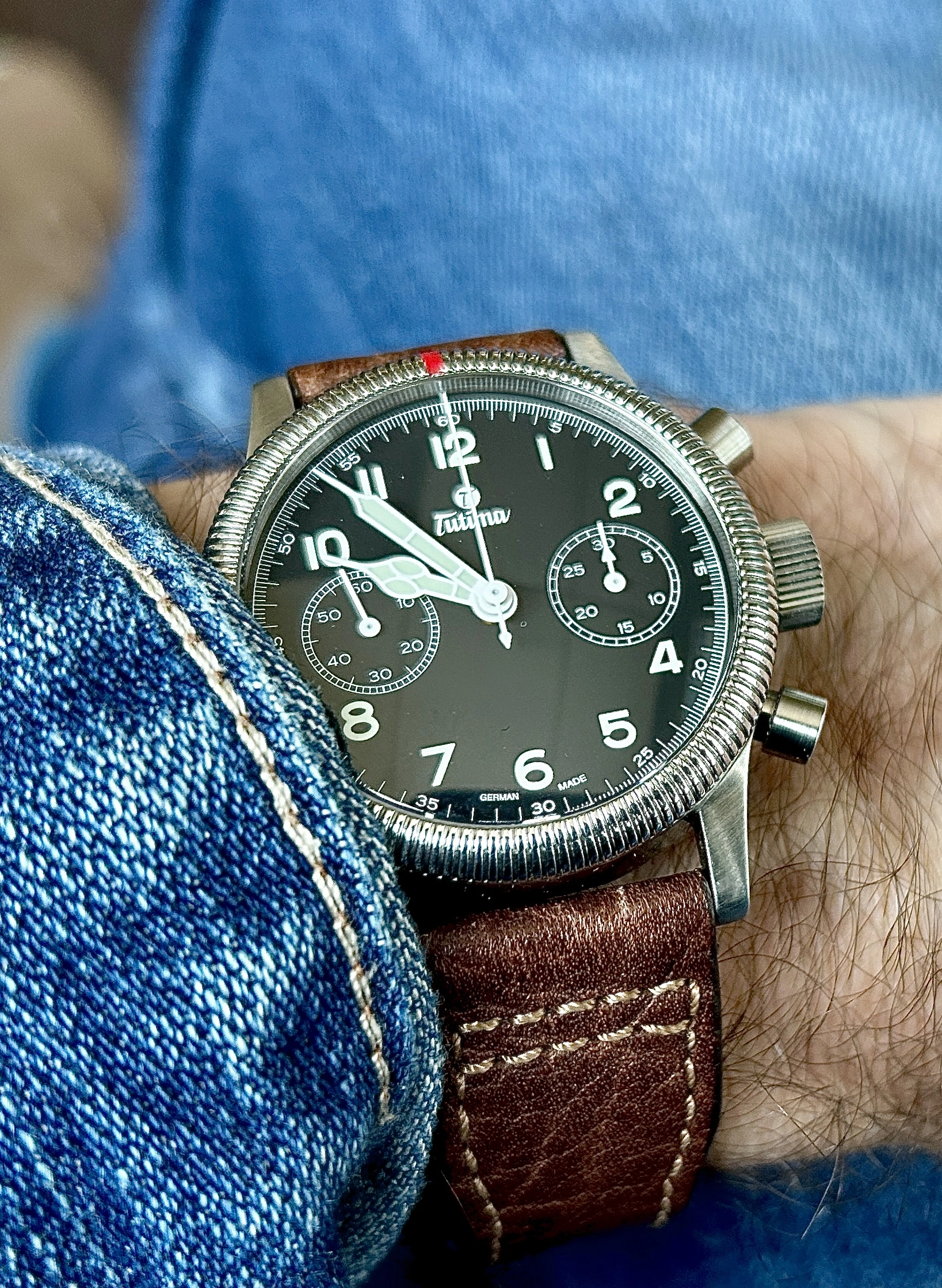 That thing was built like a tank, and this stainless steel version felt like it weighed almost as much as one too. But it was so great that I immediately considered it as my "stranded on a desert island" watch, something so solid and dependable that it could take the abuse. It also got me interested in the history of the brand. Their history with German military pilots actually dated back to WW2 when they supplied the Luftwaffe with their first chronographs, just ahead of competing brand Hanhart. I also learned that they had an actual range of variants of their Military Chronograph, with many available in titanium. On top of that, they had reissued their old Flieger chronograph, first as a manual wind watch aesthetically very similar to the original WW2 model, but also as an automatic available in two flavors: with a 7750 in the Flieger F2, and with a Lemania 5100 in the Flieger F3. I knew I had to eventually get myself one of the latter.
