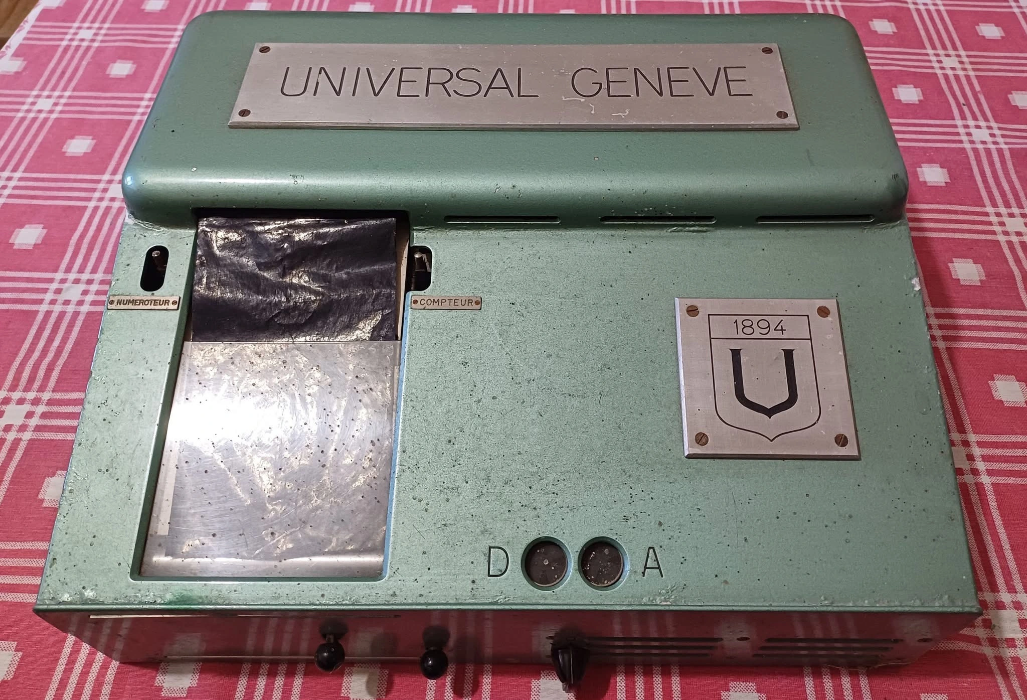 The machine is a fully integrated timing recorder, combining an acoustic amplifier, mechanical chart recorder, beat comparator, and numbering system. It operates similarly to contemporary Greiner, Witschi, or LeCoultre Chronocomparators but bears Universal Genève’s custom branding (“UNIVERSAL GENEVE” plate and 1894 crest). It was used for professional chronometry tests, not consumer or retail service.