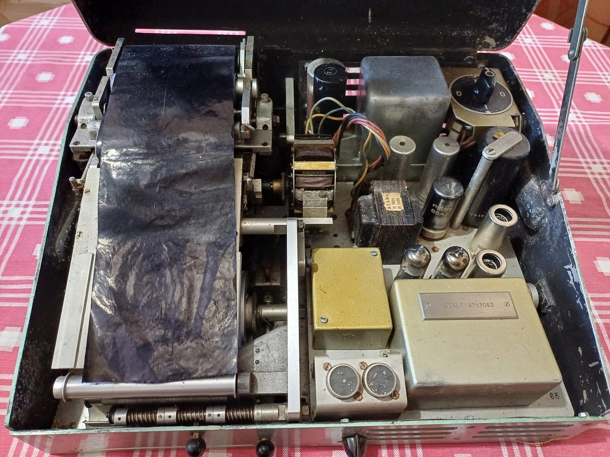 The machine uses vacuum-tube electronics, including a Philips 85A2 voltage regulator and a transformer-coupled amplifier stage, typical of early-1950s chronometry devices. The heavy metal chassis, large paper transport mechanism, and synchronized numbering unit match Swiss laboratory standards of the period. The entire setup was engineered for stability, accuracy, and repeatability over long-duration tests.
