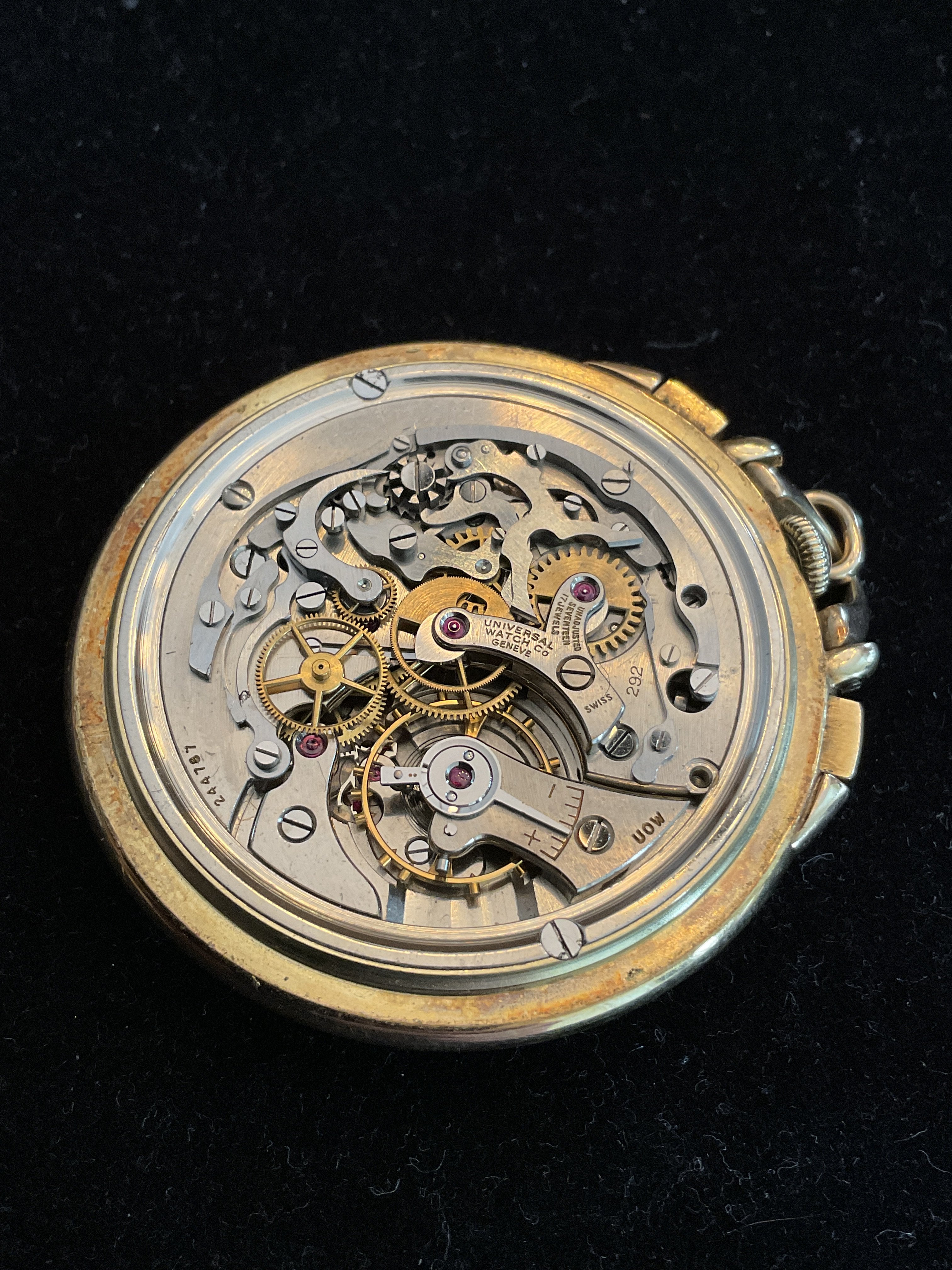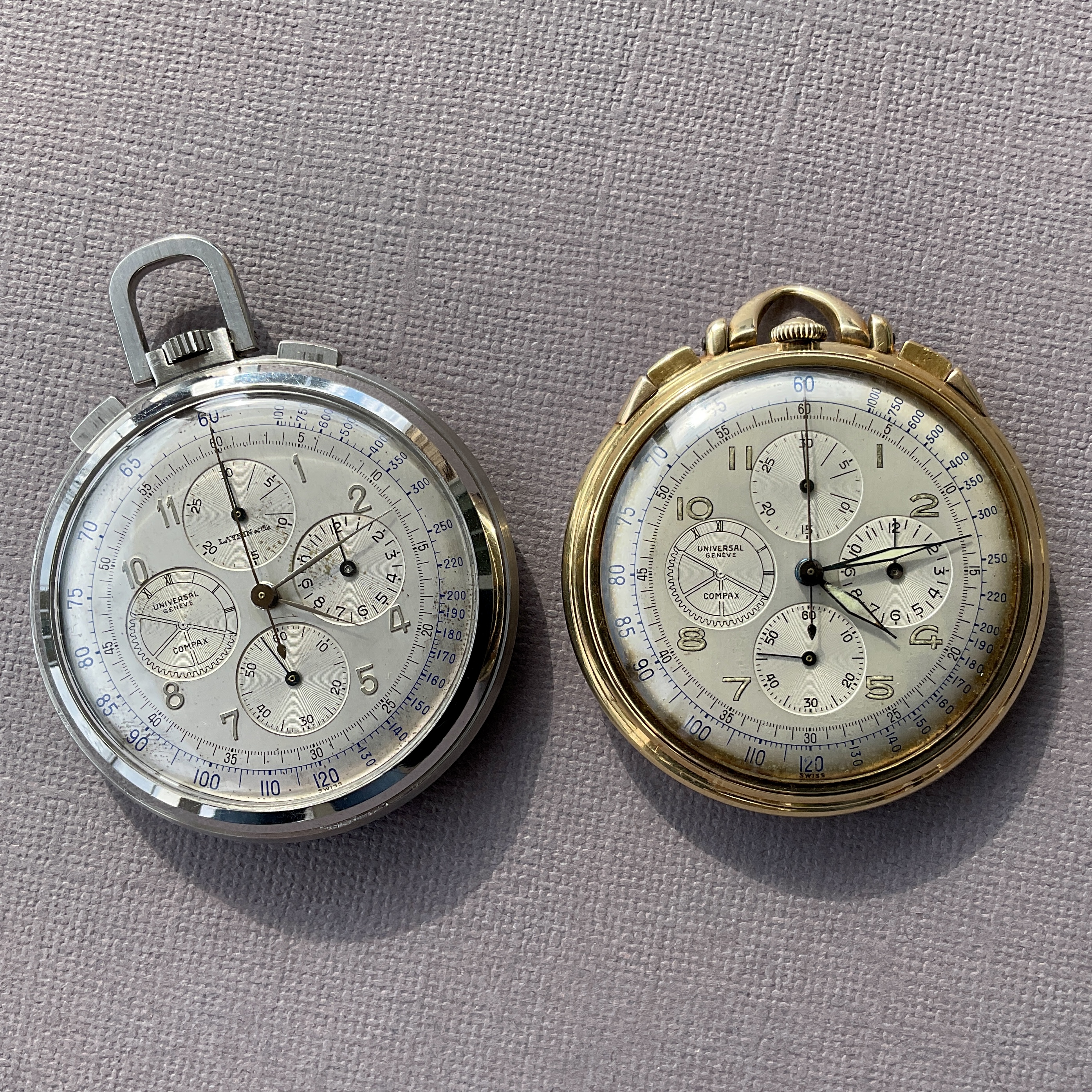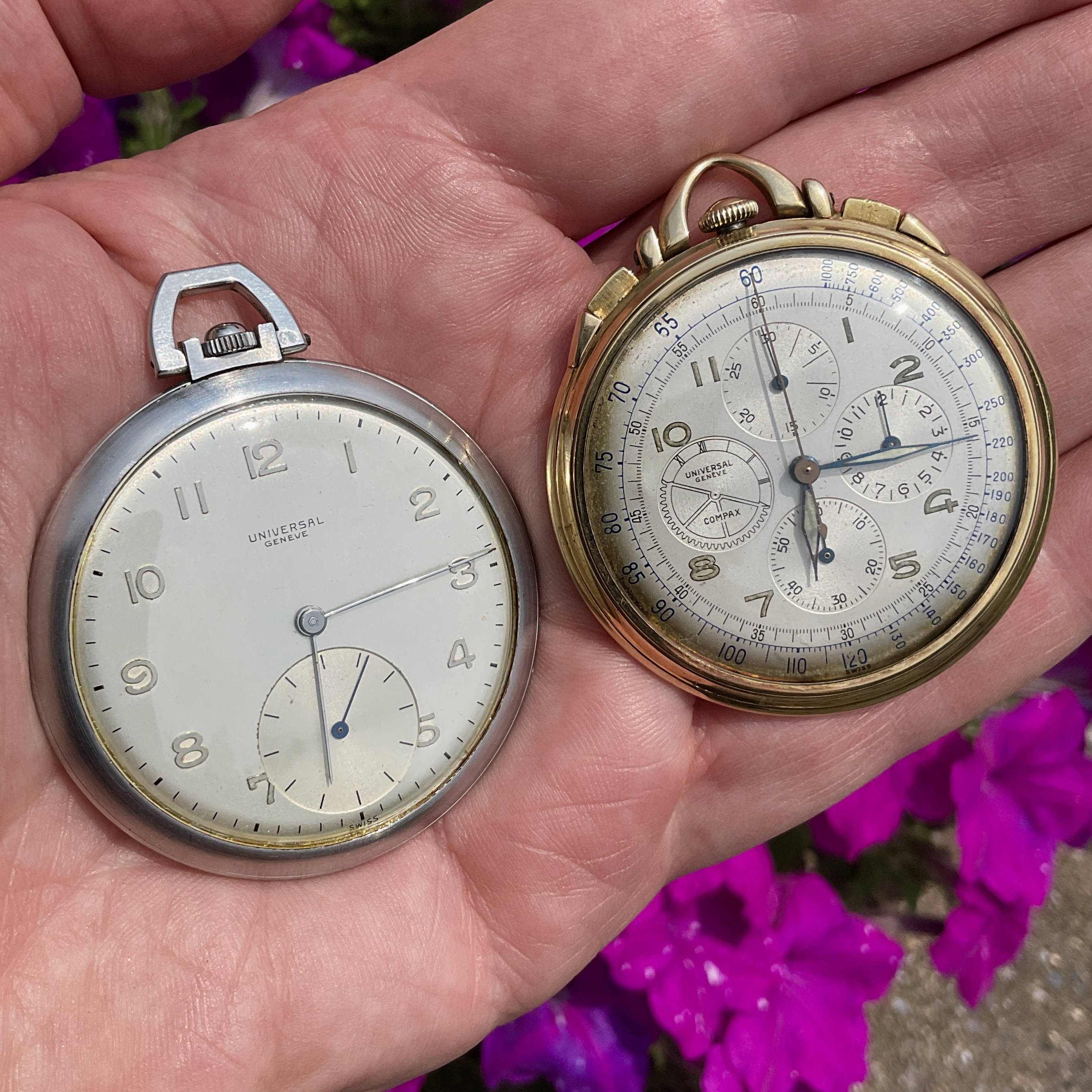Same recent visit with @dandywatchman that I recently posted about in the “Let’s See your Tri-Compax” thread. But here are our two Universal Geneve Pocket Compax Chronographs from the 1940s. Considering that a couple hundred of these might have ever been produced, at most, it was such a treat to get them side by side. His is the steel one. Mine the 14k gold.
